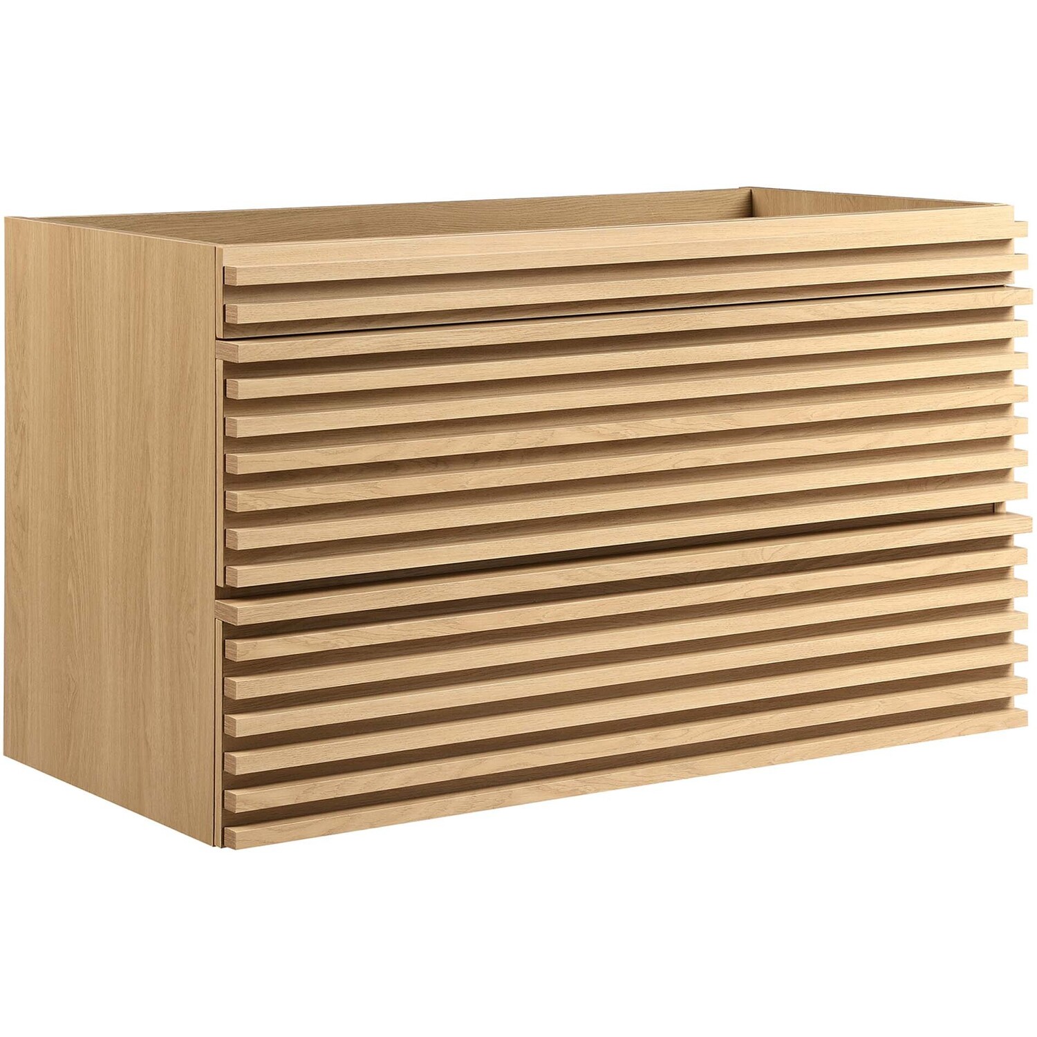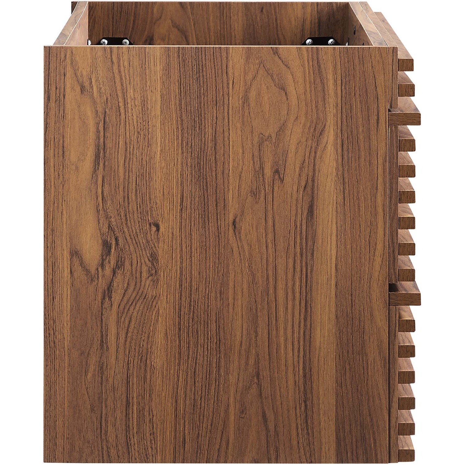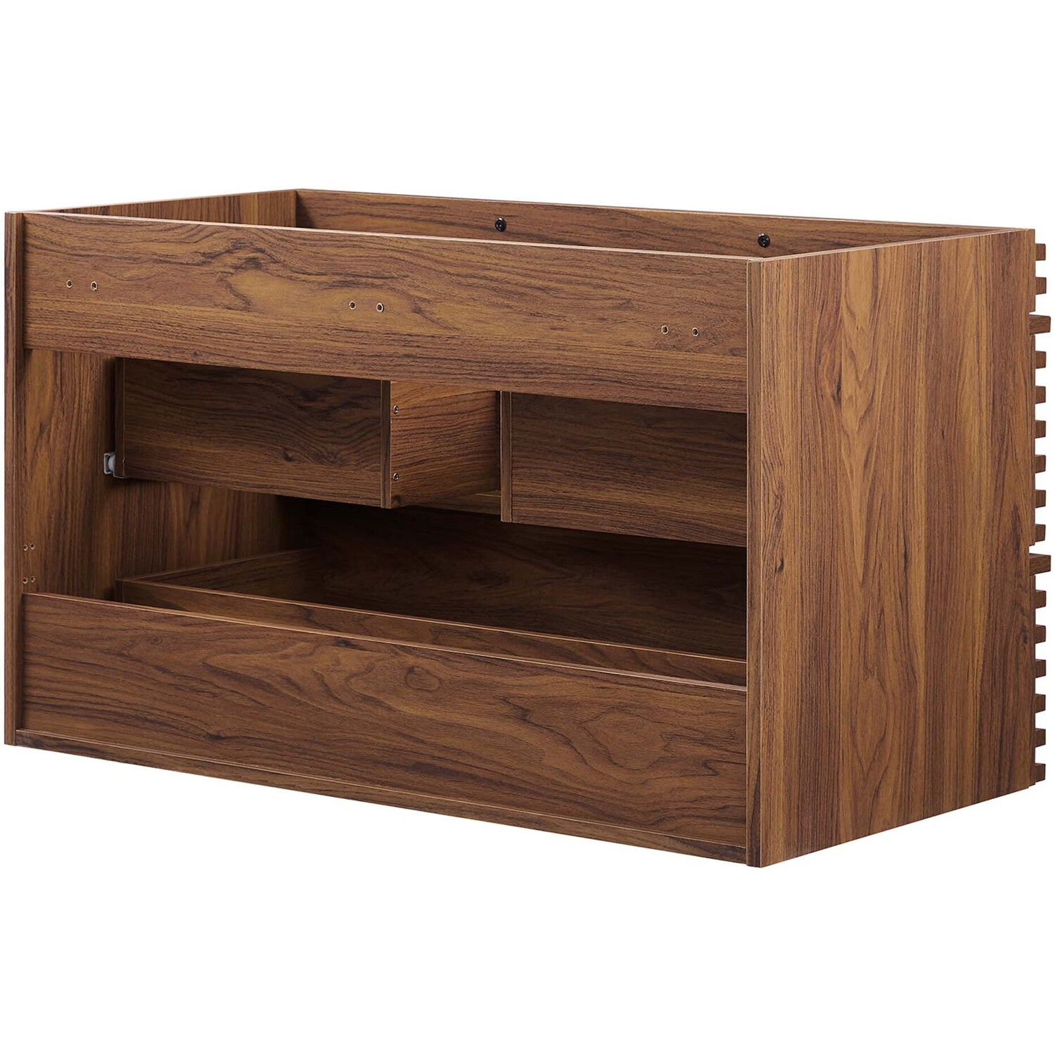 Tap into mid-century aesthetics with the Render Vanity. The Render 36" Bathroom Vanity features a durable MDF and particleboard frame with smooth walnut grain laminate, ample storage space in two full-extension drawers, and a space-saving wall-mount design with a drywall friendly mounting cleat. Clean lines and crisp design align for an edgy style designed to meet your needs. Boasting a mid-century modern style this vanity features a solid construction with a pleasing look and practical functionality. Assembly required and fixtures not included.Mid-Century Modern Vanity