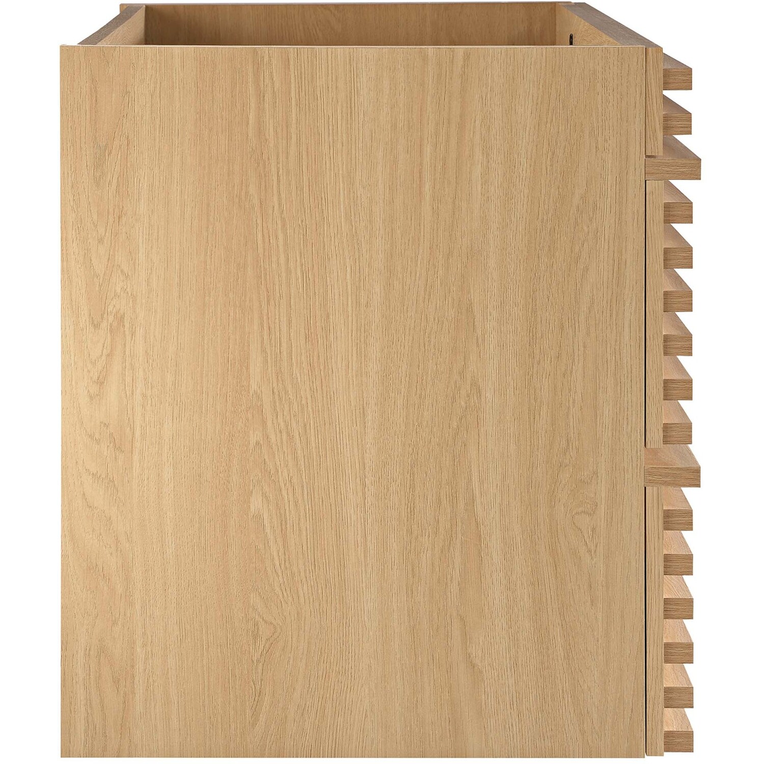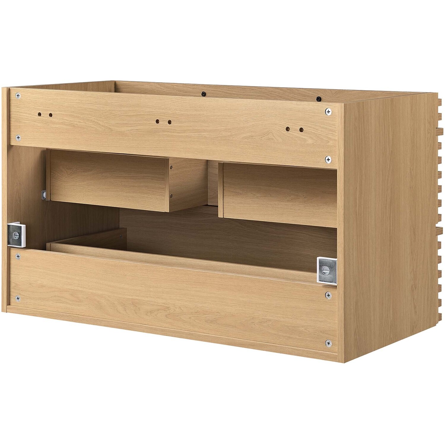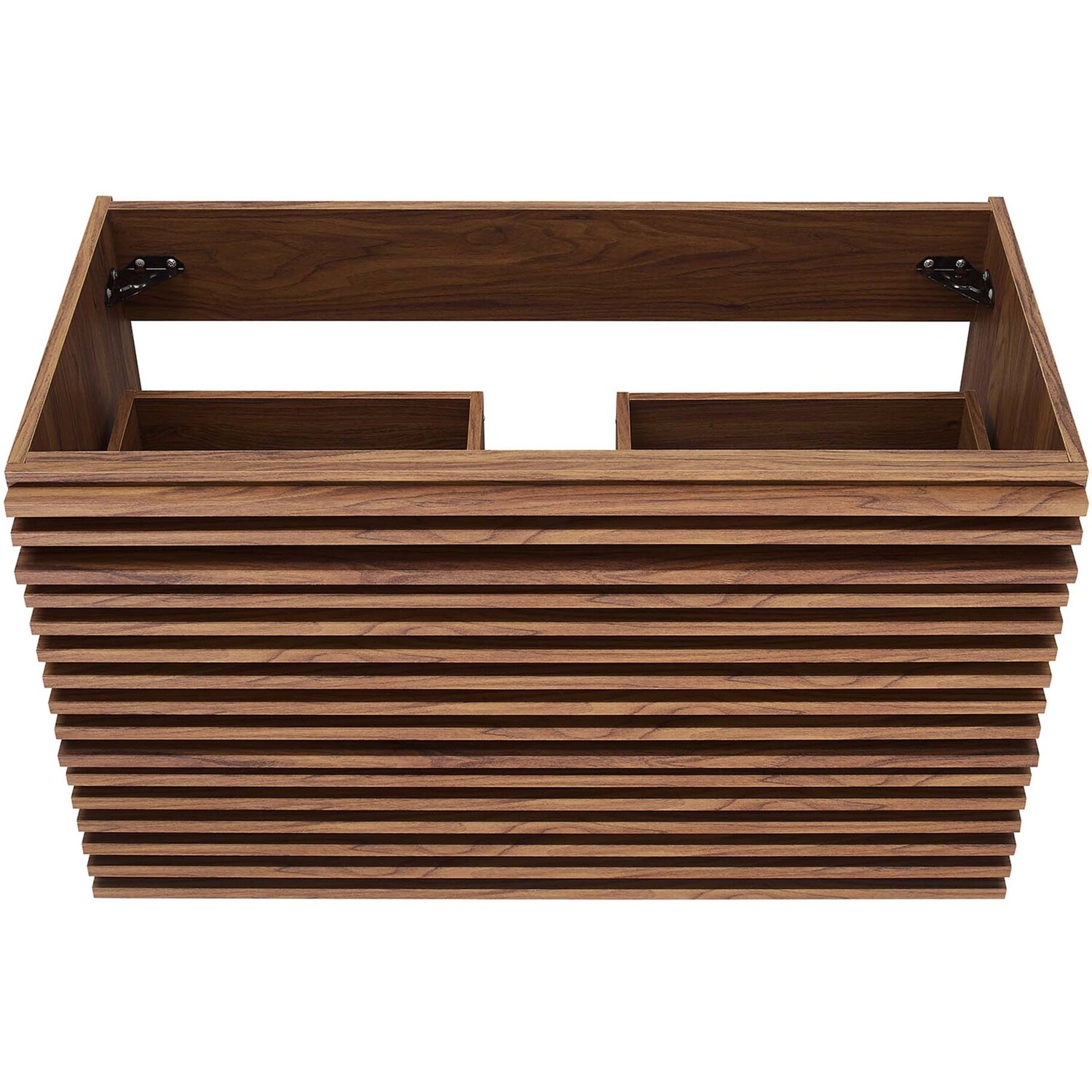 Tap into mid-century aesthetics with the Render Vanity. The Render 36" Bathroom Vanity features a durable MDF and particleboard frame with smooth walnut grain laminate, ample storage space in two full-extension drawers, and a space-saving wall-mount design with a drywall friendly mounting cleat. Clean lines and crisp design align for an edgy style designed to meet your needs. Boasting a mid-century modern style this vanity features a solid construction with a pleasing look and practical functionality. Assembly required and fixtures not included.Mid-Century Modern Vanity
