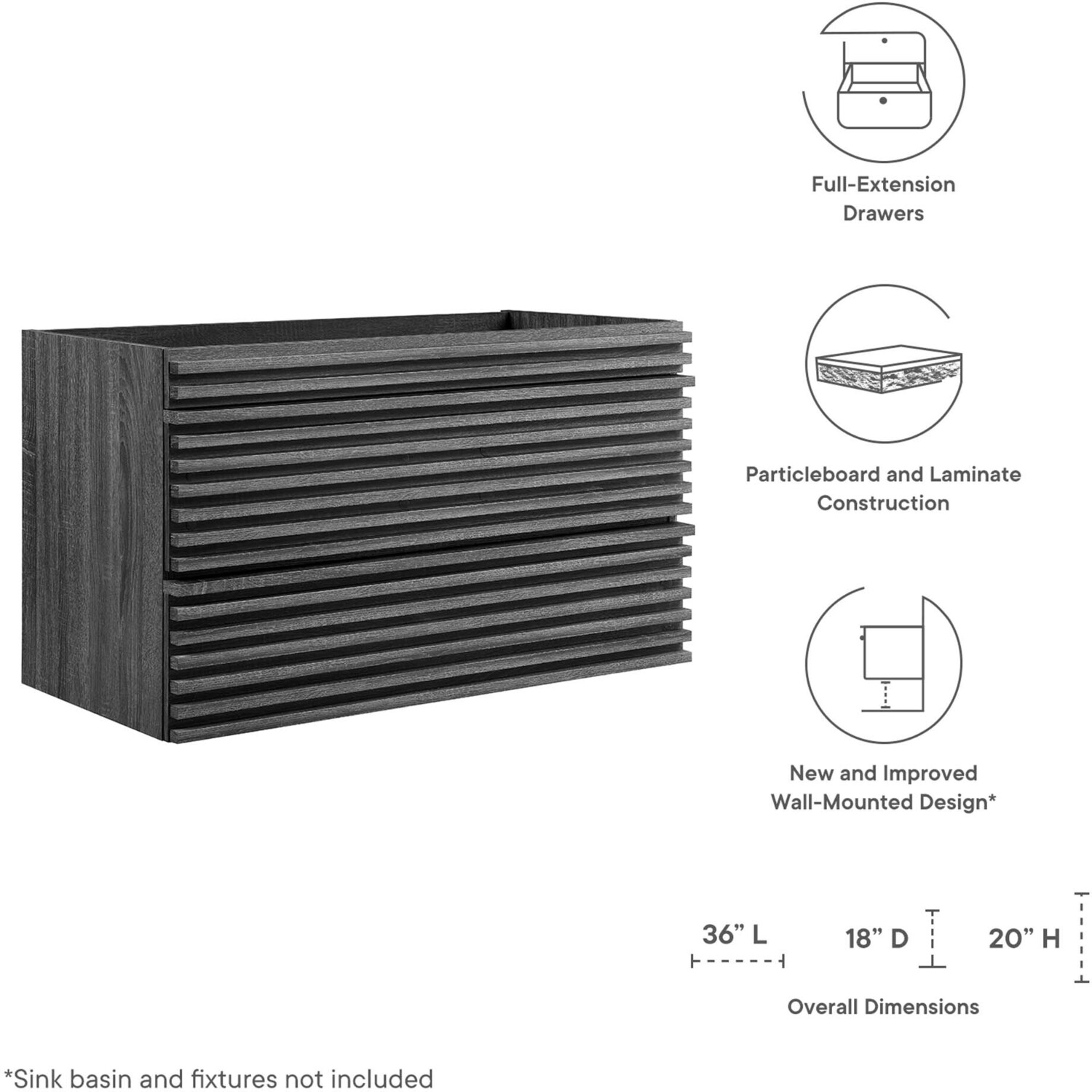 Sink Basin and Fixtures Not IncludedOne - Render 36" Wall-Mount Bathroom Vanity CabinetAssembly Required: YIs a Set: NStackable: NCountry: IndonesiaBox 1 x 1: 43"L x 20"W x 7"H