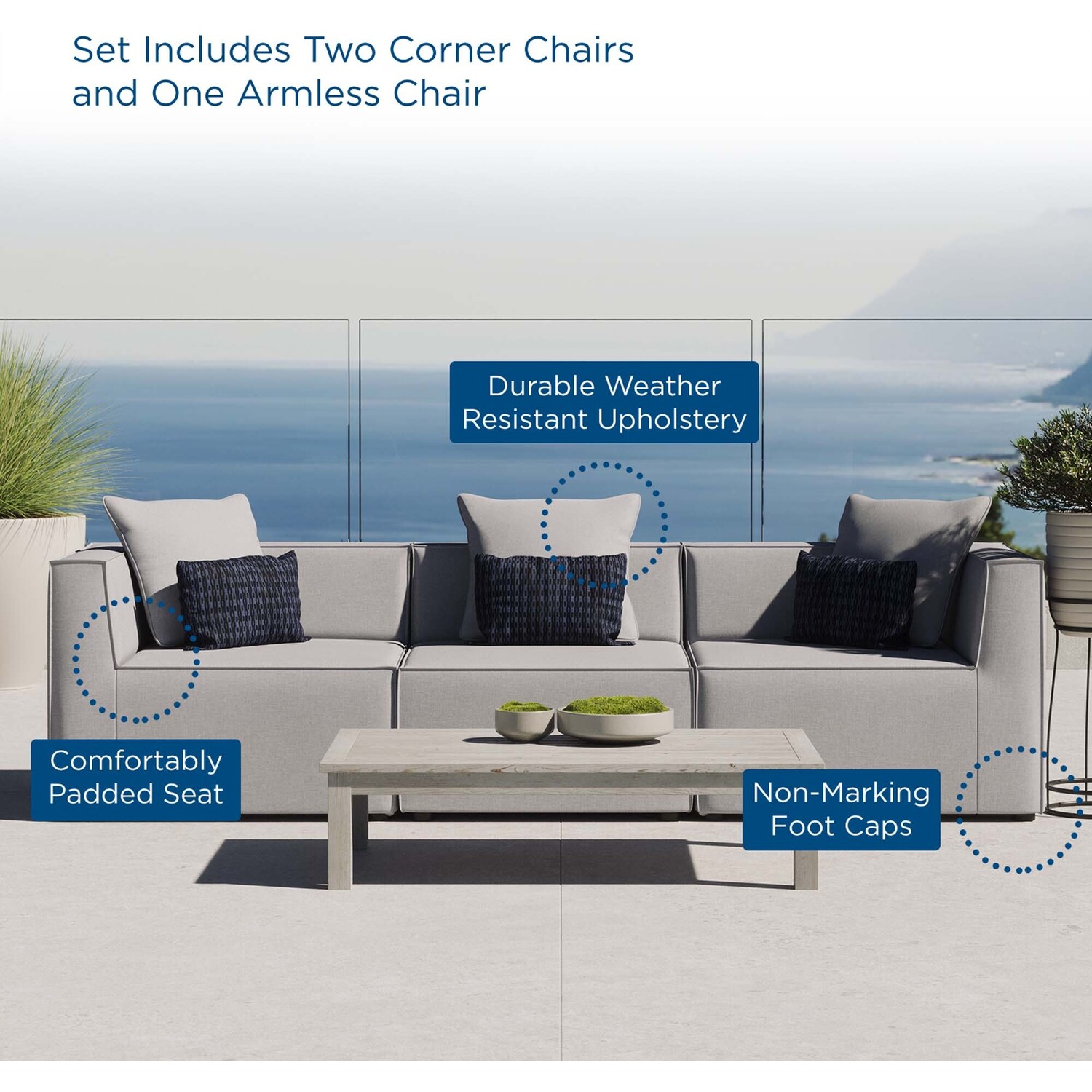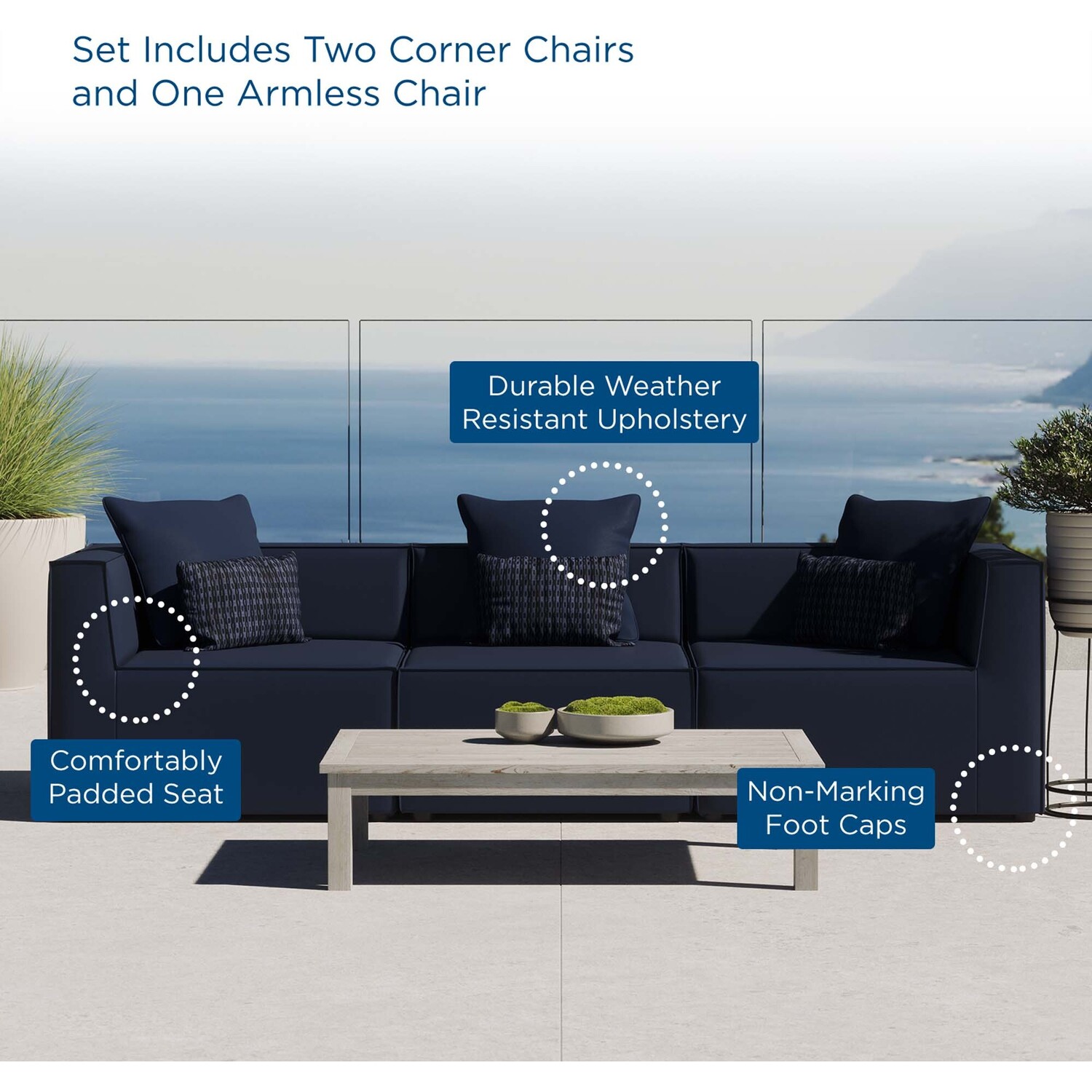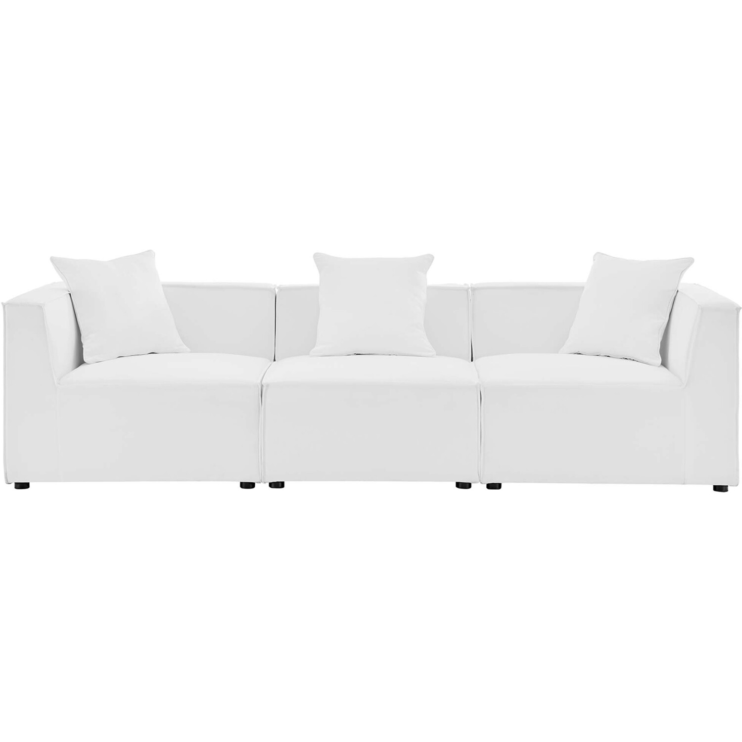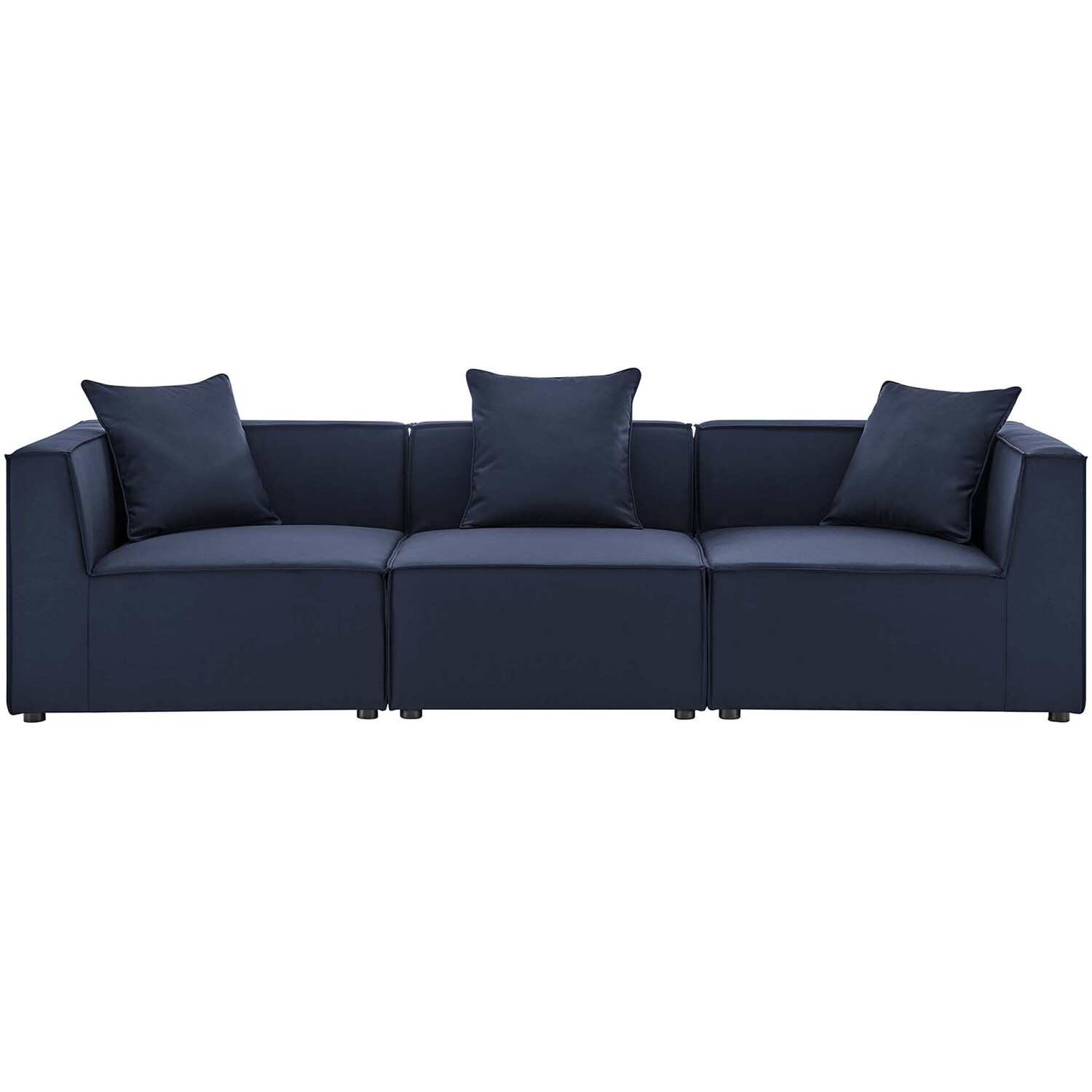 Bring relaxing comfort and modern style to your outdoor living space with the Outdoor Patio Saybrook Upholstered Sofa. Creating a custom seating area on your porch, deck, poolside, or patio, this all-weather patio sofa features a casual design accented by French piping details. This outdoor three-seater sofa is complete with water and UV-resistant fabric upholstery, dense foam padding, and a sturdy aluminum frame with non-marking foot caps. Enjoy good weather and al fresco entertaining with the Saybrook Outdoor Patio Sectional Sofa Collection. Weight Capacity of Each Piece: 300 lbs.Outdoor Patio Sofa