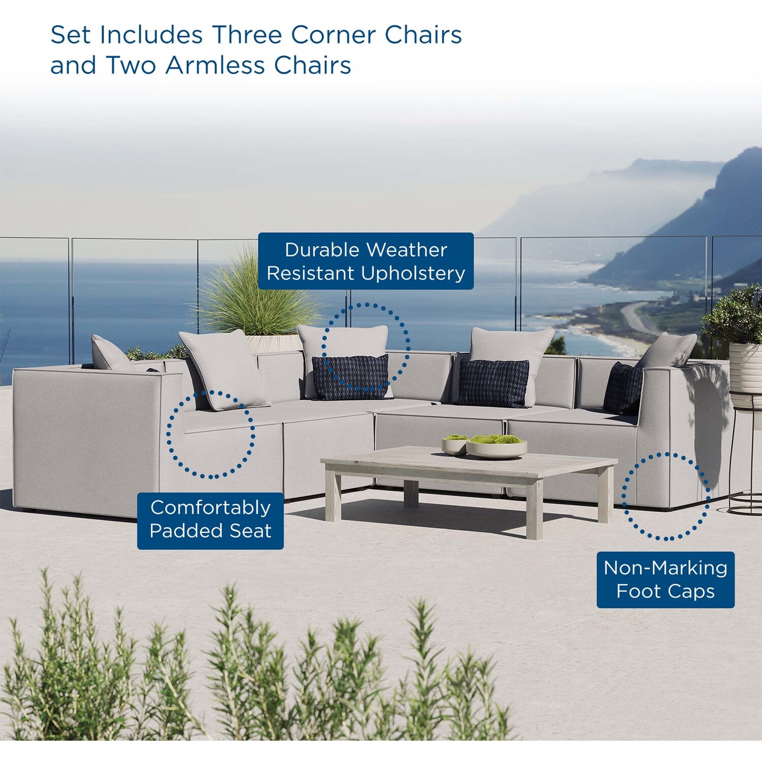 Bring relaxing comfort and modern style to your outdoor living space with the Outdoor Patio Saybrook Upholstered 5-Piece Sectional Sofa. Creating a custom seating area on your porch, deck, poolside, or patio, this all-weather patio sofa features a casual design accented by French piping details. This outdoor sectional sofa is complete with water and UV-resistant fabric upholstery, dense foam padding, and a sturdy aluminum frame with non-marking foot caps. Enjoy good weather and al fresco entertaining with the Saybrook Outdoor Patio Sectional Sofa Collection. Weight Capacity of Each Piece: 300 lbs.Outdoor Patio 5-Piece Sectional Sofa