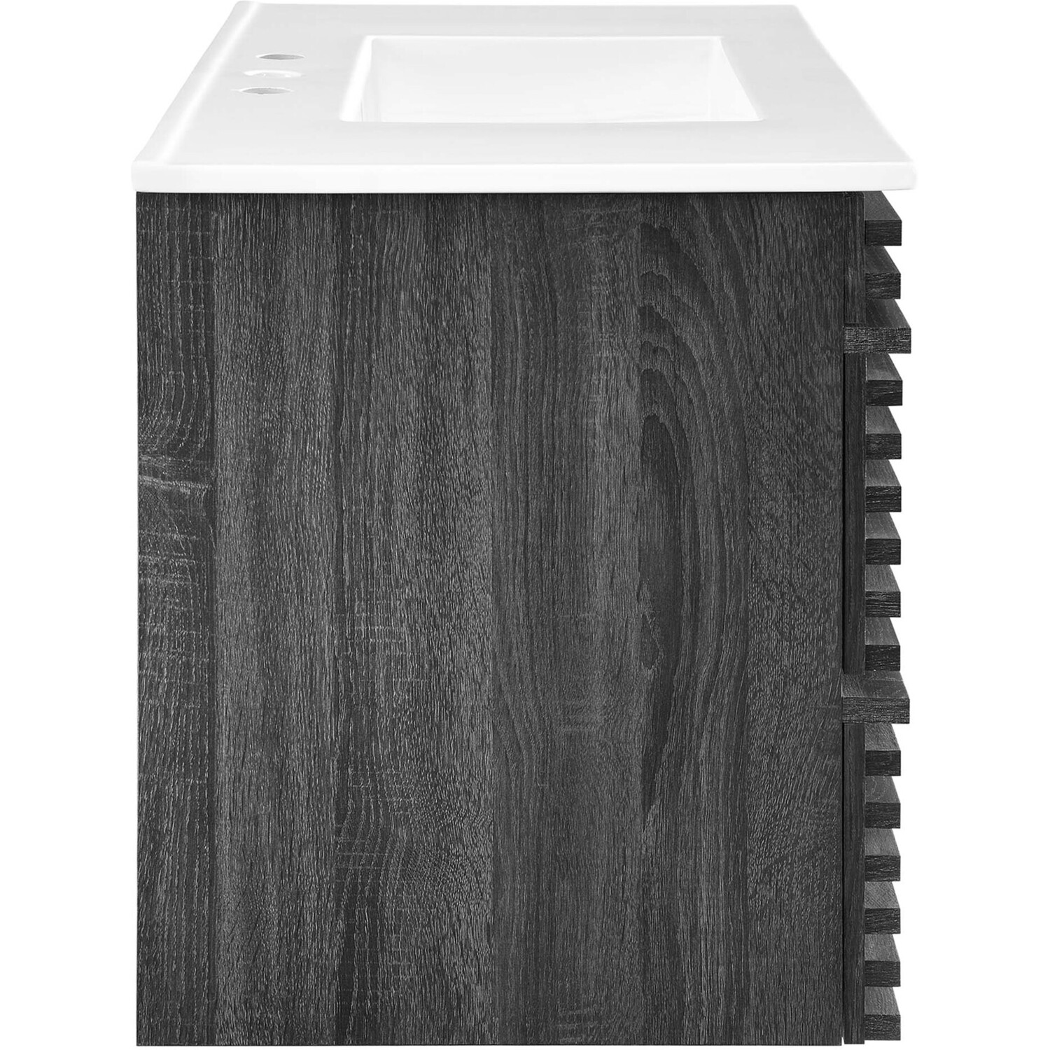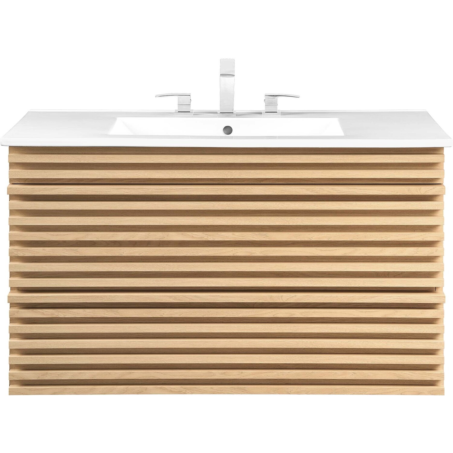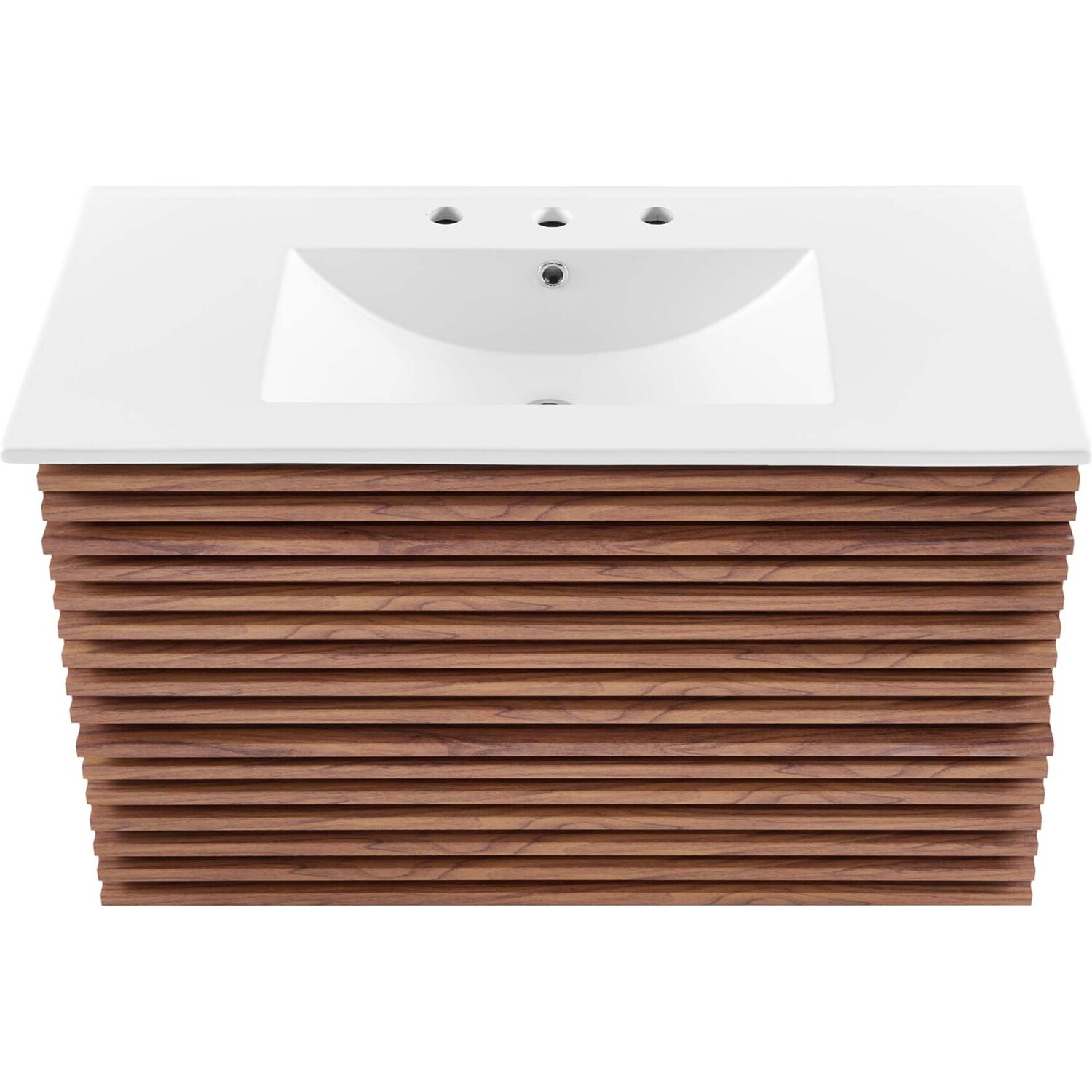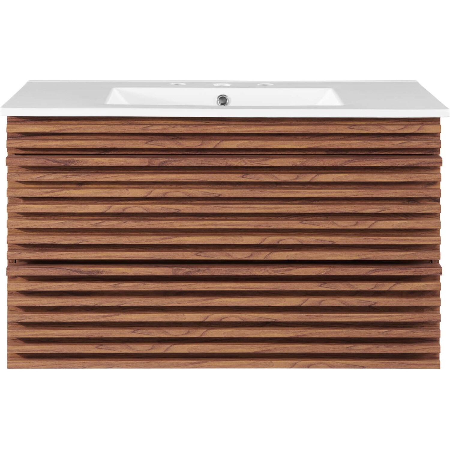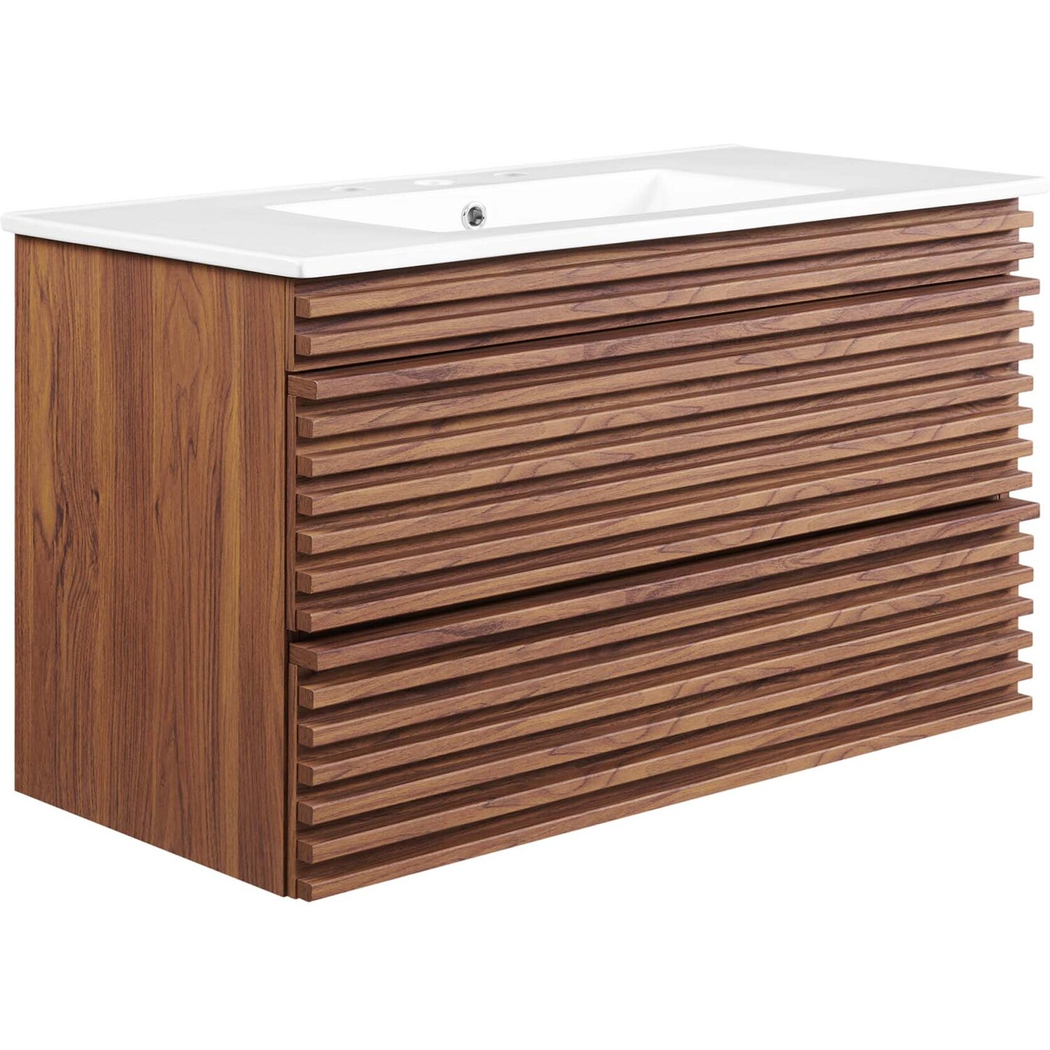 Tap into mid-century aesthetics with the Render Vanity. The Render 36" Bathroom Vanity features a durable MDF and particleboard frame with smooth walnut grain laminate, ample storage space in two full-extension drawers, and space-saving wall-mount design. Crafted with ceramic, a single sink with an integrated countertop, 8" widespread set, and rectangular sink basin continue the sleek look of this retro modern vanity. Clean lines and crisp design align for an edgy style designed to meet your needs. Boasting a mid-century modern style this vanity features a solid construction with a pleasing look and practical functionality. Assembly required and fixtures not included.Mid-Century Modern Vanity