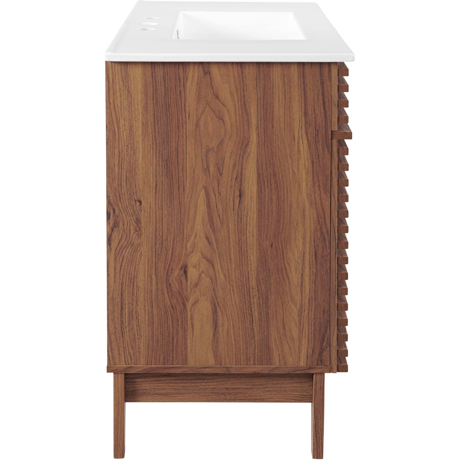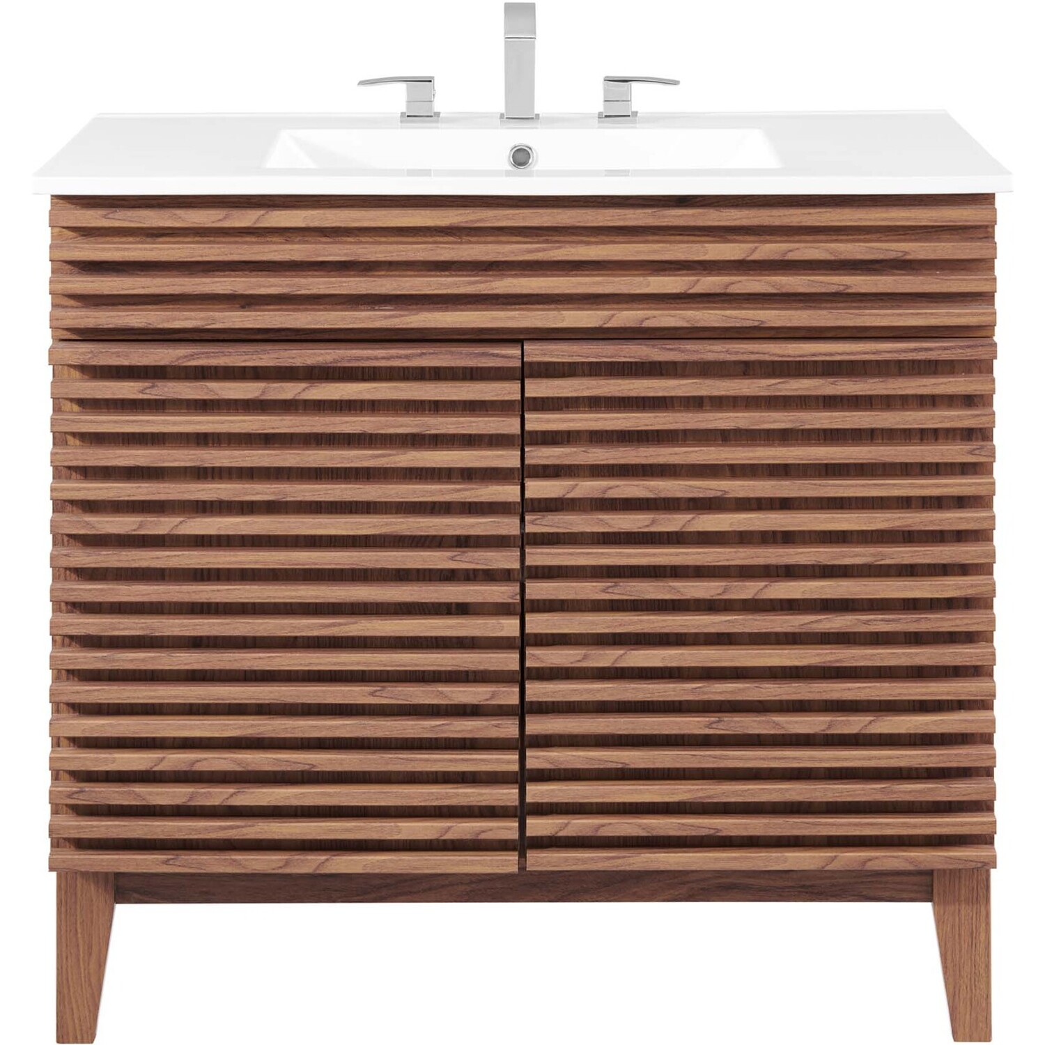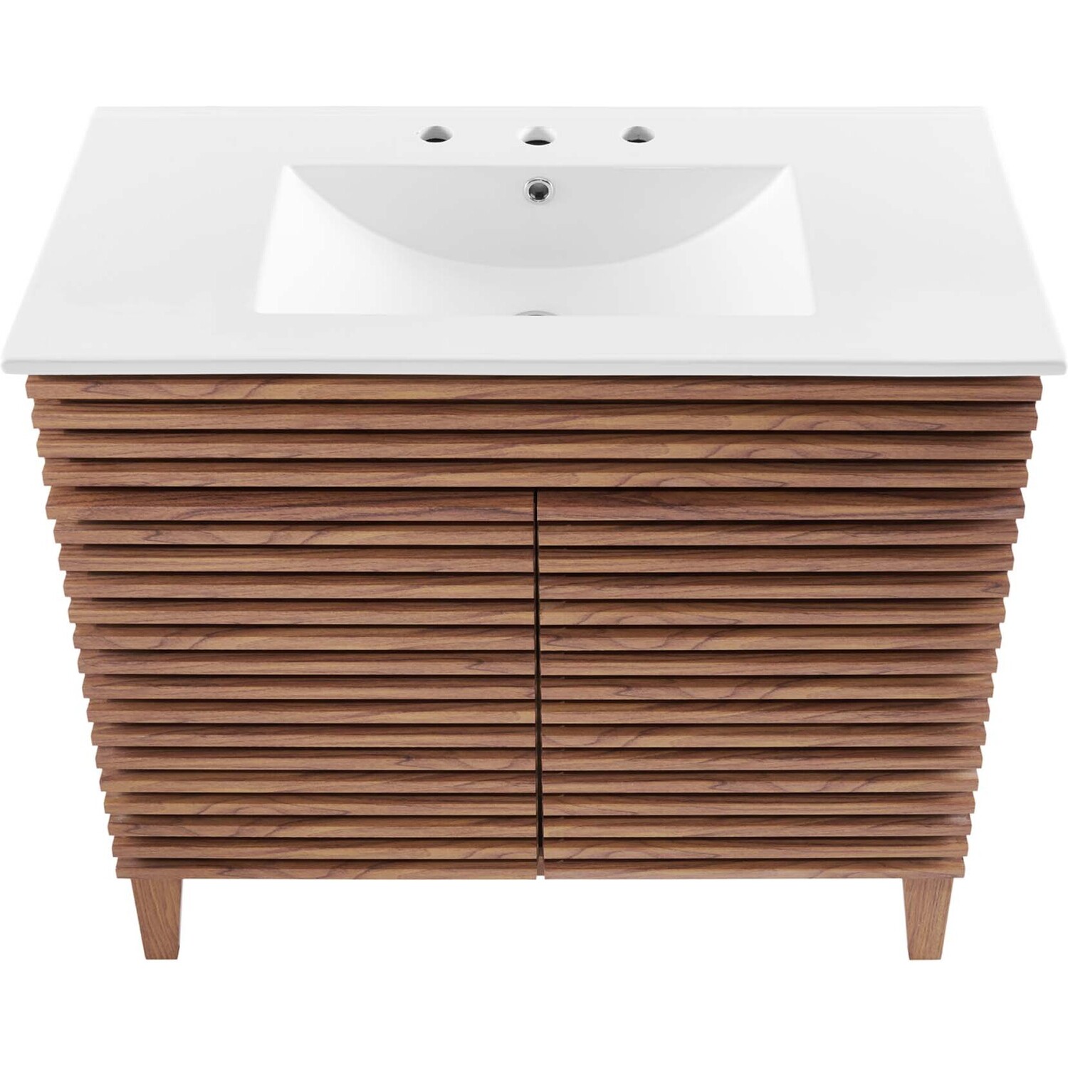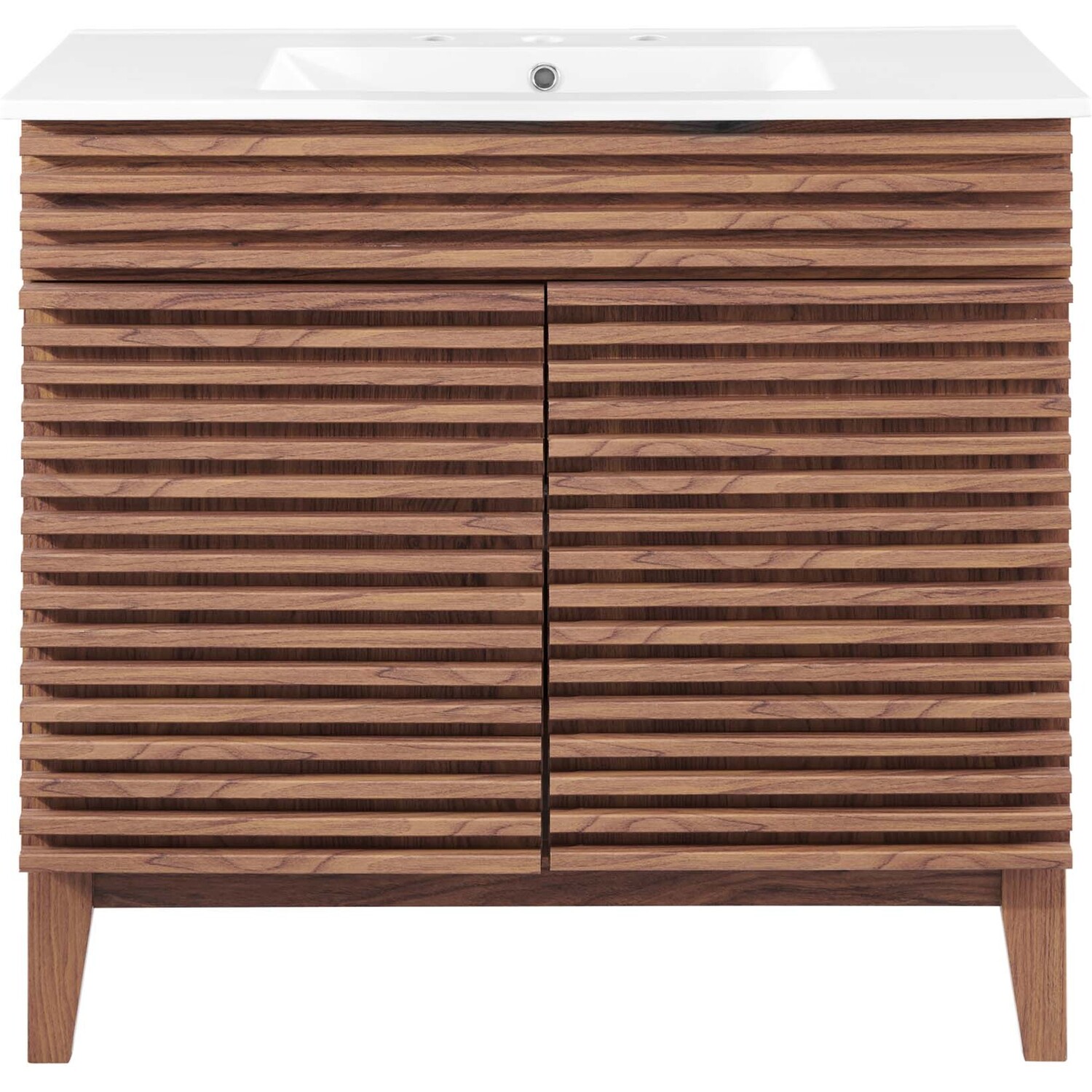 Tap into mid-century aesthetics with the Render Vanity. The Render 36" Bathroom Vanity features a durable MDF and particleboard frame with smooth walnut grain laminate, four tapered wood legs, and ample storage space behind two soft-close hinged doors. Crafted with ceramic, a single sink with an integrated countertop, 8" centerset, and rectangular sink basin continue the sleek look of this retro modern vanity. Clean lines and crisp design align for an edgy style designed to meet your needs. Boasting a mid-century modern style this vanity features a solid construction with a pleasing look and practical functionality. Assembly required and fixtures not included.Mid-Century Modern Vanity