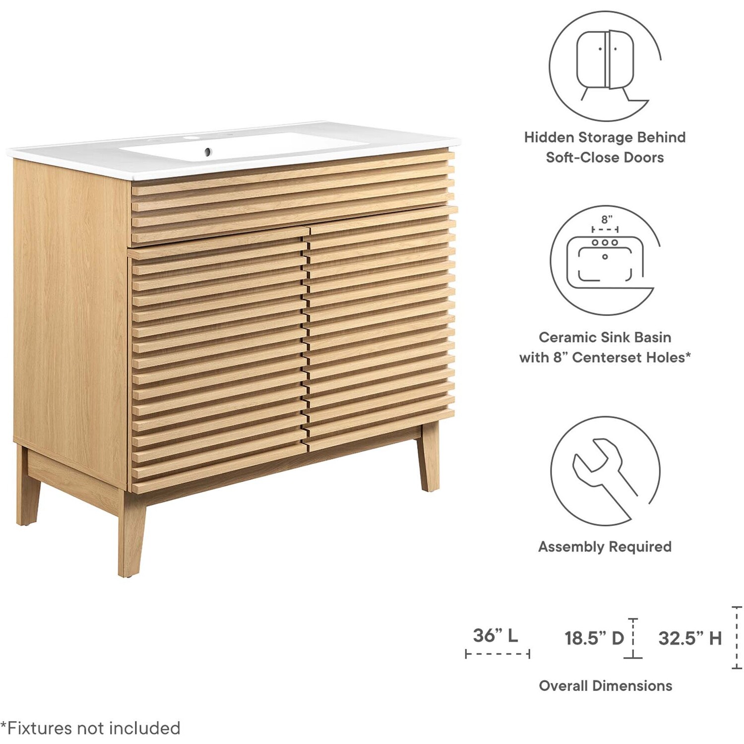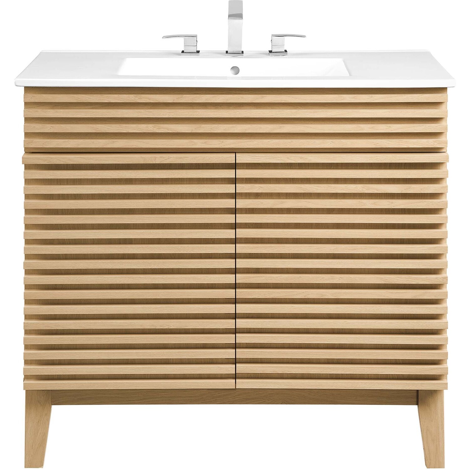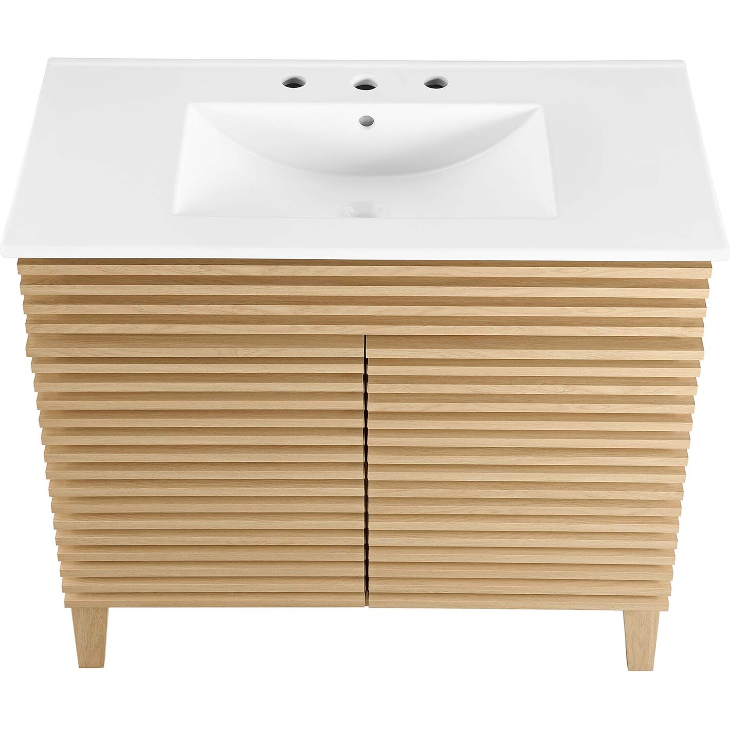 Tap into mid-century aesthetics with the Render Vanity. The Render 36" Bathroom Vanity features a durable MDF and particleboard frame with smooth walnut grain laminate, four tapered wood legs, and ample storage space behind two soft-close hinged doors. Crafted with ceramic, a single sink with an integrated countertop, 8" centerset, and rectangular sink basin continue the sleek look of this retro modern vanity. Clean lines and crisp design align for an edgy style designed to meet your needs. Boasting a mid-century modern style this vanity features a solid construction with a pleasing look and practical functionality. Assembly required and fixtures not included.Mid-Century Modern Vanity