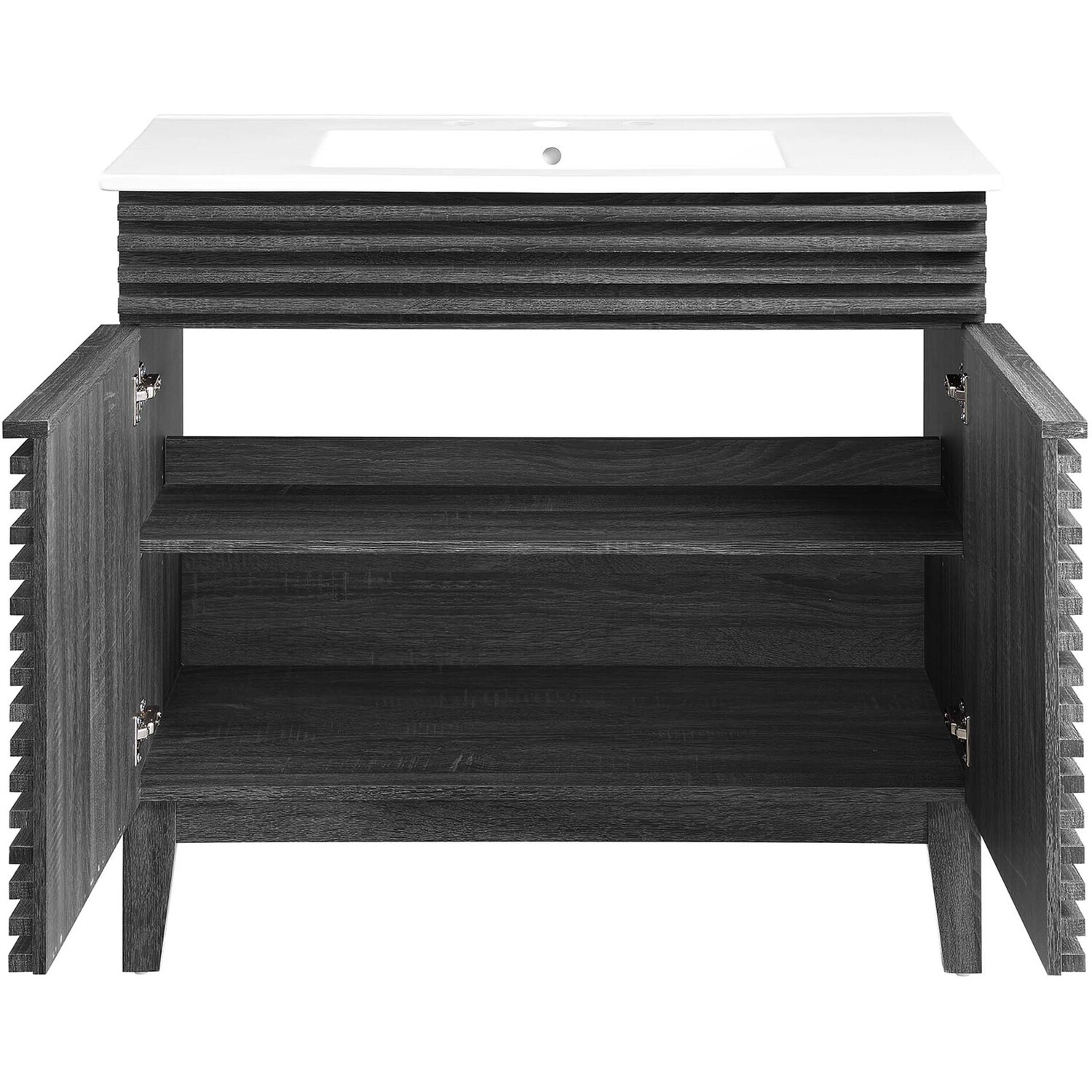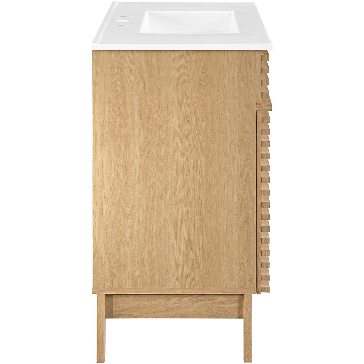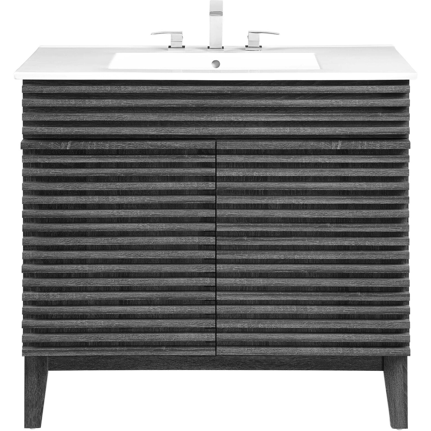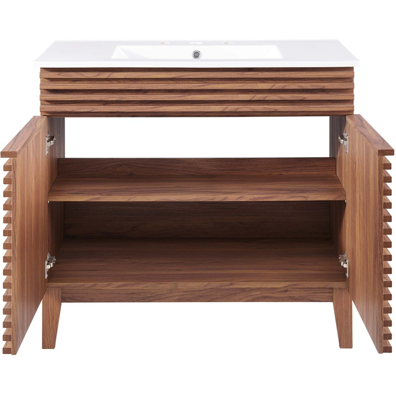 Tap into mid-century aesthetics with the Render Vanity. The Render 36" Bathroom Vanity features a durable MDF and particleboard frame with smooth walnut grain laminate, four tapered wood legs, and ample storage space behind two soft-close hinged doors. Crafted with ceramic, a single sink with an integrated countertop, 8" centerset, and rectangular sink basin continue the sleek look of this retro modern vanity. Clean lines and crisp design align for an edgy style designed to meet your needs. Boasting a mid-century modern style this vanity features a solid construction with a pleasing look and practical functionality. Assembly required and fixtures not included.Mid-Century Modern Vanity