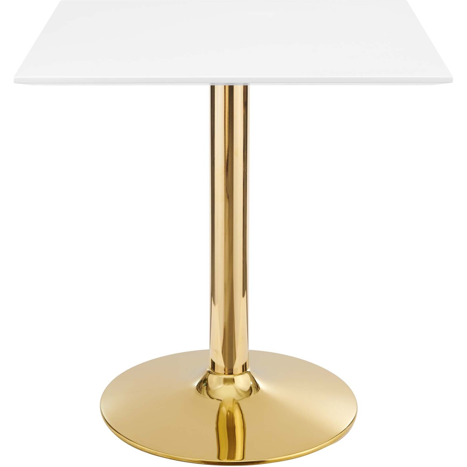 Gather family and friends for good food and conversation around the Verne Dining Table. Bringing modern influence and mid-century inspiration to your dining space, this pedestal table reflects a square shape. Perfect for entertaining or everyday dining, this dining table rests on a polished gold metal pedestal base and features a 28" square tabletop crafted with MDF and an easy-to-clean white finish. A non-marking ring around the base protects flooring. Assembly required.Modern Dining Table