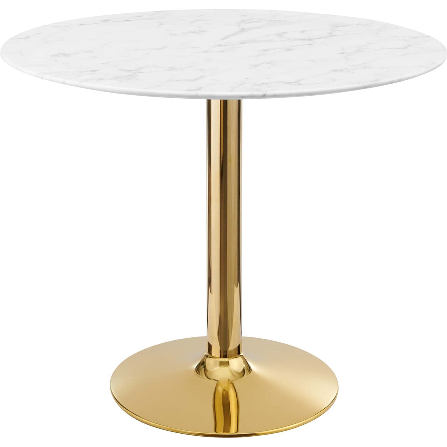 Gather family and friends for good food and conversation around the Verne Dining Table. Bringing modern influence and mid-century inspiration to your dining space, this pedestal table reflects an organic shape. Perfect for entertaining or everyday dining, this dining table rests on a polished gold metal pedestal base and features a 35" artificial marble tabletop with an easy-to-clean, scratch-resistant finish. Includes non-marking ring to protect flooring. Assembly required.Modern Dining Table