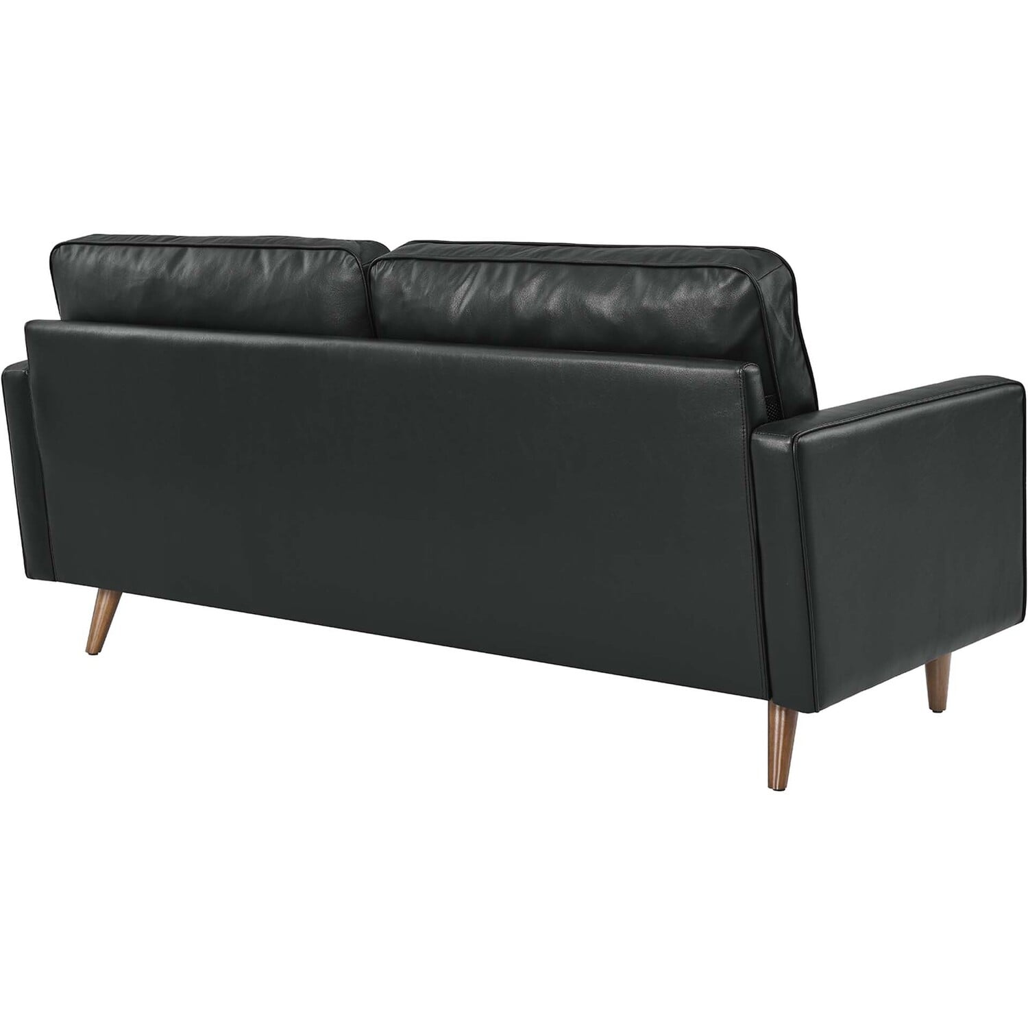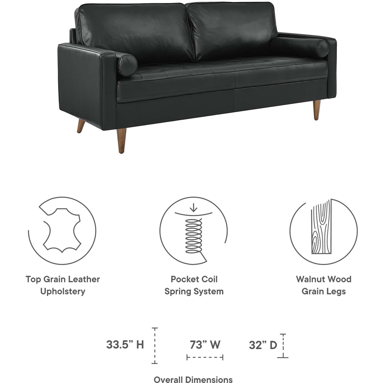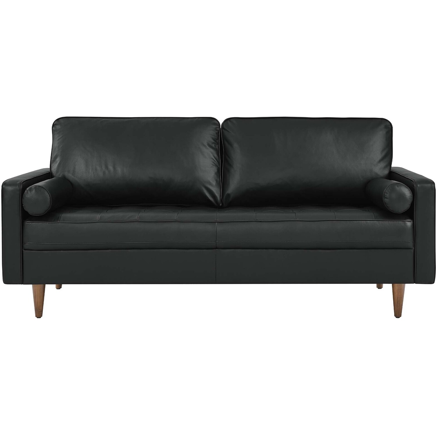 Update your home or apartment with the mid-century style and modern-day convenience of Valour. This comfortable small living sofa features a tailored profile with elegant biscuit tufting and two bolster pillows. Covered in beautiful top grain leather upholstery, this sofa has dense foam padding, an innerspring pocket structure, and sinuous spring support for a comprehensive seating experience that fits perfectly into apartment settings. This luxe modern sofa comes with walnut-stained wood legs with non-marking foot caps and supports up to 600 lbs. Say goodbye to the days of hauling heavy furniture. This tufted apartment sofa ships in a portable box for easy maneuvering.Mid-Century Modern Apartment Sofa