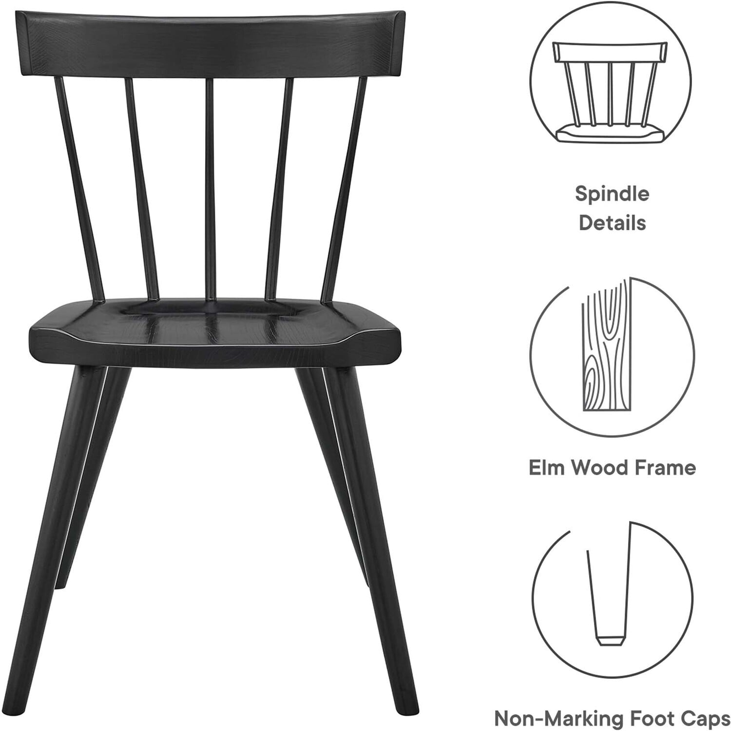 Complement a wide variety of color schemes and decor styles in your dining space with the Sutter Wood Dining Side Chair. Crafted with durable elm wood, this dining chair features thin spindles and a charming tapered silhouette that brings modern farmhouse style to your dining table. Splayed dowel wood legs with non-marking caps support this versatile chair that also serves as a beautiful accent chair in a living space, bedroom, or office.Modern Farmhouse Dining Chair