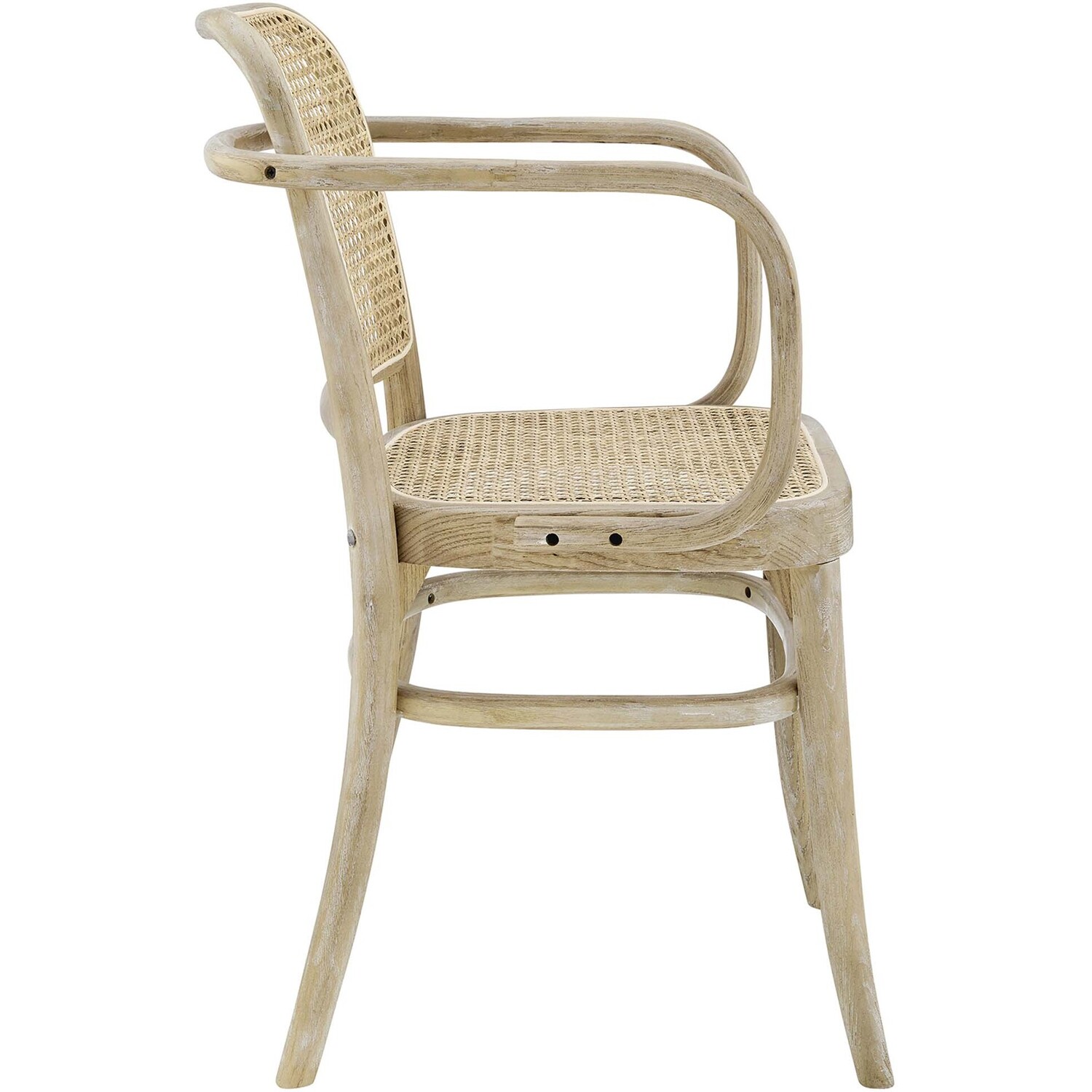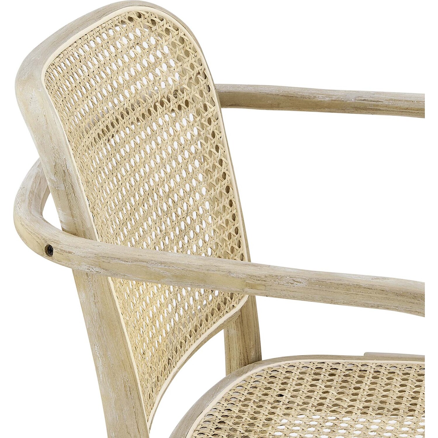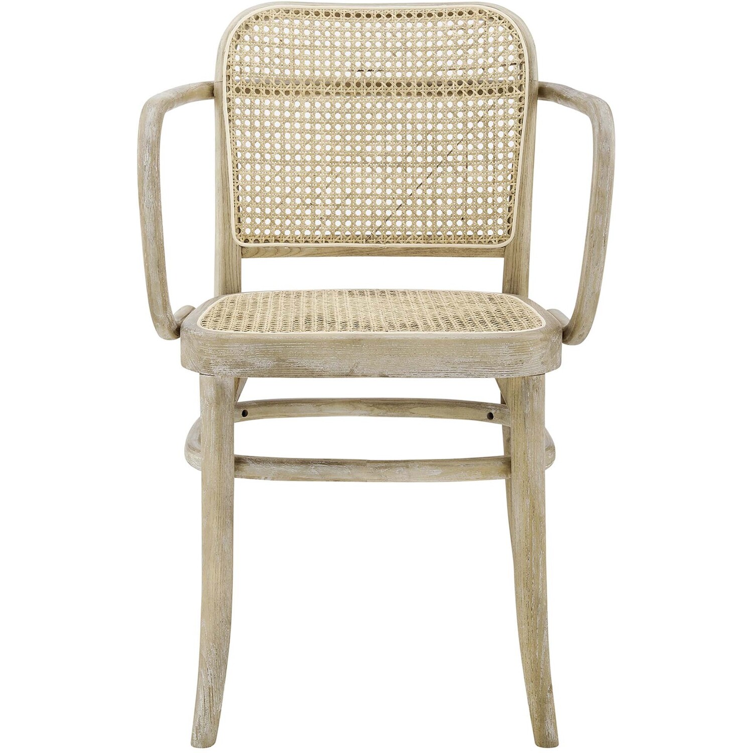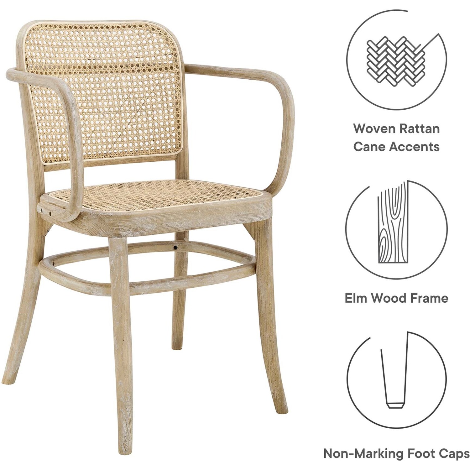 Blending rustic farmhouse charm and coastal serenity in your dining space with the Winona Dining Chair. Featuring a woven rattan cane backrest and seat, this dining chair instills vintage modernity around your dining table or as an accent chair in your living space. This dining armchair is complete with a durable elm wood frame with rounded edges and armrests. Includes non-marking foot caps. Weight Capacity: 330 lbs.Modern Farmhouse Dining Chair