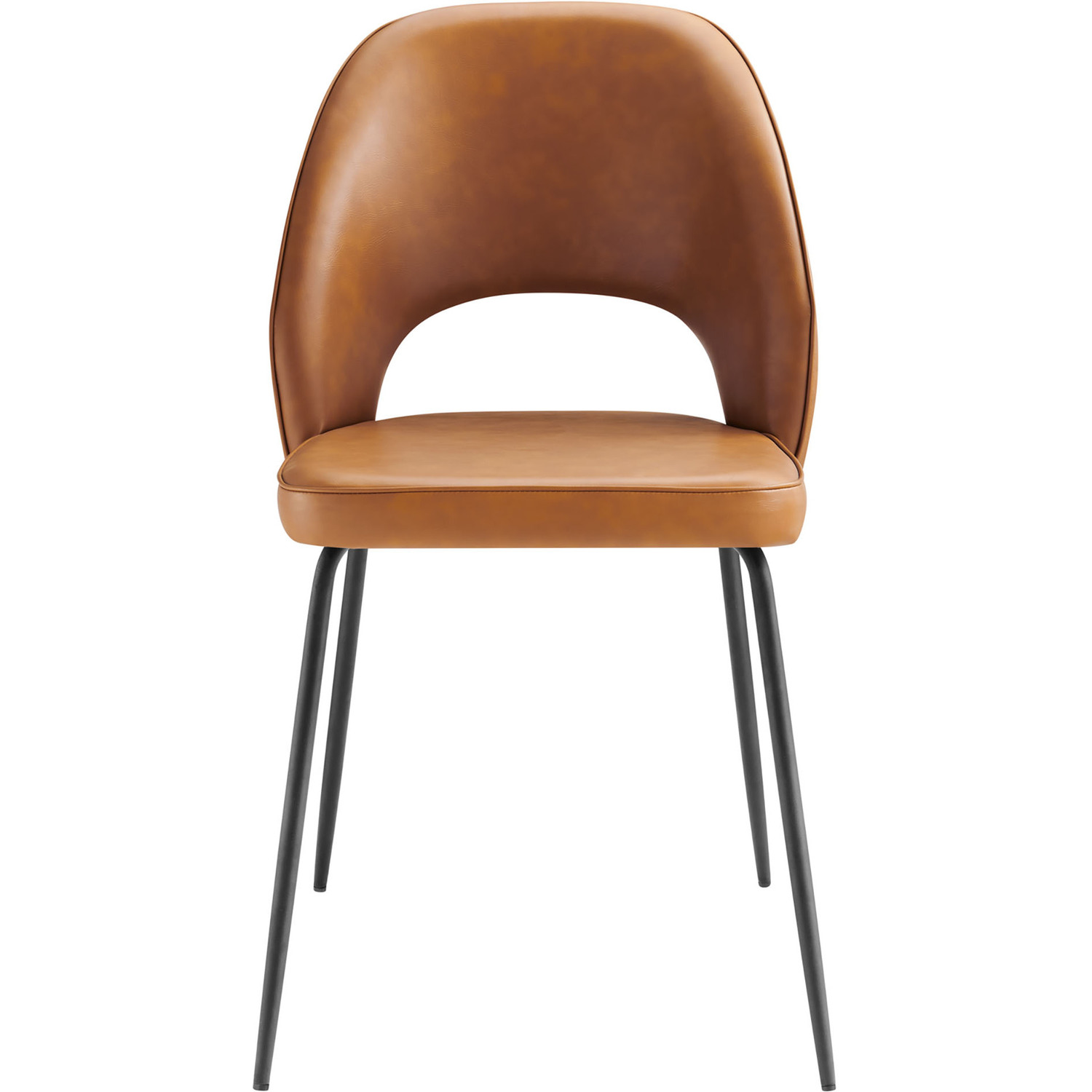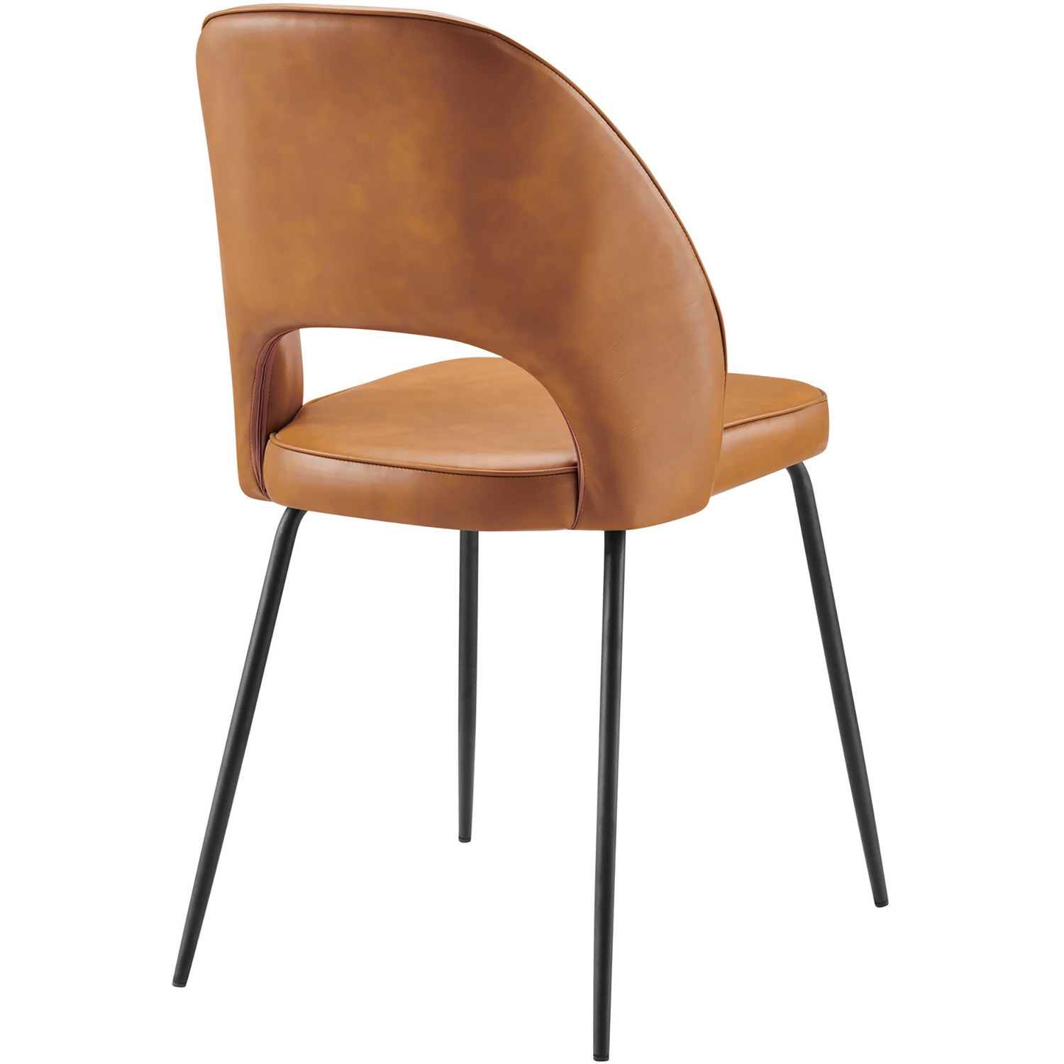 The slim profile of the Nico Vegan Leather Dining Chair Set of Two fits blissfully with your modern, minimalist, or contemporary decor. This set of two vegan leather side chairs features a joyous fusion of shape and space for an artful, retro-inspired presentation at your dining table or intriguing accent in your living room or hallway. The durable vegan leather and open back inject verve and artistry. Your guests will revel in the comfort of dense foam padding. The Nico Vegan Leather Dining Chair Set serves a pinch of pizazz around your dining table with a minimalist black metal frame. Chair legs have non-marking foot pins.Retro Modern Dining Chairs
