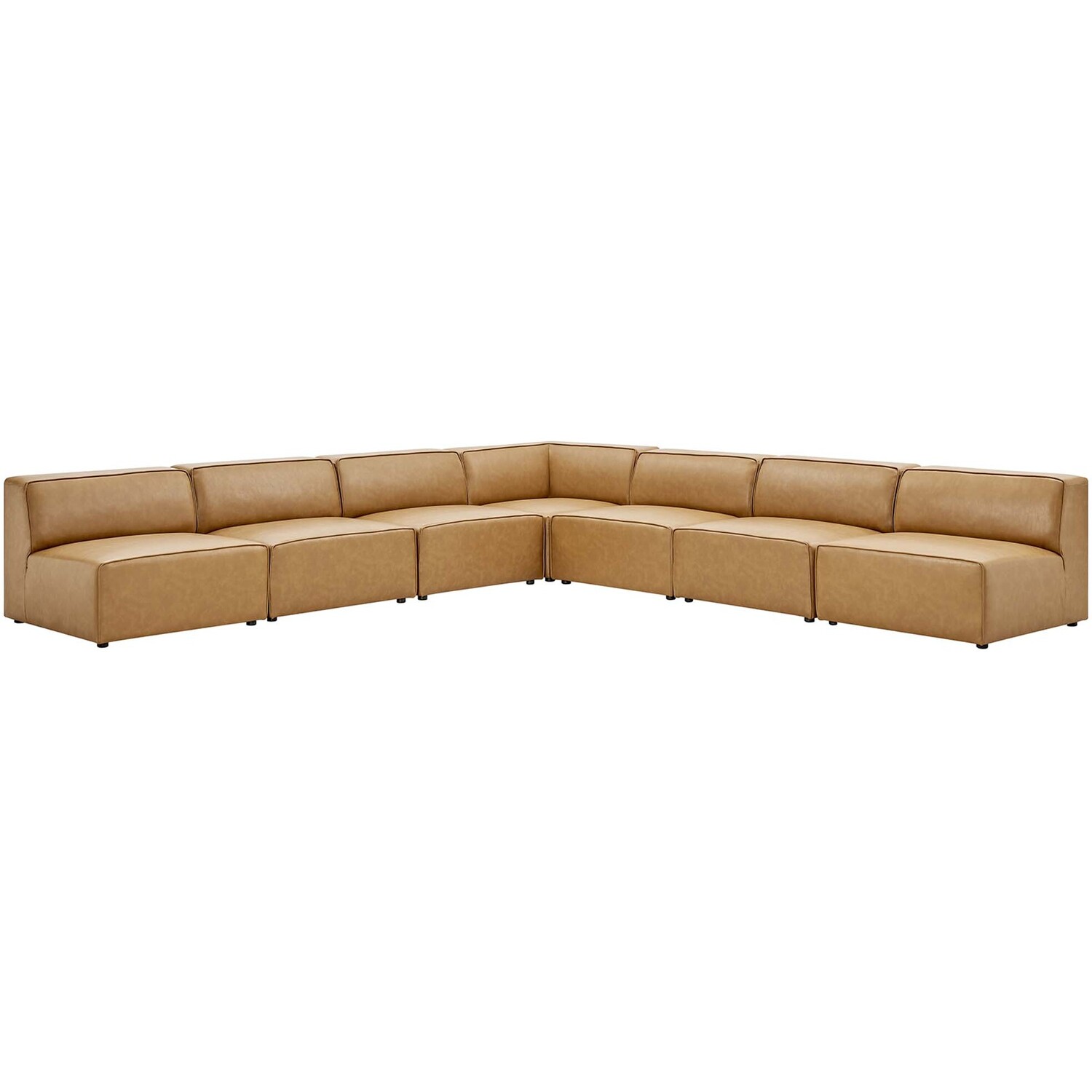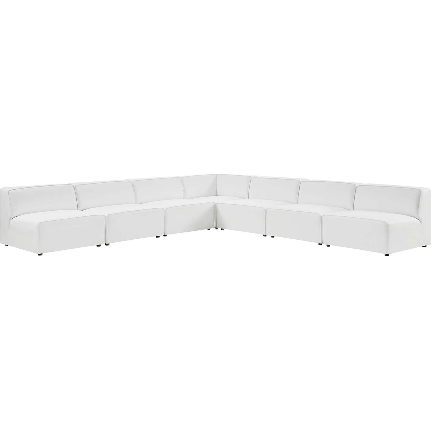 Kick back and relax with the Mingle Vegan Leather 7-Piece Sectional Sofa. Designed to wash away the hindrances that obstruct visual space, this sectional sofa set comes expansively designed with generous seating and dense foam padding that allows for just the right amount of giving. Mingle easily positions according to the needs of the moment and features rich vegan leather upholstery with elegant piping and plastic legs for steady support. Host animated living or lounge room get-togethers with a modular sectional sofa seating assortment perfect for contemporary modern décors. Set Includes: 1 Corner Chair, 6 Armless Chairs7-Piece Sectional Sofa