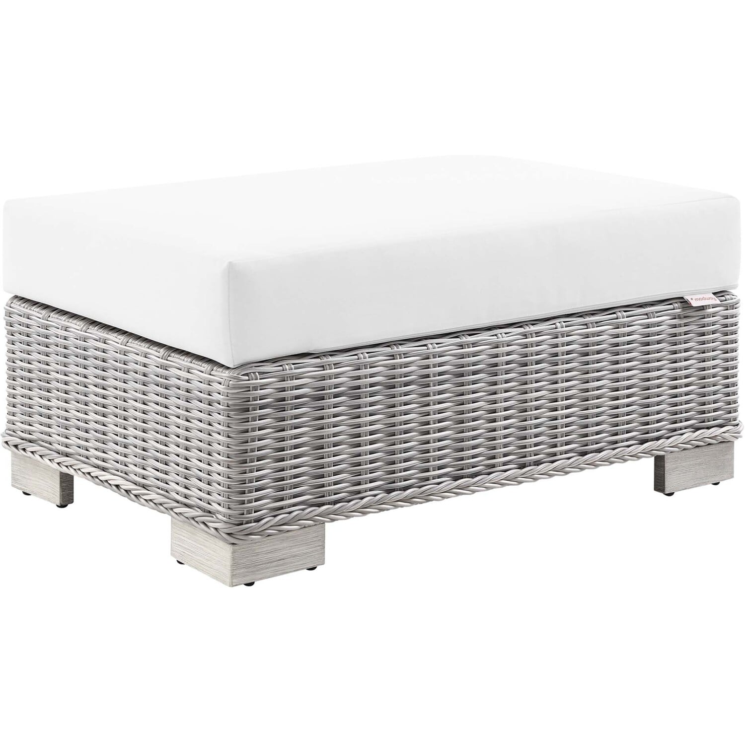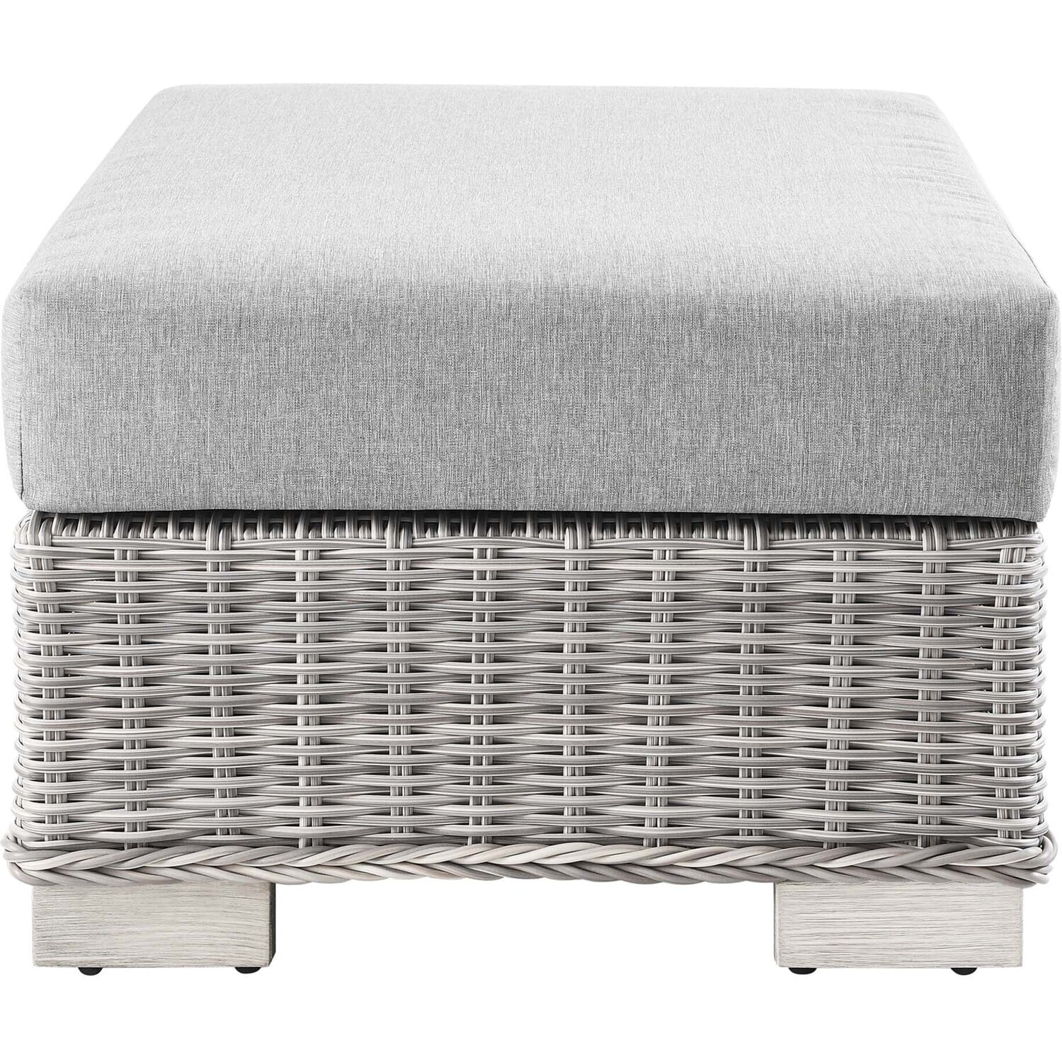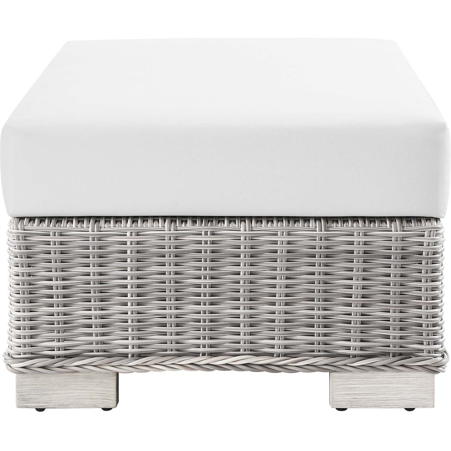 Enjoy fresh air and alfresco relaxation with the Conway Outdoor Patio Wicker Rattan Ottoman. Wrapped in UV-resistant light gray synthetic wicker rattan, this patio ottoman boasts organic texture and a neutral hue that brings a calming presence to your outdoor space. The frame of this outdoor ottoman is crafted with durable powder-coated aluminum and rests on L-shaped legs with plastic foot glides. A thick foam padded cushion covered with a removable, water-resistant polyester cover offers a comfortable seat and affixes securely to the ottoman with a cord tension attachment. Trending aesthetics and a classic design define this outdoor patio furniture collection making it a beautiful addition to any outdoor space including the backyard, patio, porch, balcony, or poolside. Assembly required. Patio Ottoman Weight Capacity: 300 lbs.Outdoor Patio Ottoman