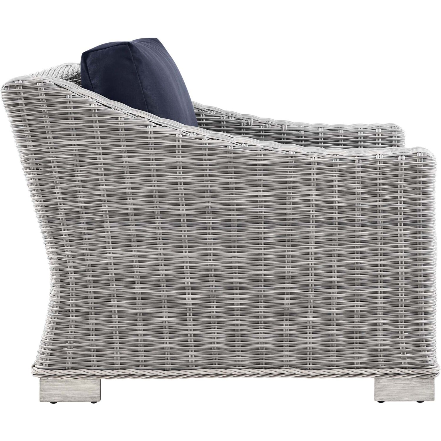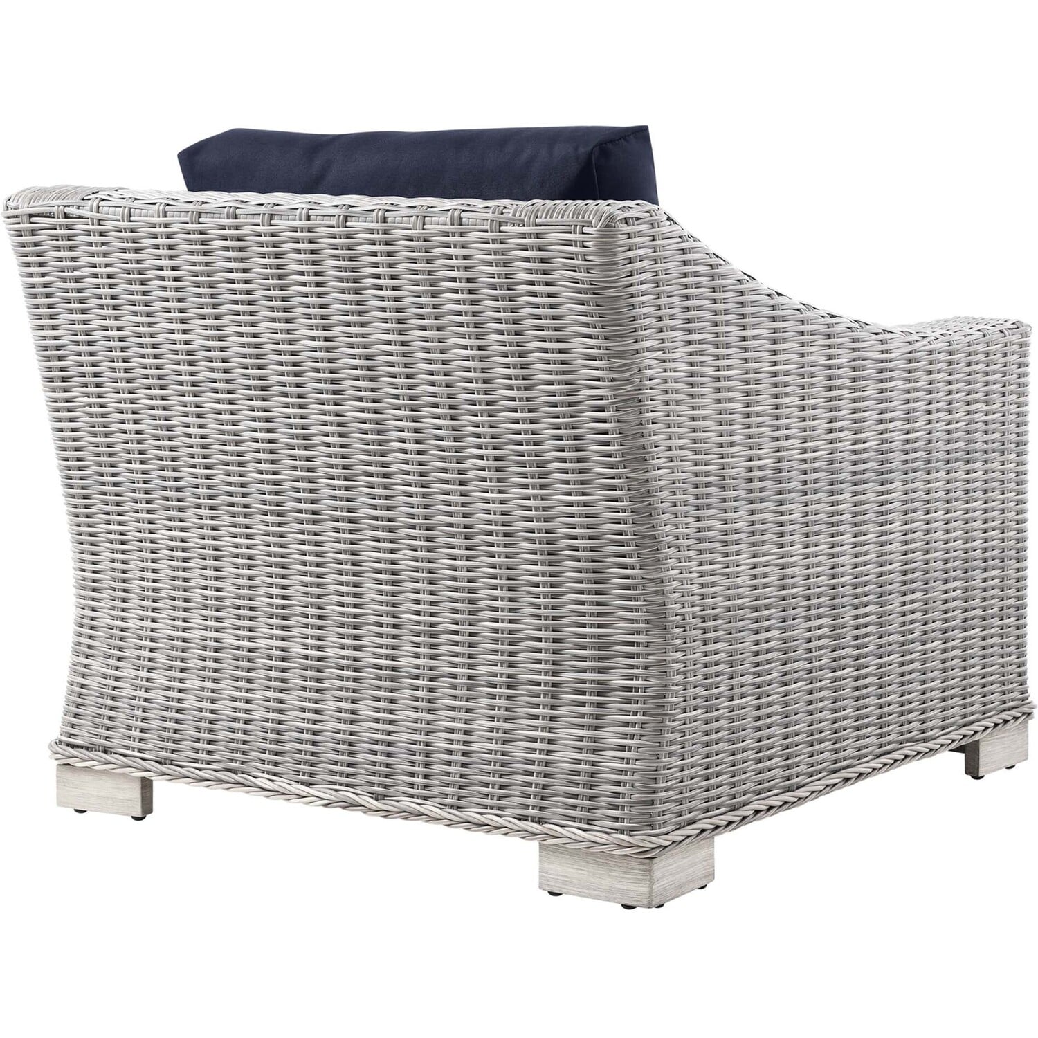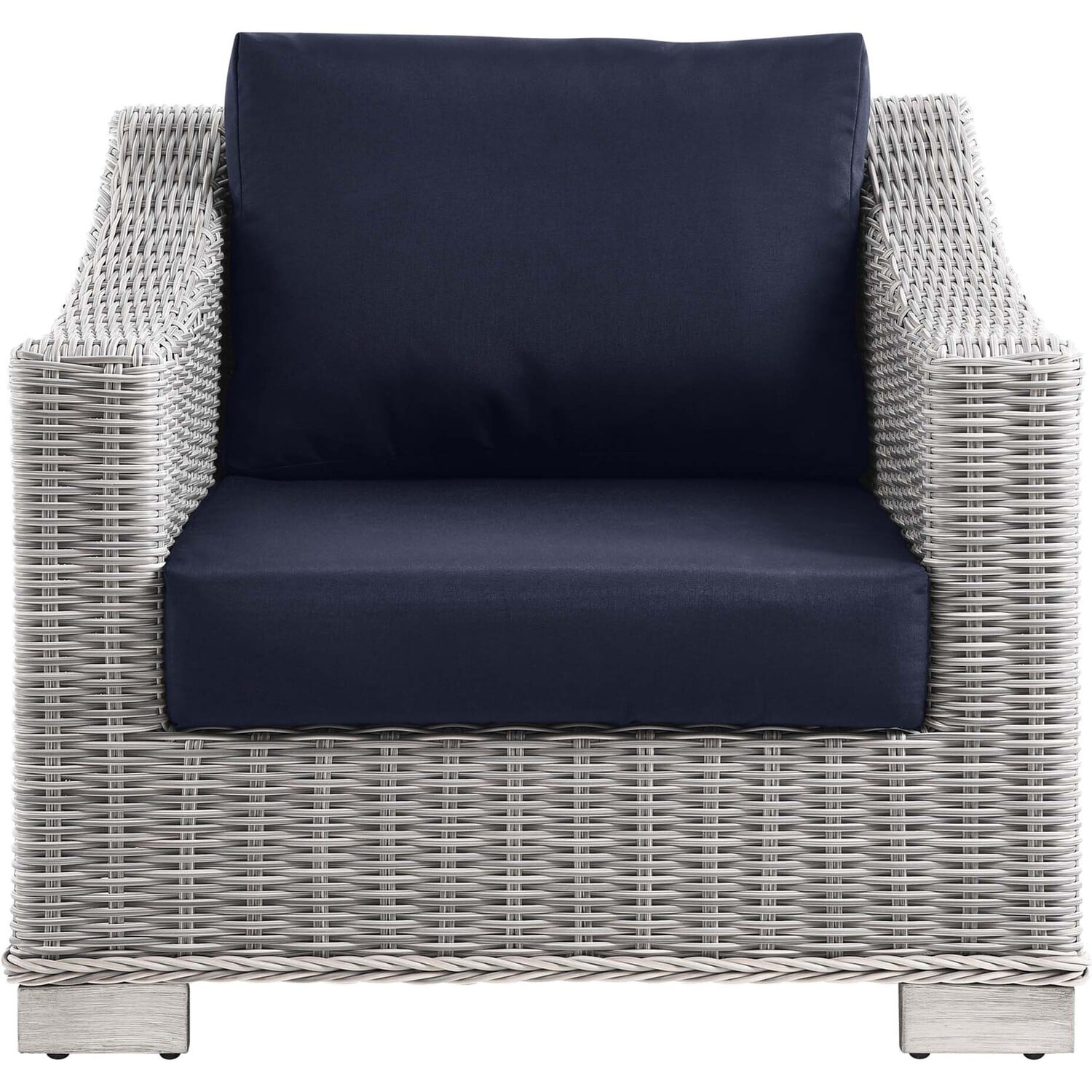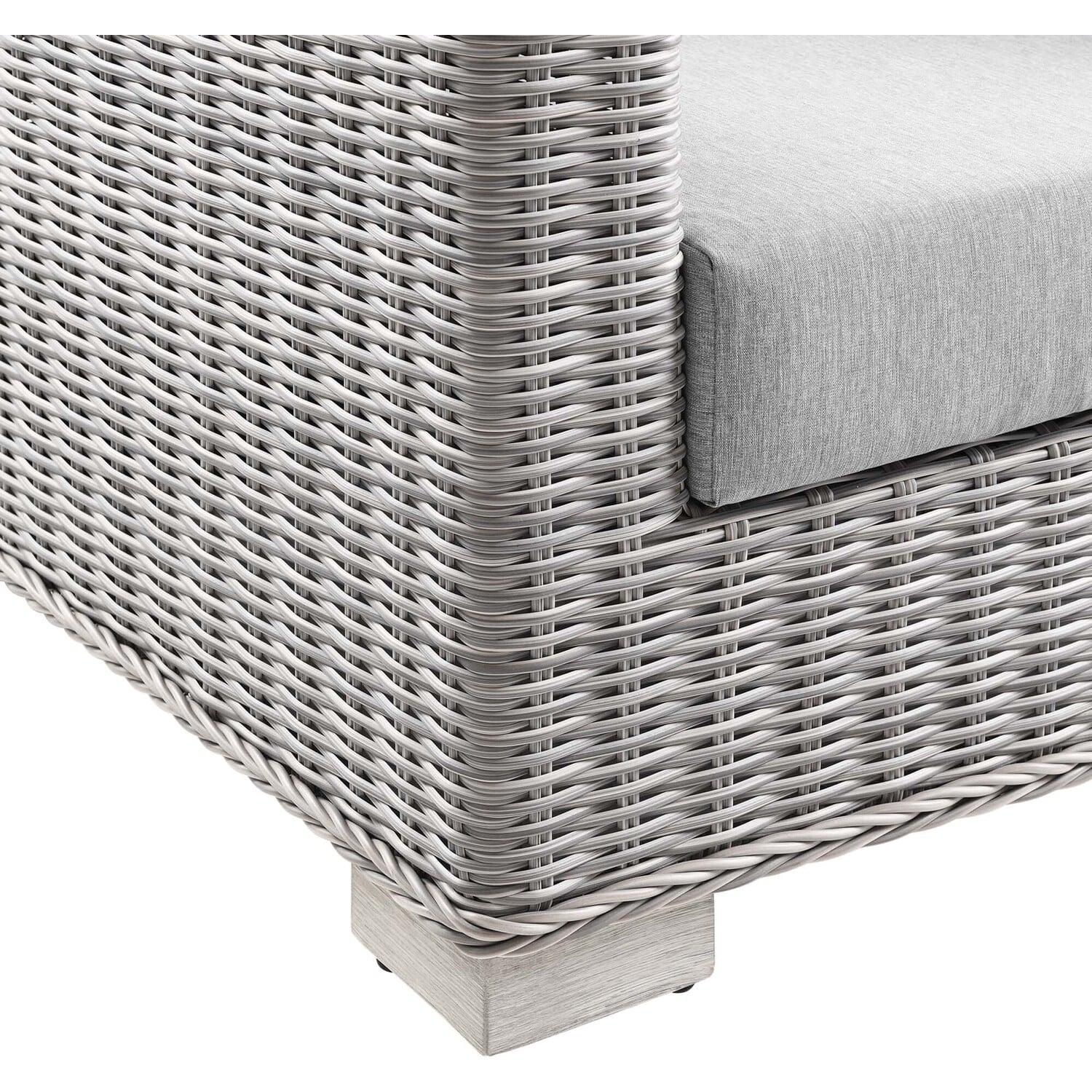 Enjoy fresh air and alfresco relaxation with the Conway Outdoor Patio Wicker Rattan Armchair. Wrapped in UV-resistant light gray synthetic wicker rattan, this patio chair boasts organic texture and a neutral hue that brings a calming presence to your outdoor space. The frame of this outdoor chair is crafted with durable powder-coated aluminum and rests on L-shaped legs with plastic foot glides. Thick foam padded cushions covered with removable, water-resistant polyester covers offer a comfortable seat and affix securely to the lounge chair with cord tension attachments. Trending aesthetics and a classic design define this outdoor patio furniture collection making it a beautiful addition to any outdoor space including the backyard, patio, porch, balcony, or poolside. Assembly required. Patio Chair Weight Capacity: 300 lbs.Outdoor Patio Chair