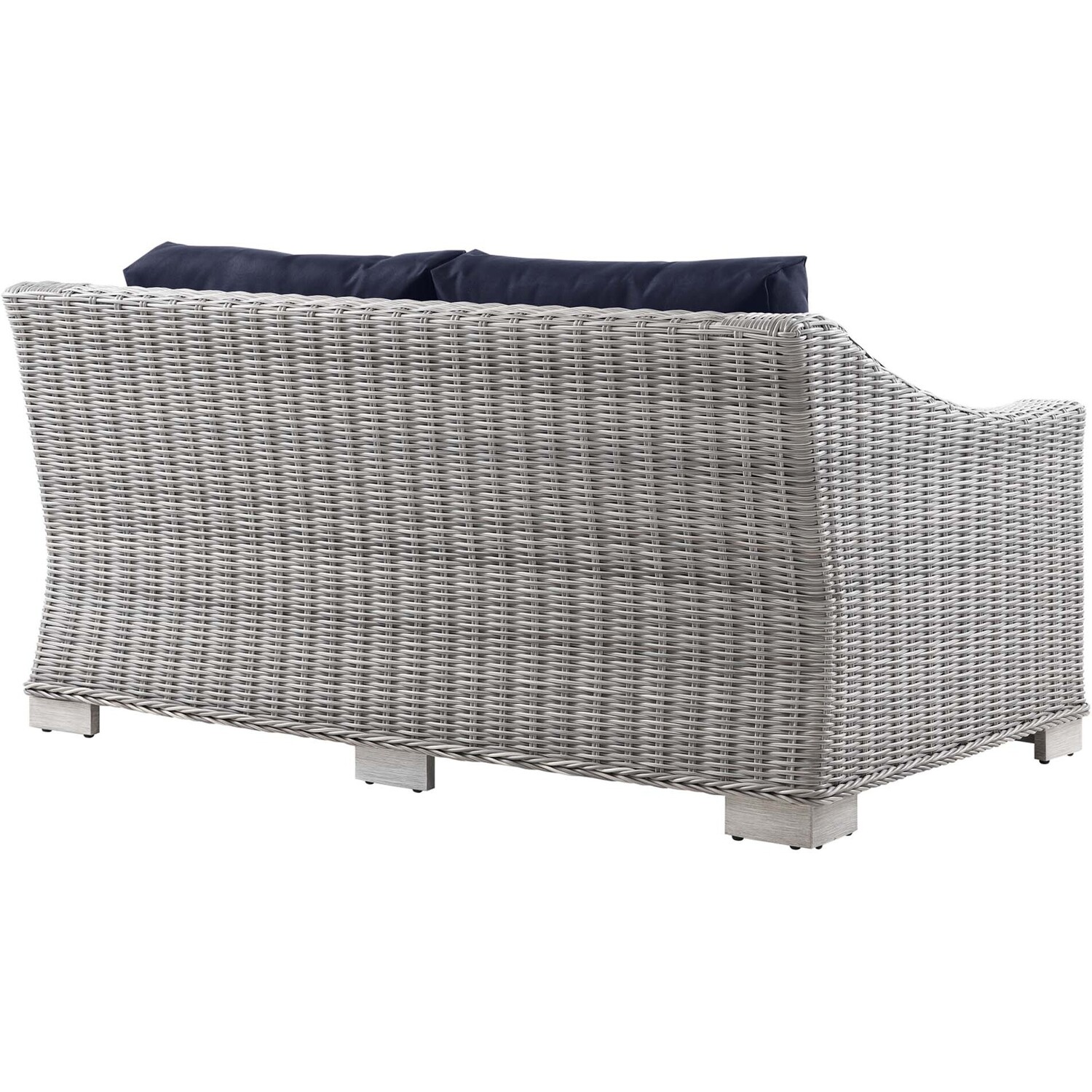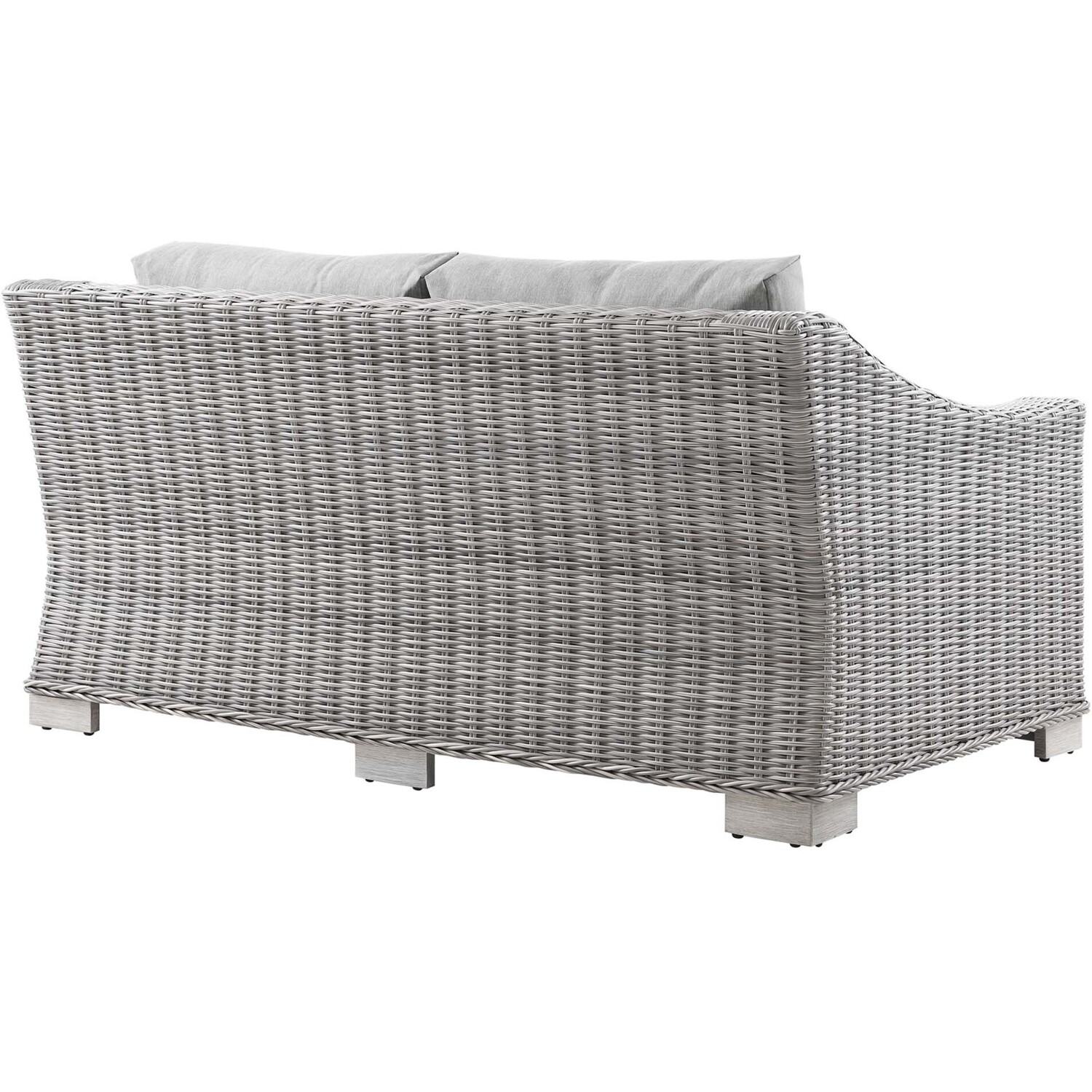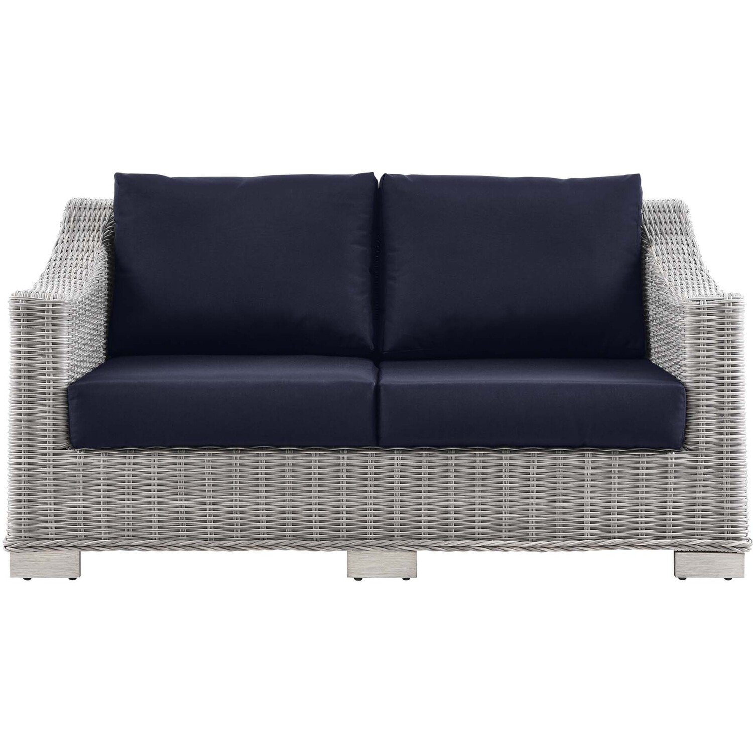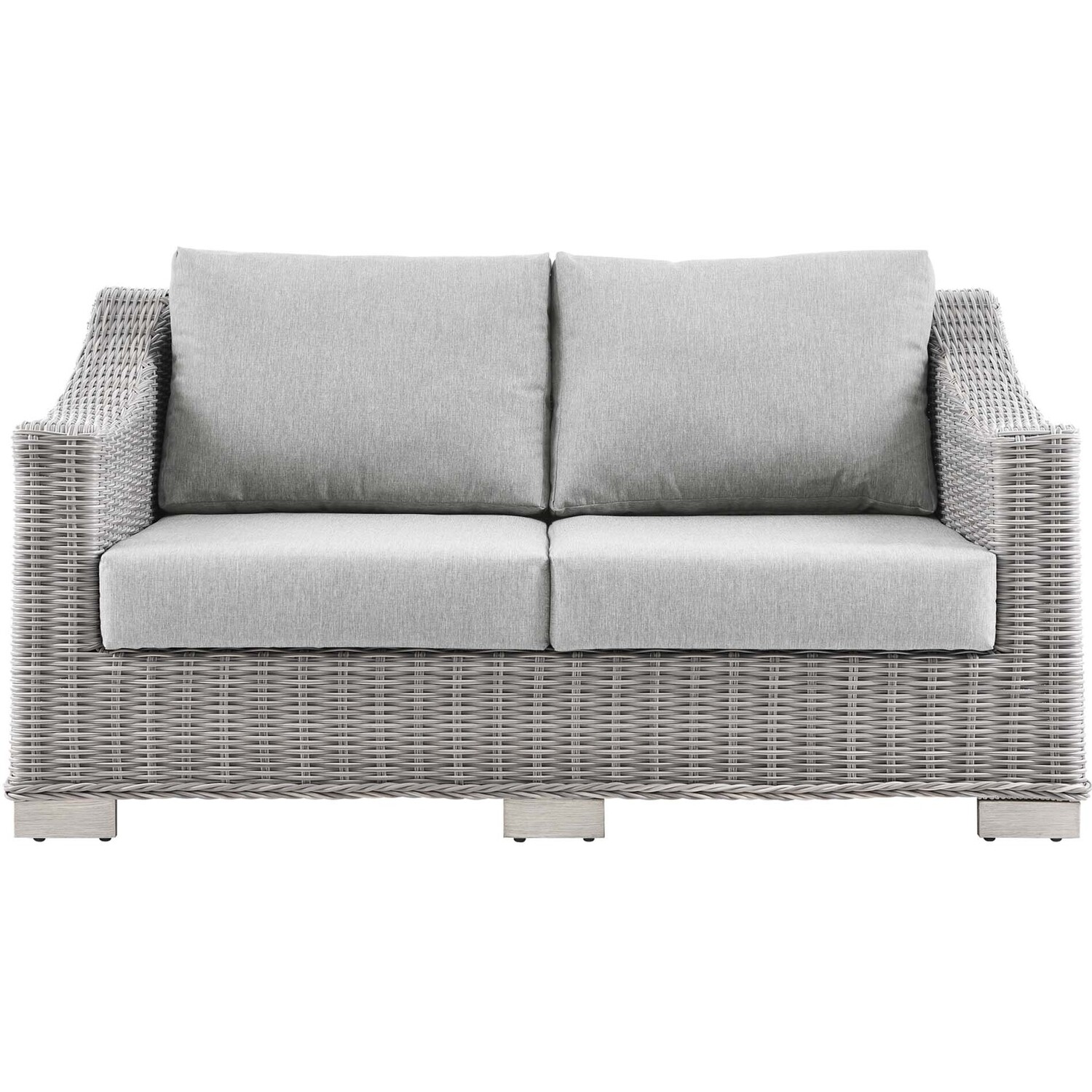 Enjoy fresh air and alfresco relaxation with the Conway Outdoor Patio Wicker Rattan Loveseat. Wrapped in UV-resistant light gray synthetic wicker rattan, this patio loveseat boasts organic texture and a neutral hue that brings a calming presence to your outdoor space. The frame of this outdoor two-seater sofa is crafted with durable powder-coated aluminum and rests on L-shaped legs with plastic foot glides. Thick foam padded cushions covered with removable, water-resistant polyester covers offer a comfortable seat and affix securely to the loveseat with cord tension attachments. Trending aesthetics and a classic design define this outdoor patio furniture collection making it a beautiful addition to any outdoor space including the backyard, patio, porch, balcony, or poolside. Assembly required. Patio Loveseat Weight Capacity: 600 lbs.Outdoor Patio Loveseat