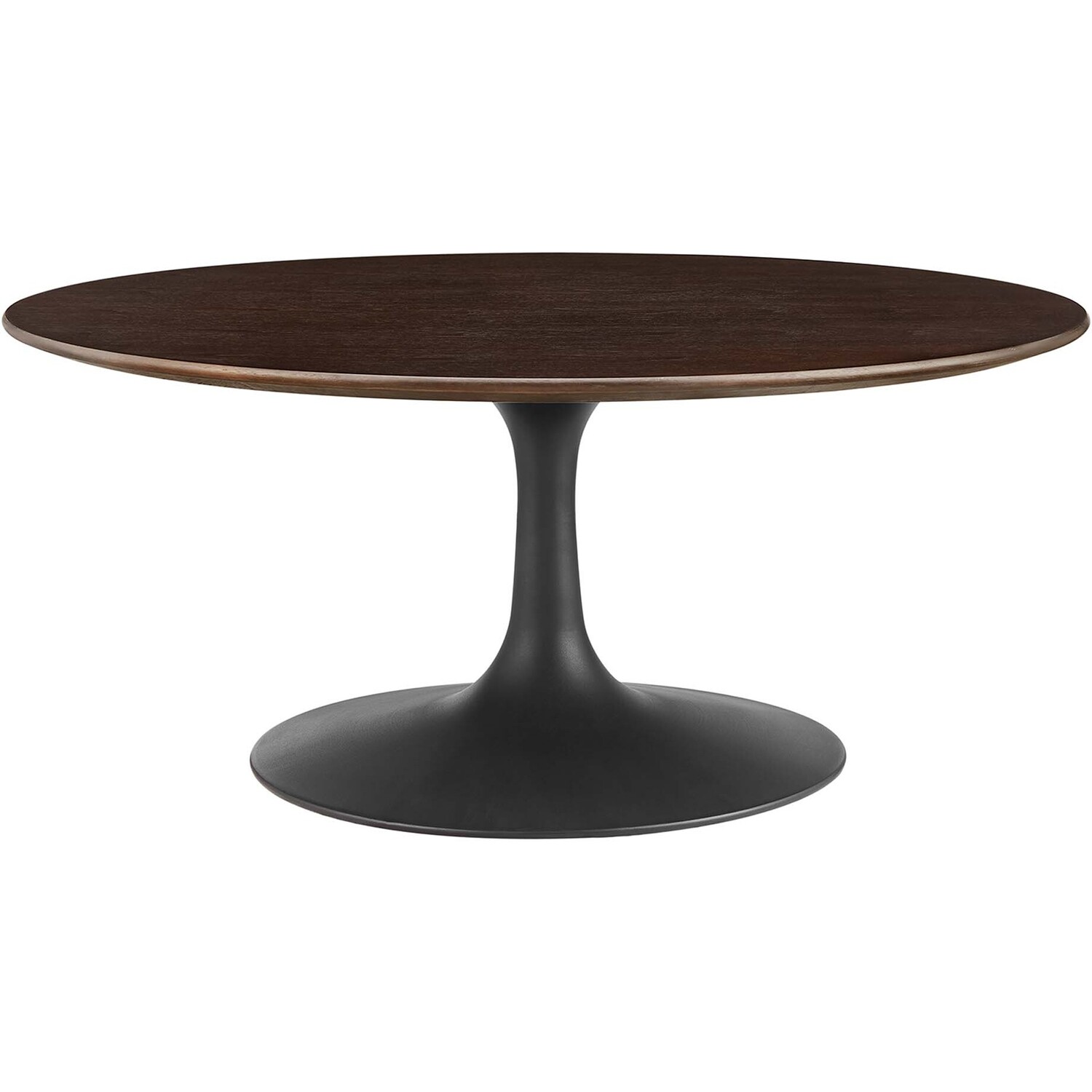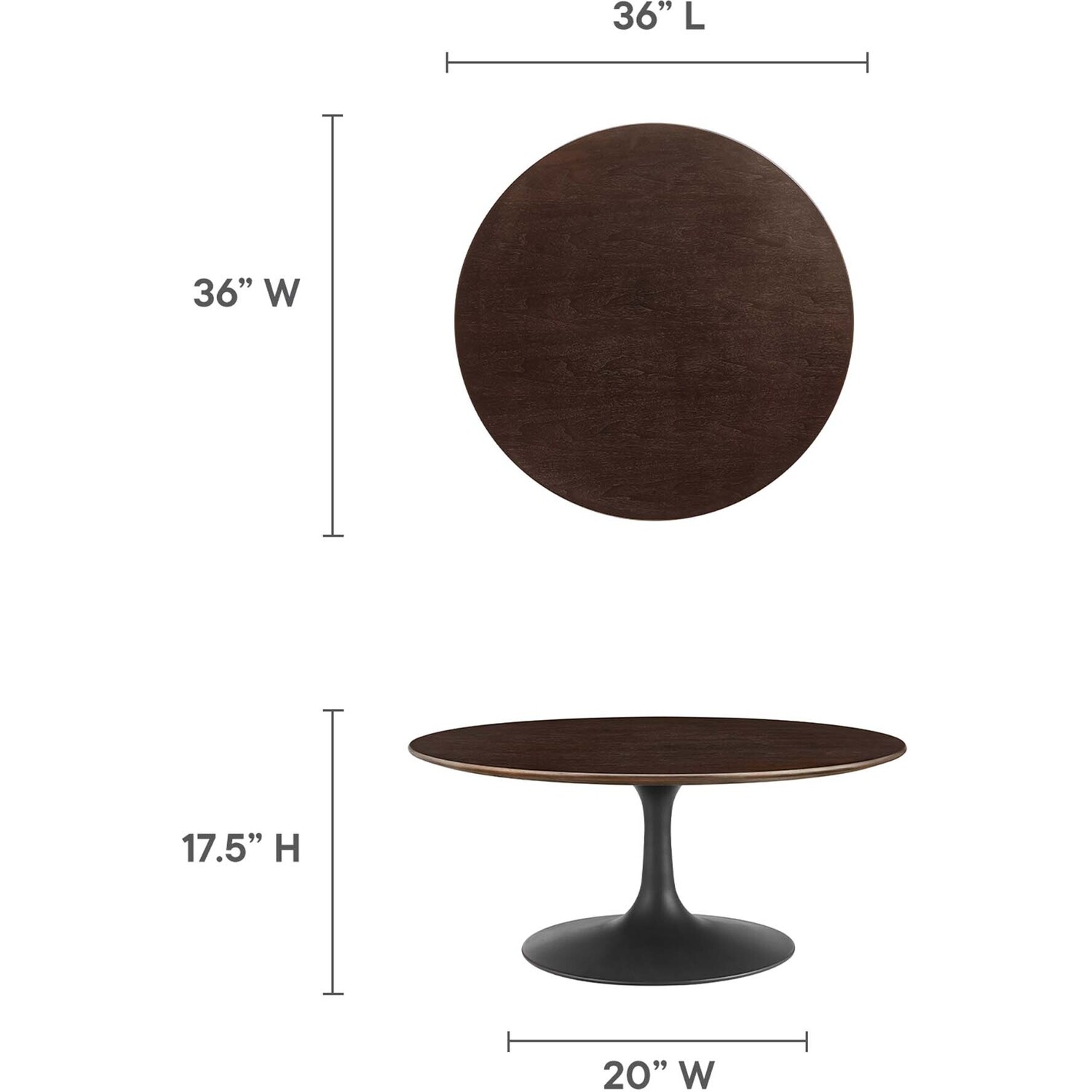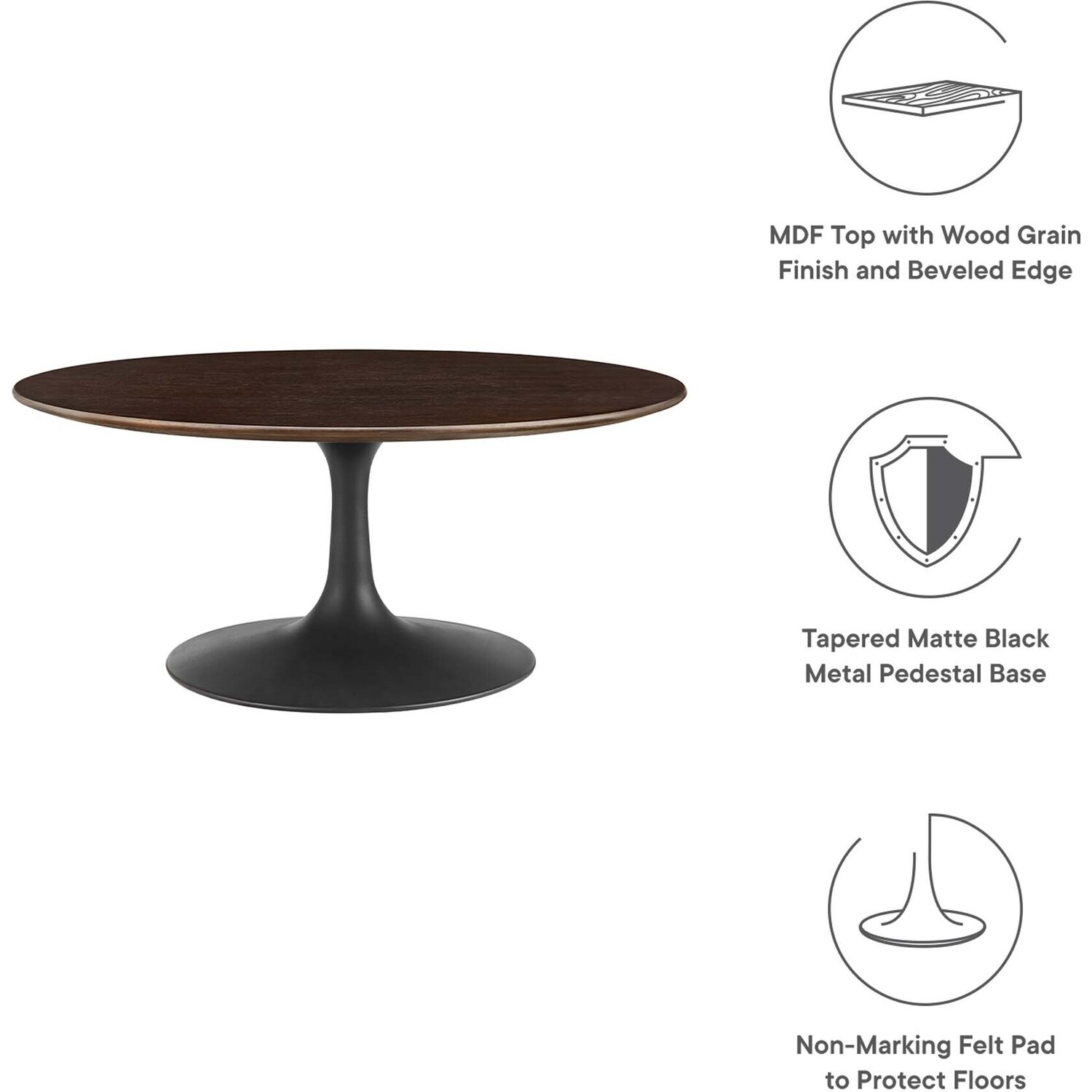 Let modern inspiration flow while gathered around the Lippa 36" Round Coffee Table. Perfect for hosting a morning cup of coffee or entertaining family and friends, this pedestal table features a spacious surface. Its round tabletop is crafted with durable MDF and wood grain veneer with a beveled edge for a contemporary yet timeless design. Embodying an iconic mid-century silhouette, this pedestal coffee table floats on a sleek tapered metal pedestal base with a chip-resistant powder-coated finish. Includes non-marking felt pad to protect flooring. Assembly required.Modern Coffee Table