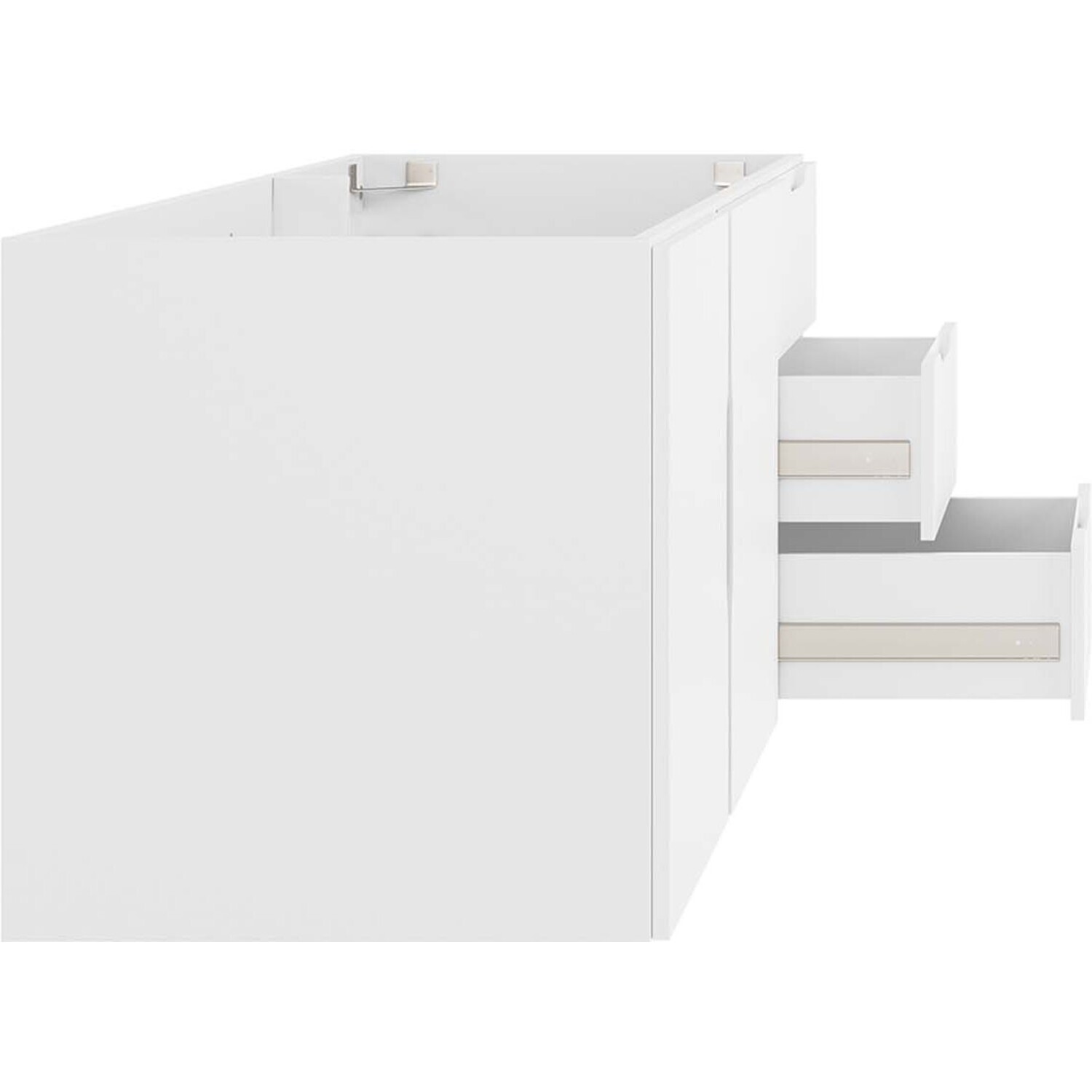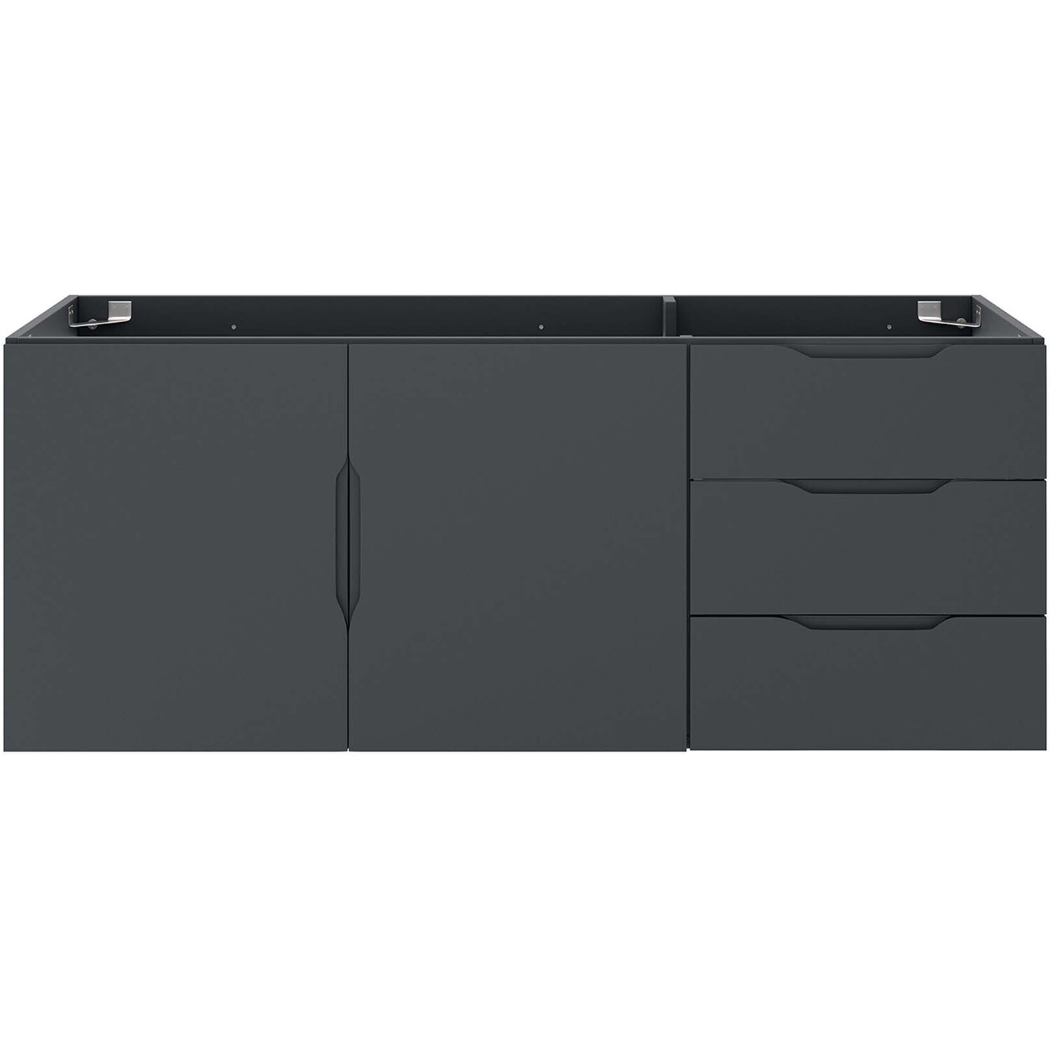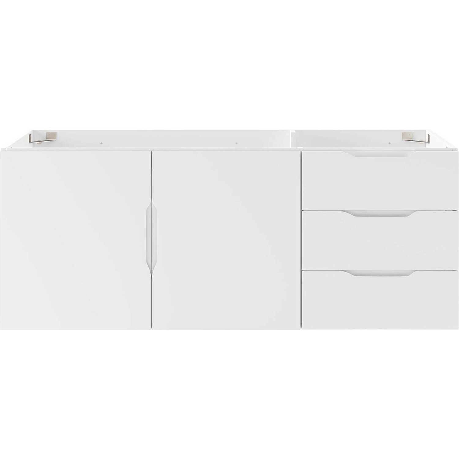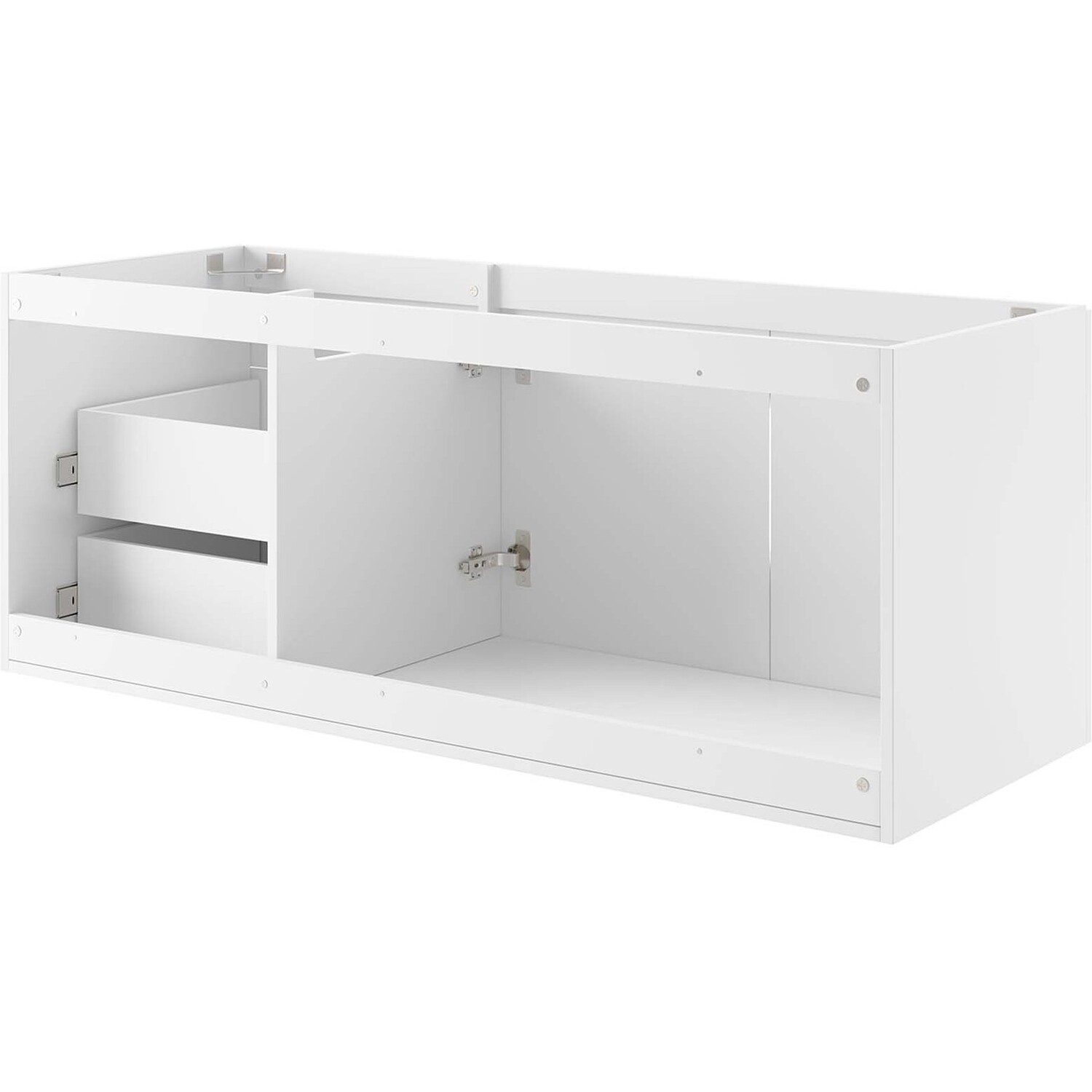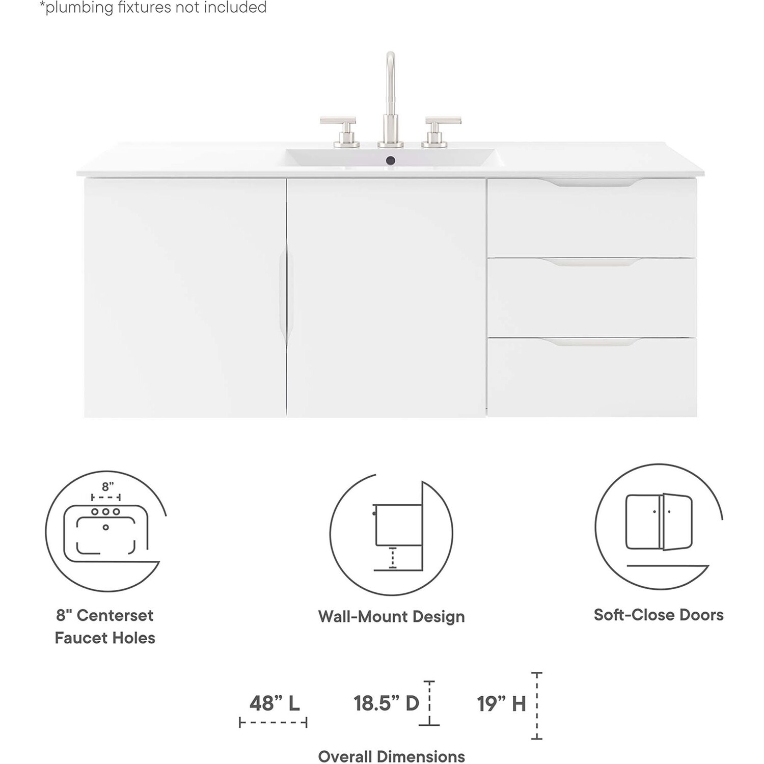 Energize your bathroom space with the modern design of the Vitality 48" Wall-Mount Bathroom Vanity. Boasting a sleek, clean-lined silhouette, this vanity is durably crafted with particleboard and MDF with a melamine finish. This vanity features a wall-mount design and is complete with ample storage space for all your bathroom essentials with two spacious drawers and an under-sink storage area behind two soft-close doors. This vanity boasts an open back design to accommodate plumbing. Sink basin and fixtures not included. Assembly required.Modern Bathroom Vanity