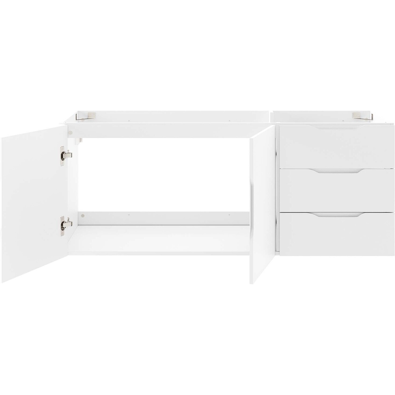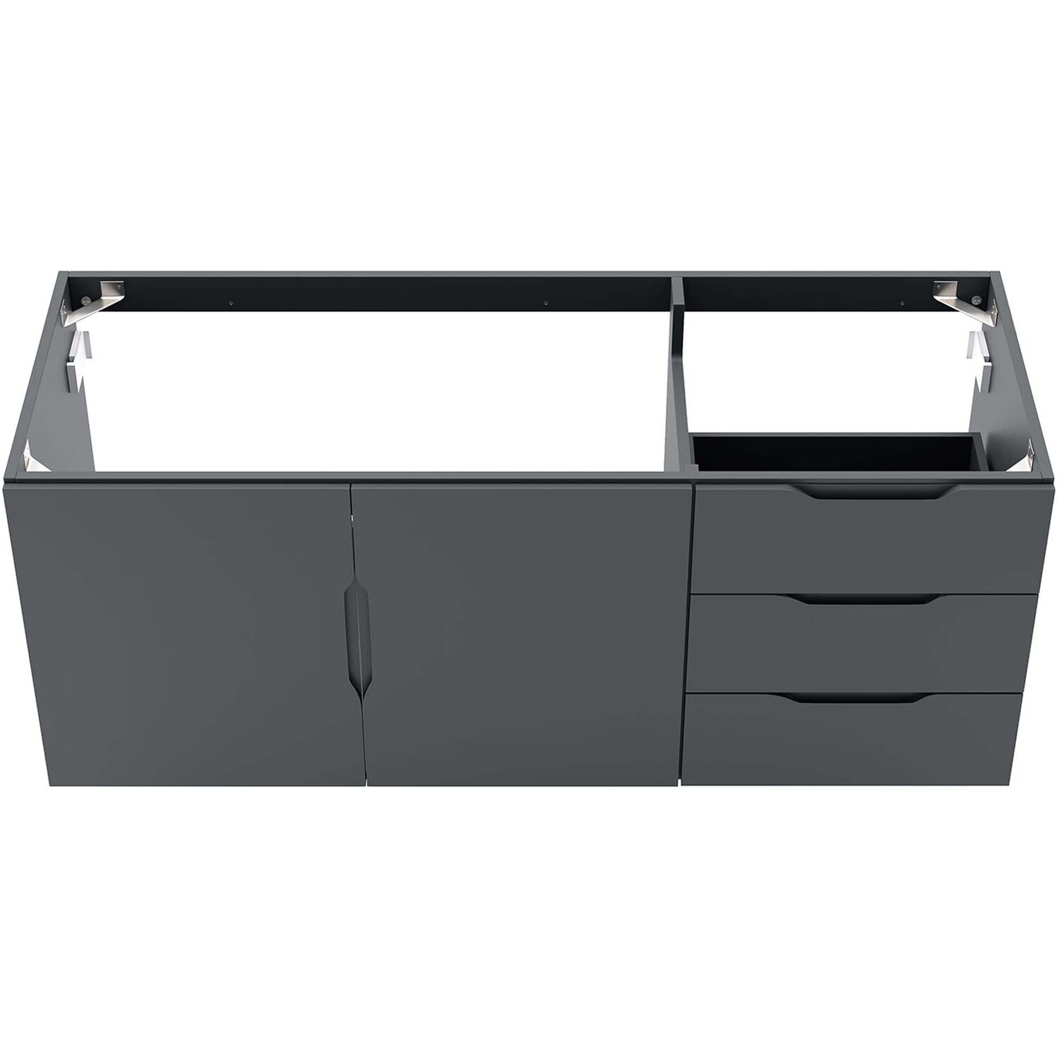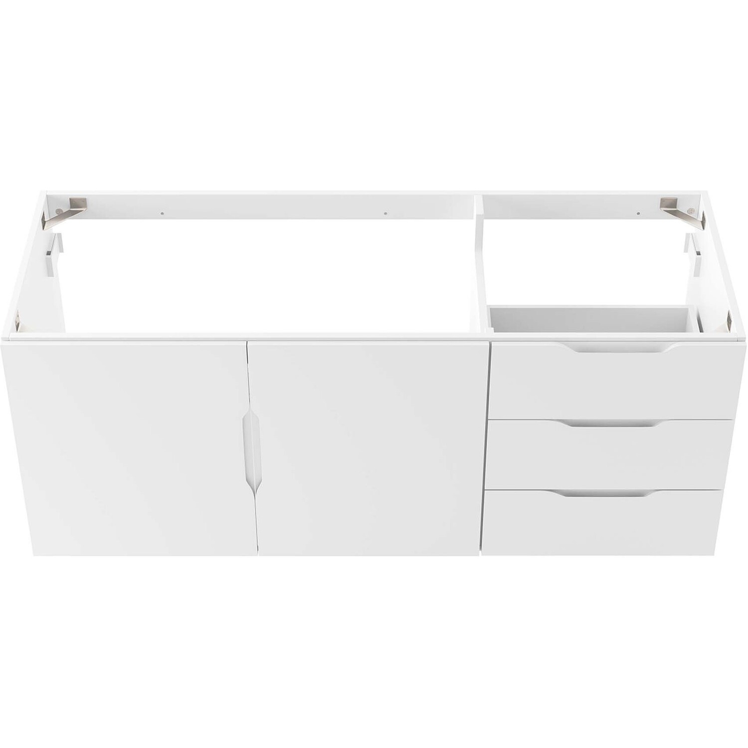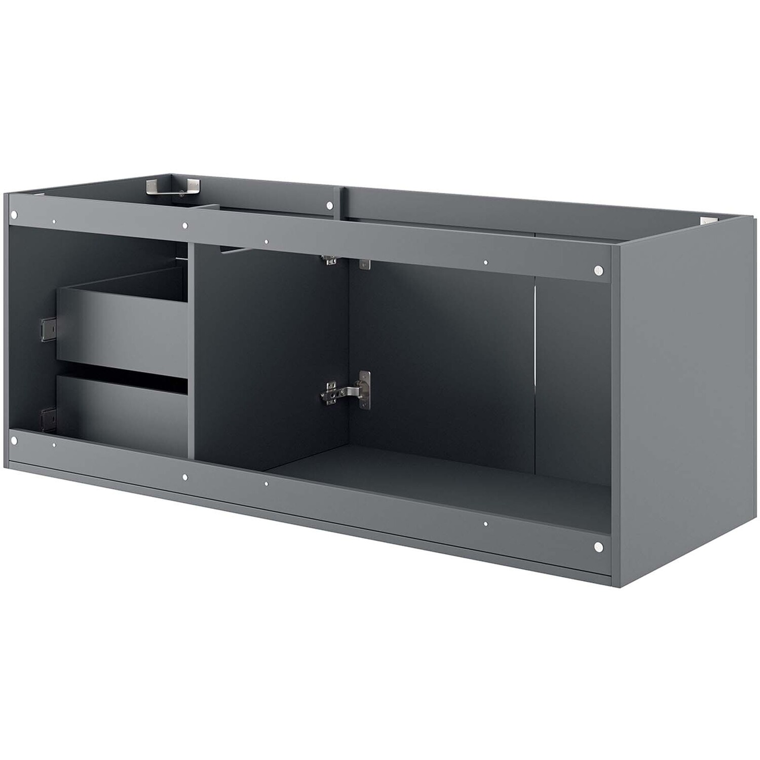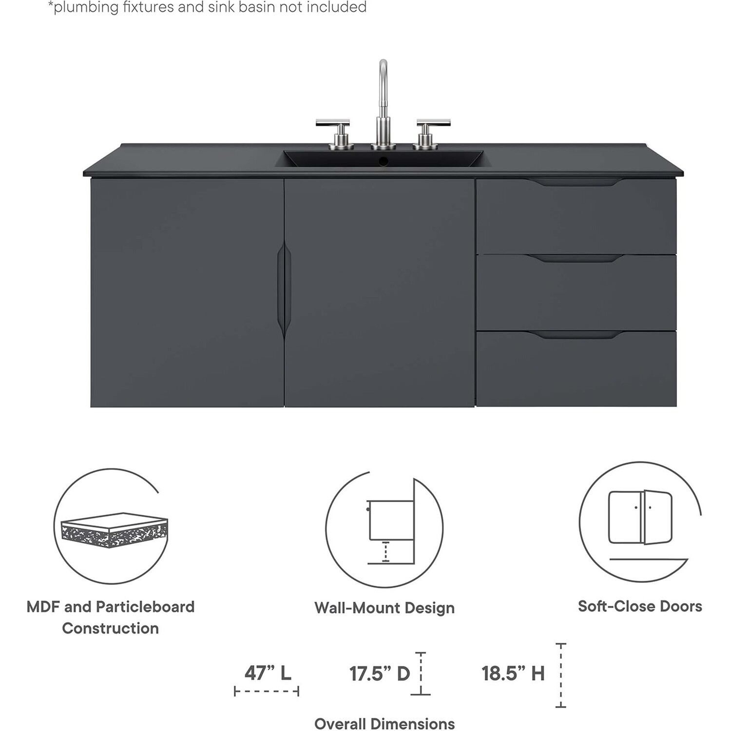 Energize your bathroom space with the modern design of the Vitality 48" Wall-Mount Bathroom Vanity. Boasting a sleek, clean-lined silhouette, this vanity is durably crafted with particleboard and MDF with a melamine finish. This vanity features a wall-mount design and is complete with ample storage space for all your bathroom essentials with two spacious drawers and an under-sink storage area behind two soft-close doors. This vanity boasts an open back design to accommodate plumbing. Sink basin and fixtures not included. Assembly required.Modern Bathroom Vanity