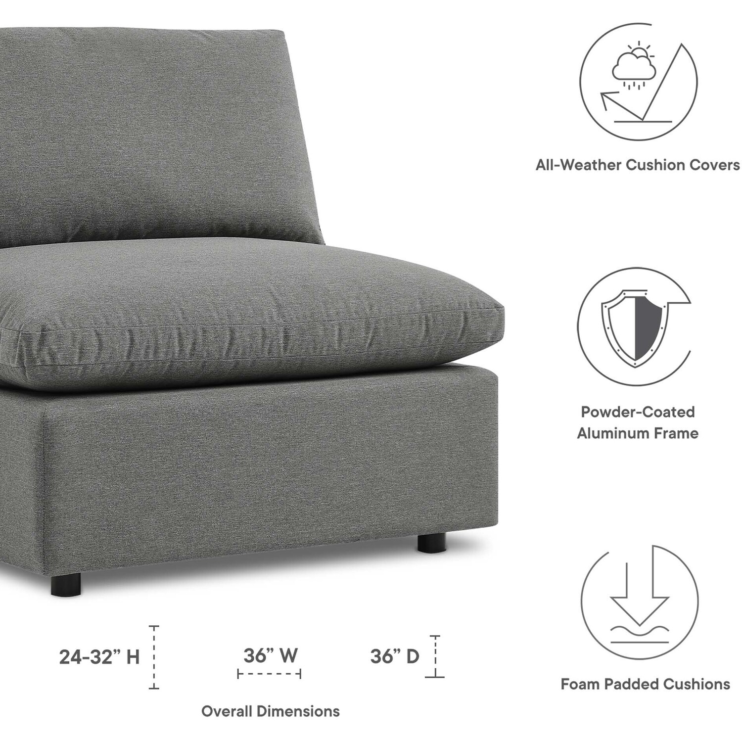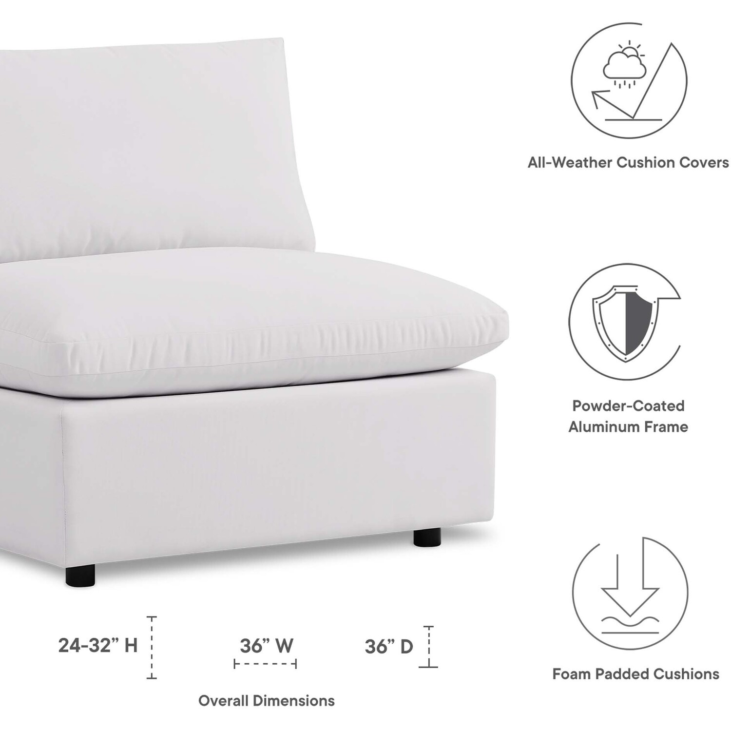 A haven for cozy relaxation right in your own backyard, Commix features plush comfort, a clean-lined design, and a spacious profile that makes an attractive statement on the porch, patio, or by the poolside. Made for sprawling out in the sun or curling up with a good book, this patio chair features generously padded cushions covered in water-repellent and UV-resistant covers making them ideal for your outdoor space. This outdoor armless chair features an all-weather construction with a powder-coated aluminum frame and non-marking foot caps to protect flooring surfaces. Beckoning guests to sit and stay a while, the Commix Outdoor Patio Collection is perfect for al fresco entertaining or lounging amidst warm weather. Armless Chair Weight Capacity: 300 lbs.Outdoor Patio Armless Chair