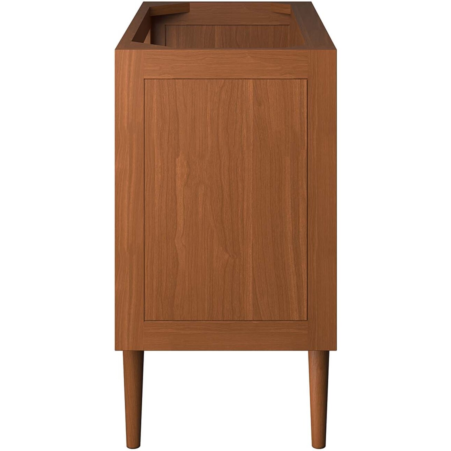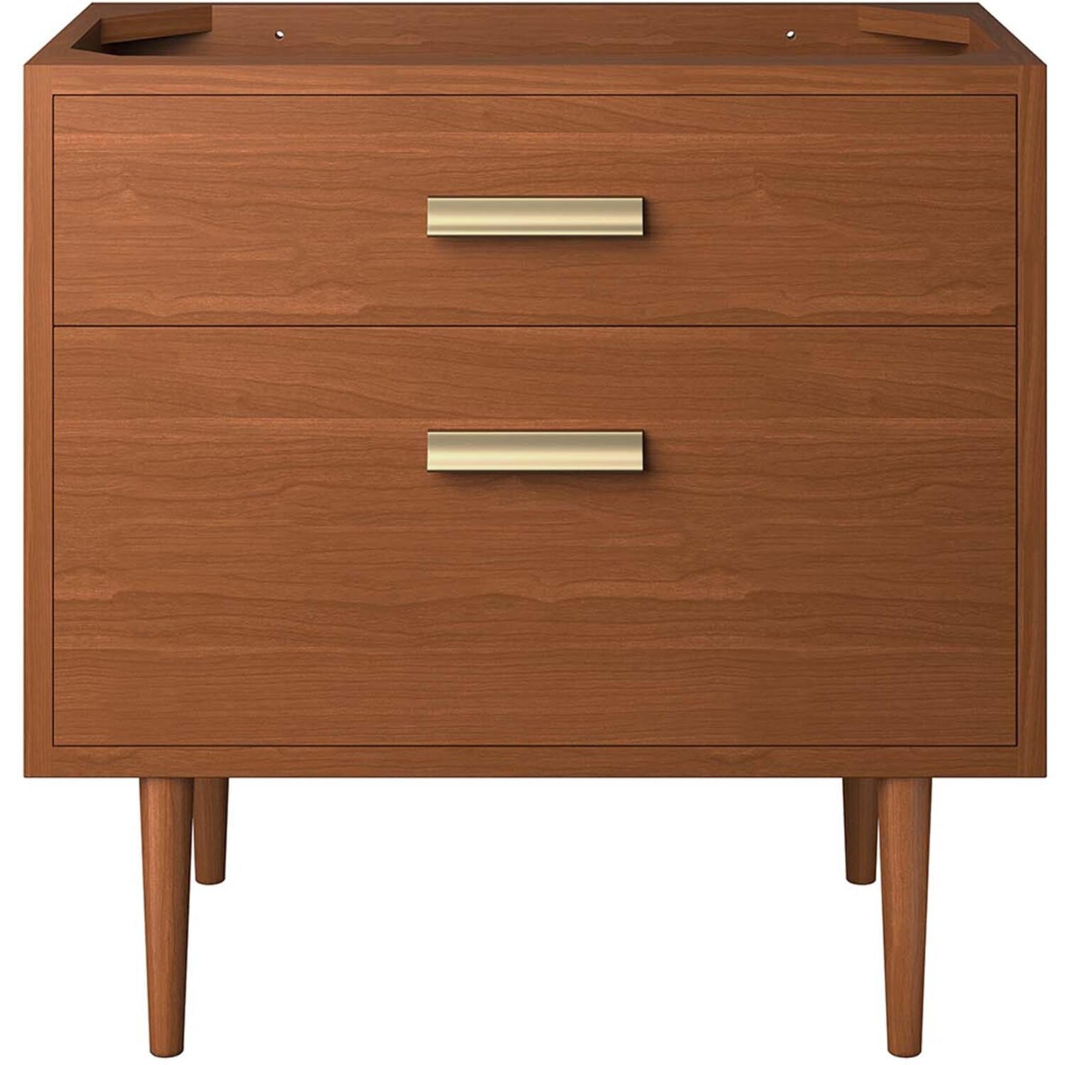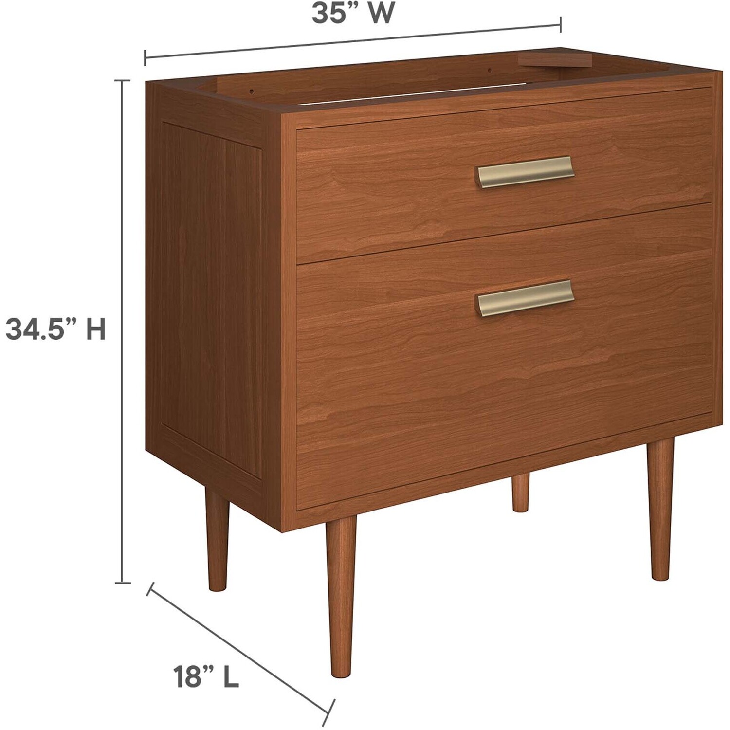Bring mid-century inspiration and organic tropical aesthetics into any bathroom space with the Cassia 36" Bathroom Vanity Cabinet. Featuring a clean-lined design and brass metal hardware, this vanity is durably crafted from solid teak wood with a faux top drawer for added interest. Raised off the ground by retro tapered legs, this bathroom vanity cabinet features ample storage in its spacious bottom drawer, complete with a convenient cut-out to accommodate plumbing. Includes non-marking foot caps. Assembly required. Sink basin and fixtures not included. Weight Capacity: 187 lbs.Solid Teak Wood