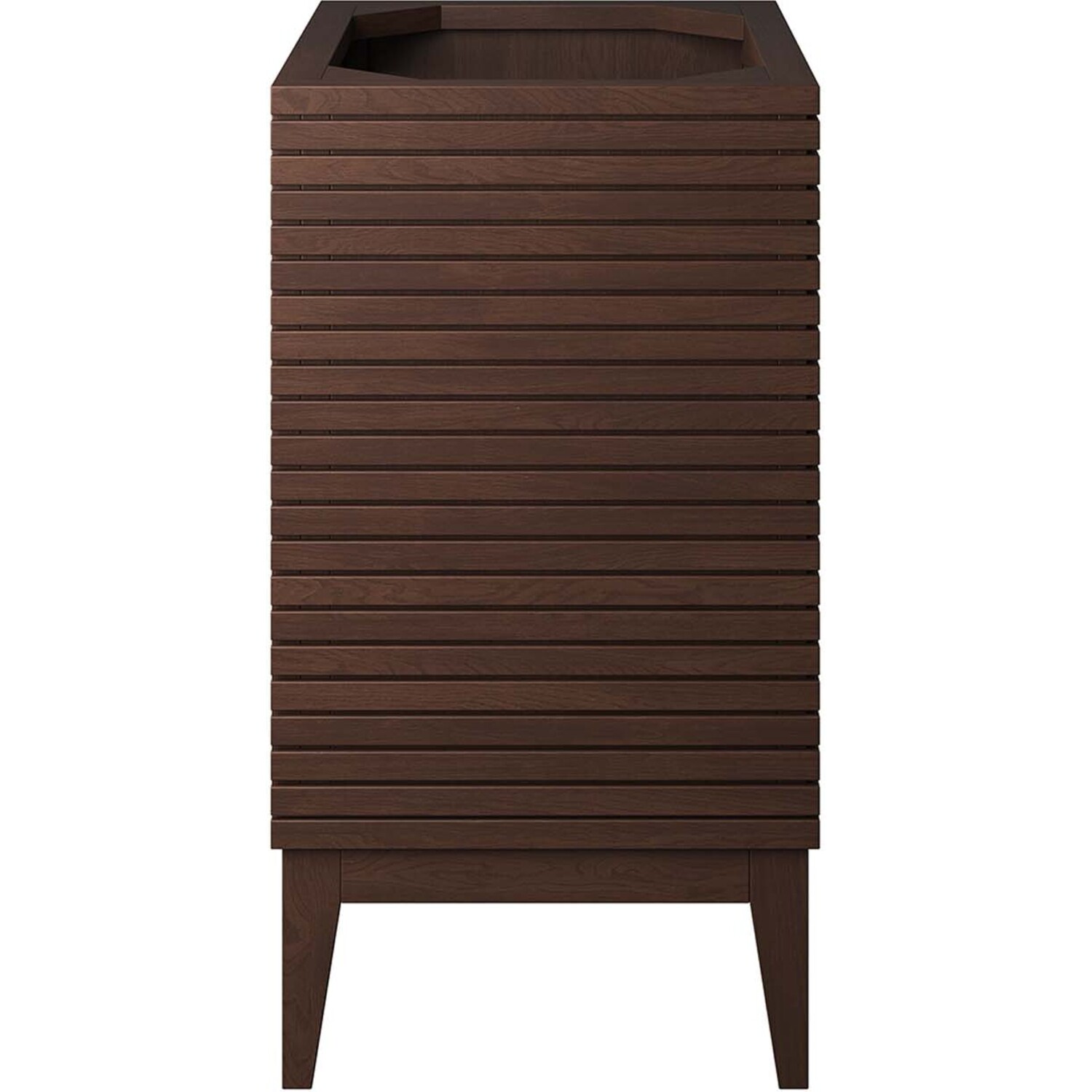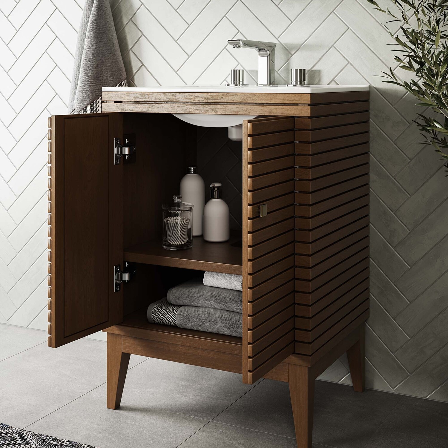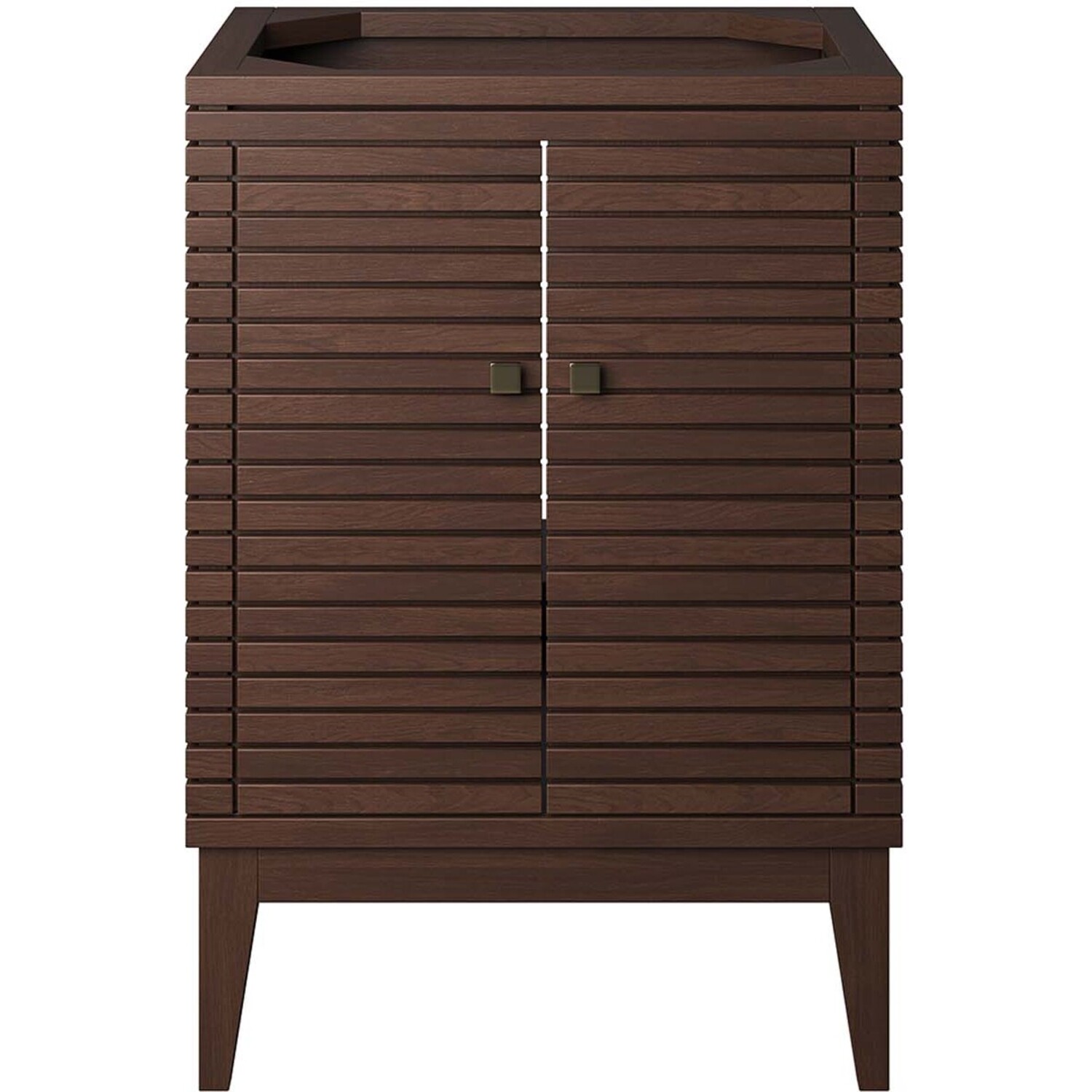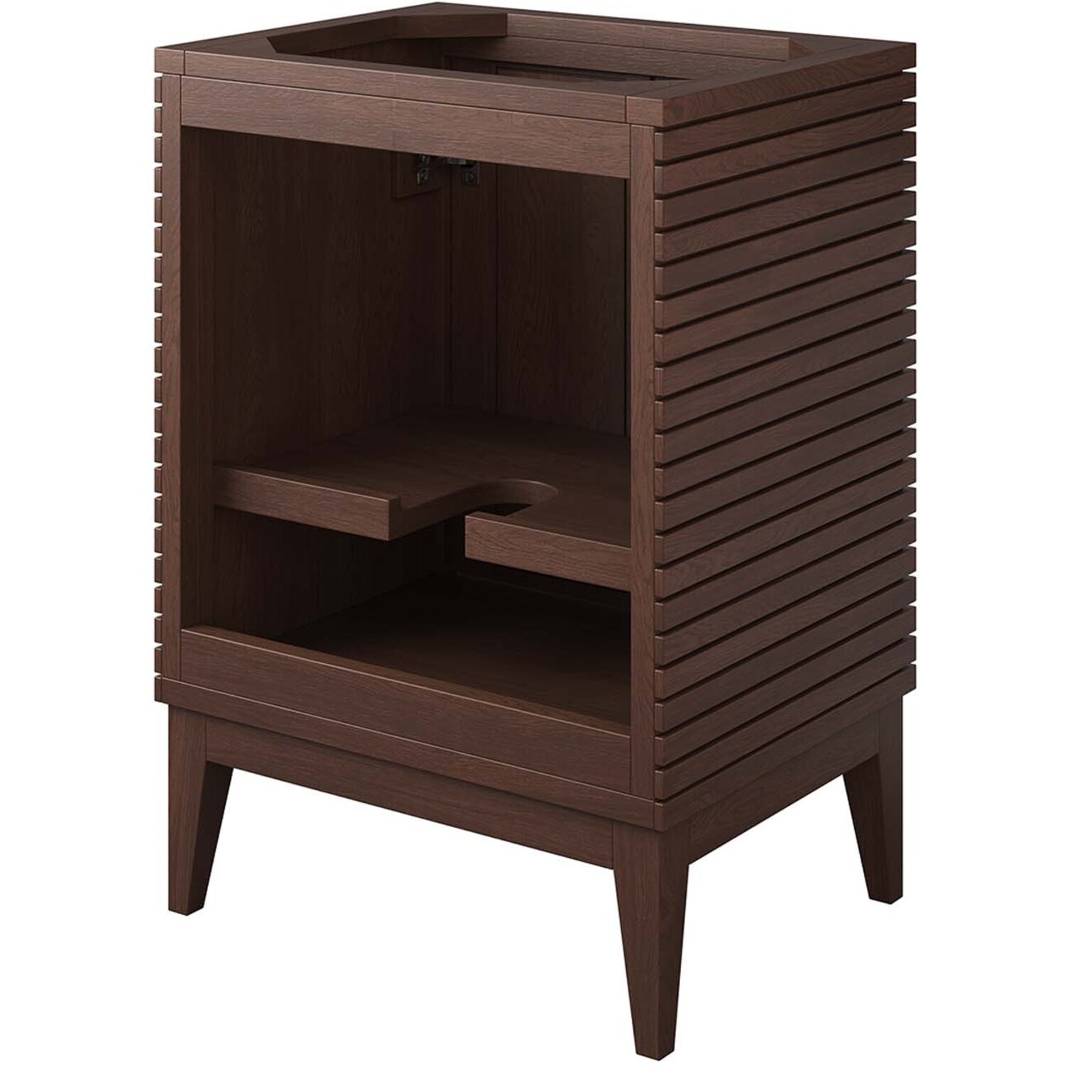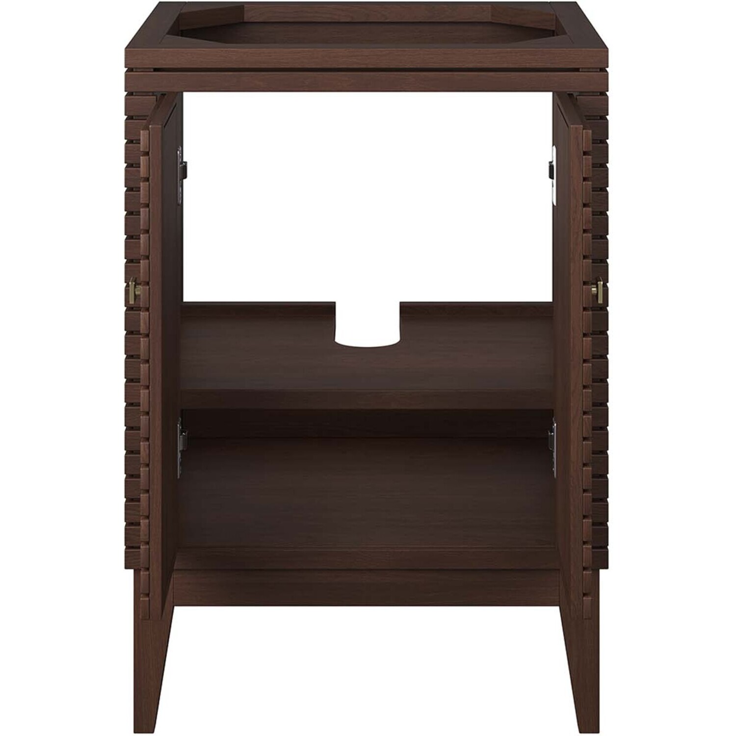 Mid-century style inspired the modern look of the Ledger 24" Bathroom Vanity Cabinet. With square brass hardware, this vanity is made with solid mindi wood and showcases a beautifully carved linear design that adds intrigue and interest. Resting on tapered legs, the Ledger Vanity Cabinet features a spacious storage area behind two soft-close hinged doors perfect for concealing all your bathroom essentials. Blending style and function, it boasts an adjustable shelf complete with a convenient cut-out to accommodate plumbing. Sink basin and fixtures not included. Weight Capacity: 187 lbs.Solid Mindi Wood