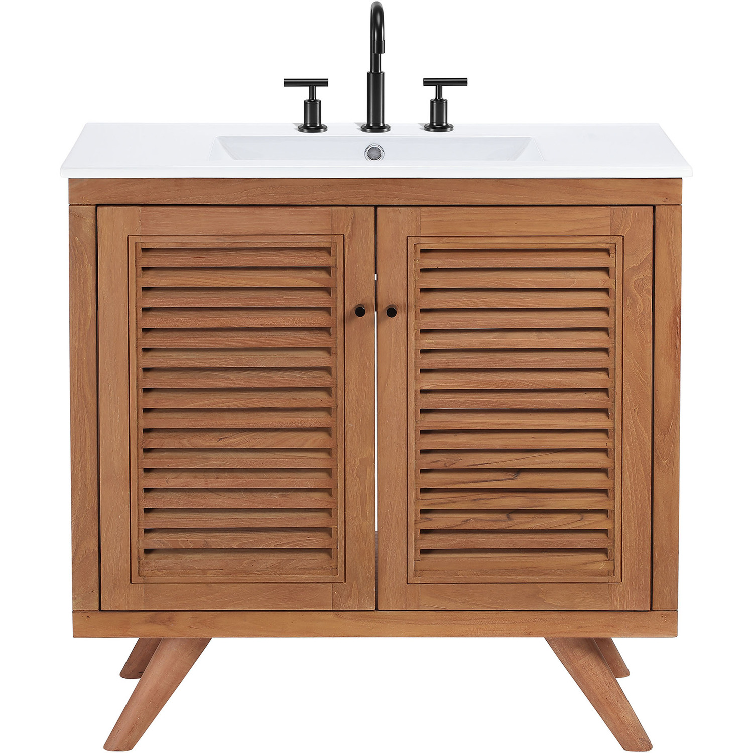 Incorporate casual coastal aesthetics and modern style to your bathroom space with the Birdie 36" Bathroom Vanity. Made with solid teak wood, this vanity features two slatted doors with black metal hardware and soft-close hinges. Supported by durable tapered legs, this bathroom vanity is complete with an adjustable shelf that offers ample storage space for all your bathroom essentials. This vanity has a ceramic sink basin with 8-inch centerset holes and an integrated countertop. Includes non-marking foot caps. Assembly required. Fixtures not included.Coastal Bathroom Vanity