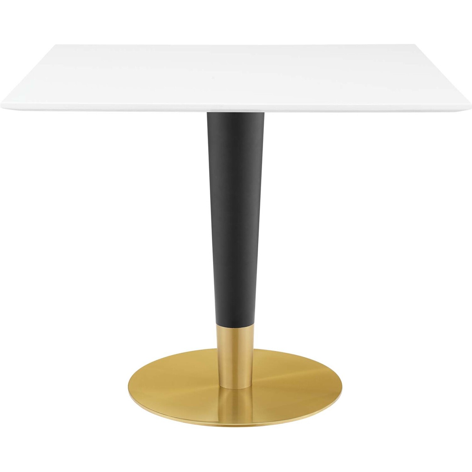 Gather family and friends for good food and conversation around the Zinque Dining Table. Bringing modern influence and mid-century inspiration to your dining space, this pedestal table reflects an organic shape. Perfect for entertaining or everyday dining, this dining table rests on a black and polished gold tapered base and features a square 36" tabletop crafted with MDF and an easy-to-clean white coating. Non-marking ring to protect flooring. Assembly required.Modern Dining Table
