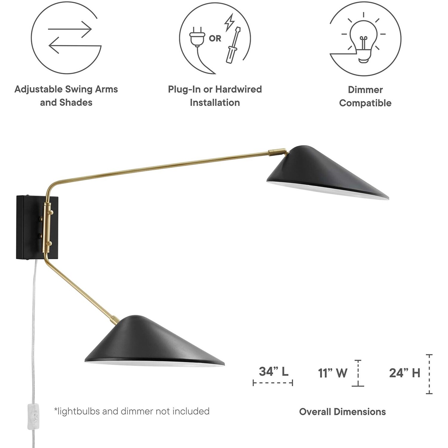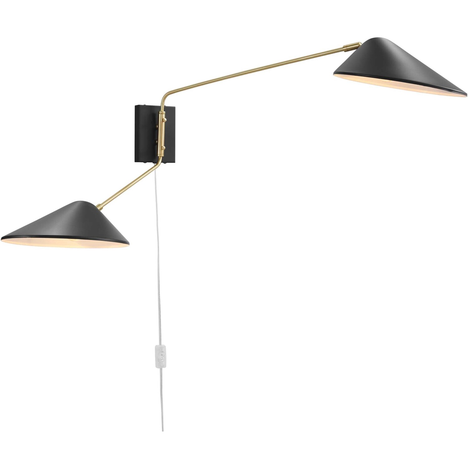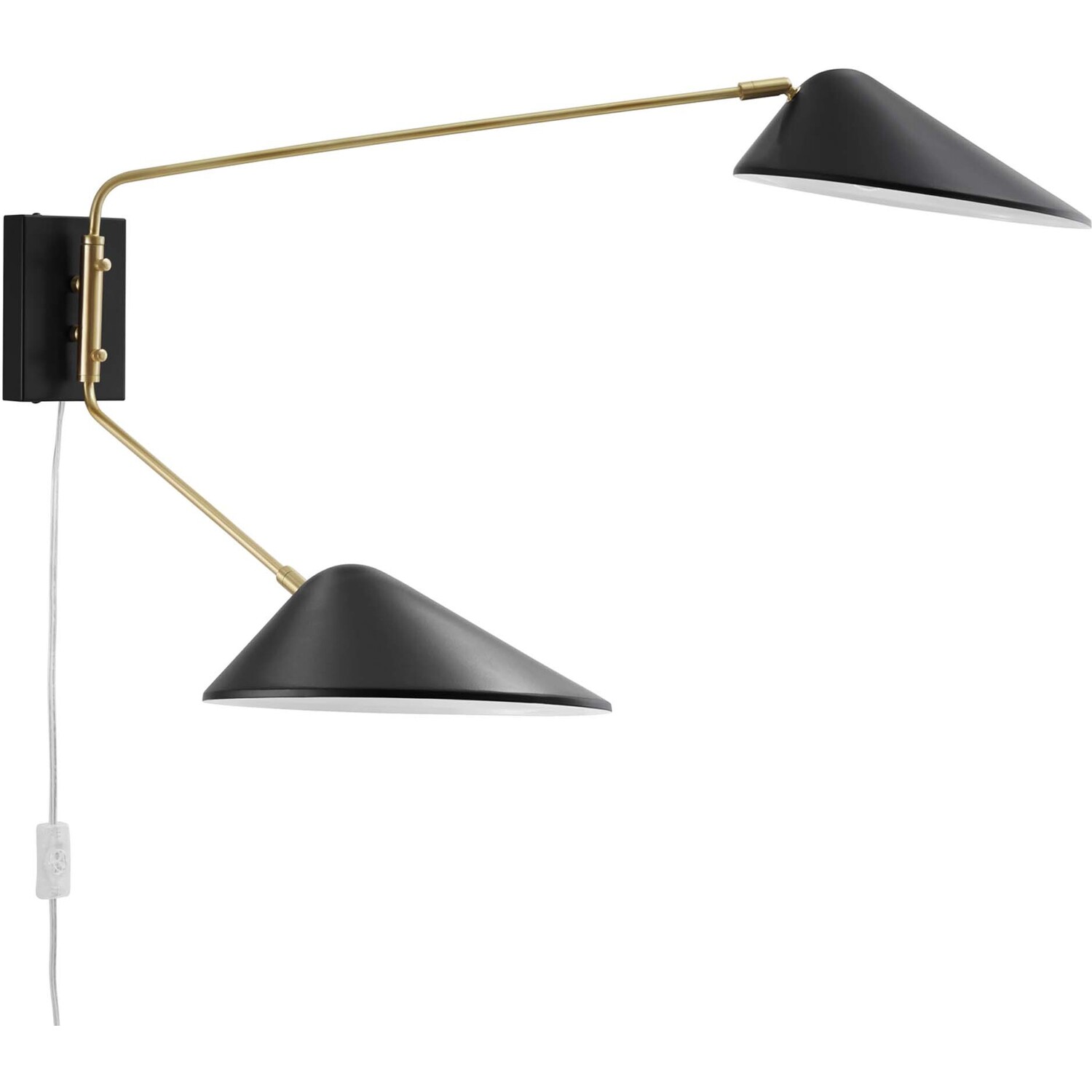 Experience visual comfort and pleasant reflections in your living room, bedroom, or hallway with the Journey 2-Light Swing Arm Wall Sconce. This mid-century modern wall lamp features a compact metal backplate and sleek matte shades anchored on satin brass rods. With left-right adjustable swing arms and complete swivel lampshades, Journey is a multi-directional luminary in the entryway. The Journey Wall Lamp features an innovative 2-in-1 design that allows you to plug it in anywhere or create a sleek cordless look with the hardwire option, professional installation required. Clear power cord with On/Off switch. Requires 2 E26 bulbs, 40W max, or LED equivalent (not included). Compatible with dimmer switches (not included).2-Light Swing Arm Wall Sconce