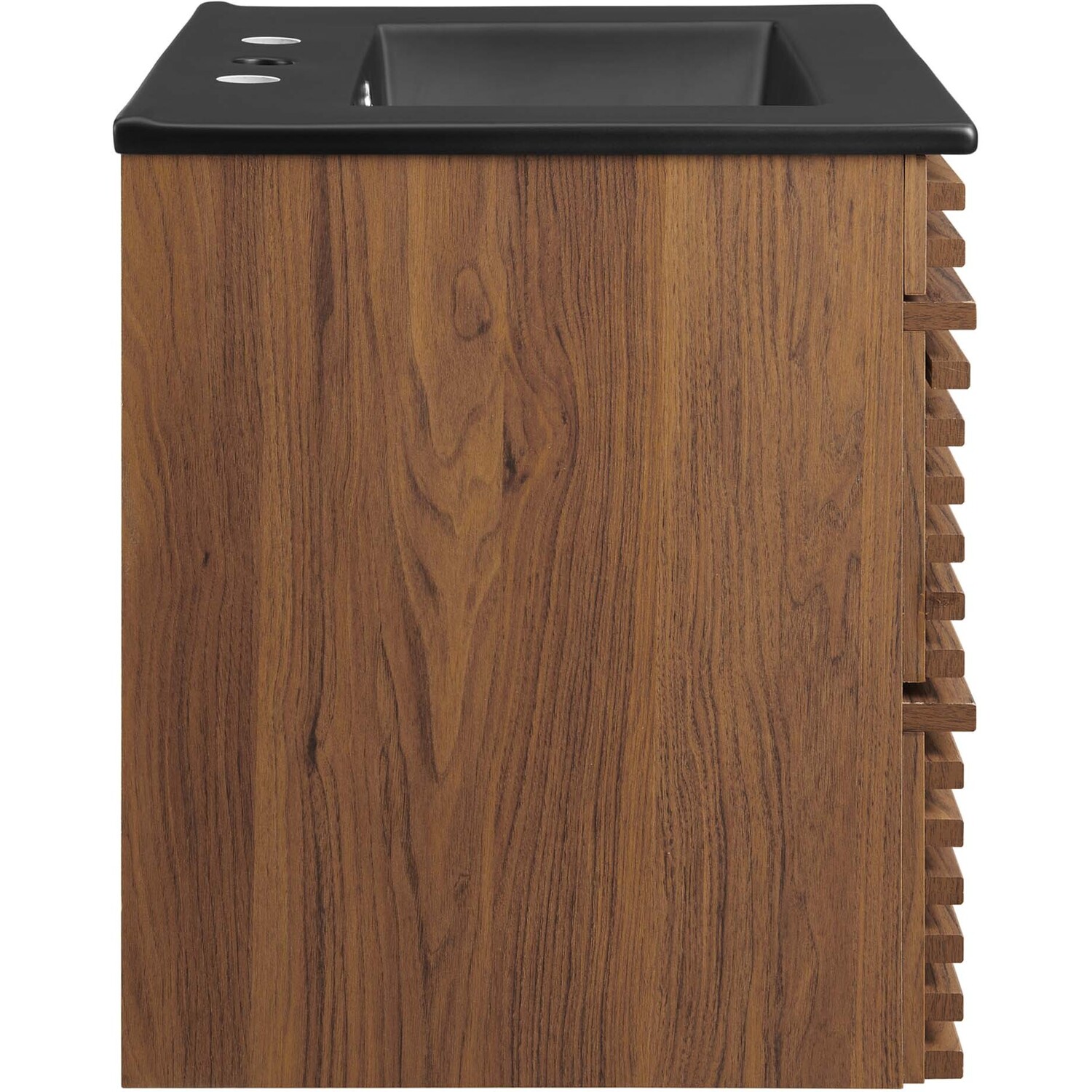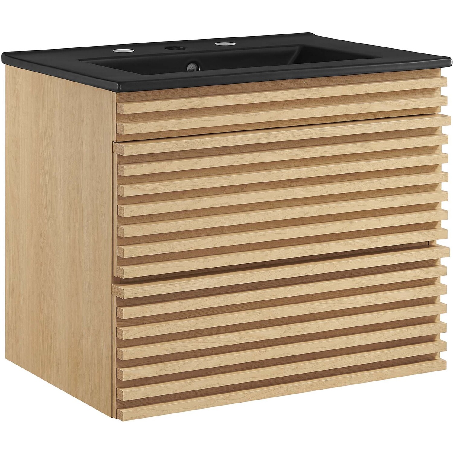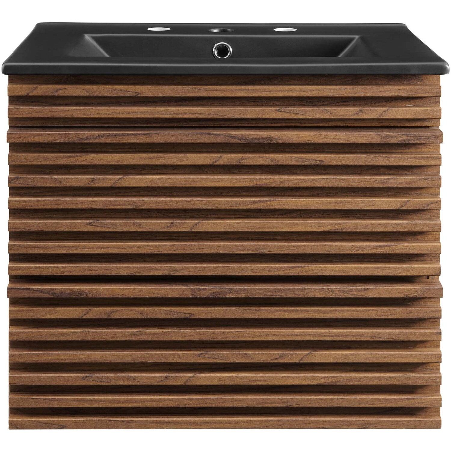 Tap into mid-century aesthetics with the Render Vanity. The Render 24" Bathroom Vanity features a durable MDF and particleboard frame with smooth walnut grain laminate, ample storage space in two full-extension drawers, and space-saving wall-mount design. Crafted with ceramic, a single sink with an integrated countertop, 8" centerset faucet holes, and rectangular sink basin continues the sleek look of this retro modern vanity. Clean lines and crisp design align for an edgy style designed to meet your needs. Boasting a mid-century modern style this vanity features a solid construction with a pleasing look and practical functionality. Assembly required and fixtures not included.Mid-Century Modern Vanity