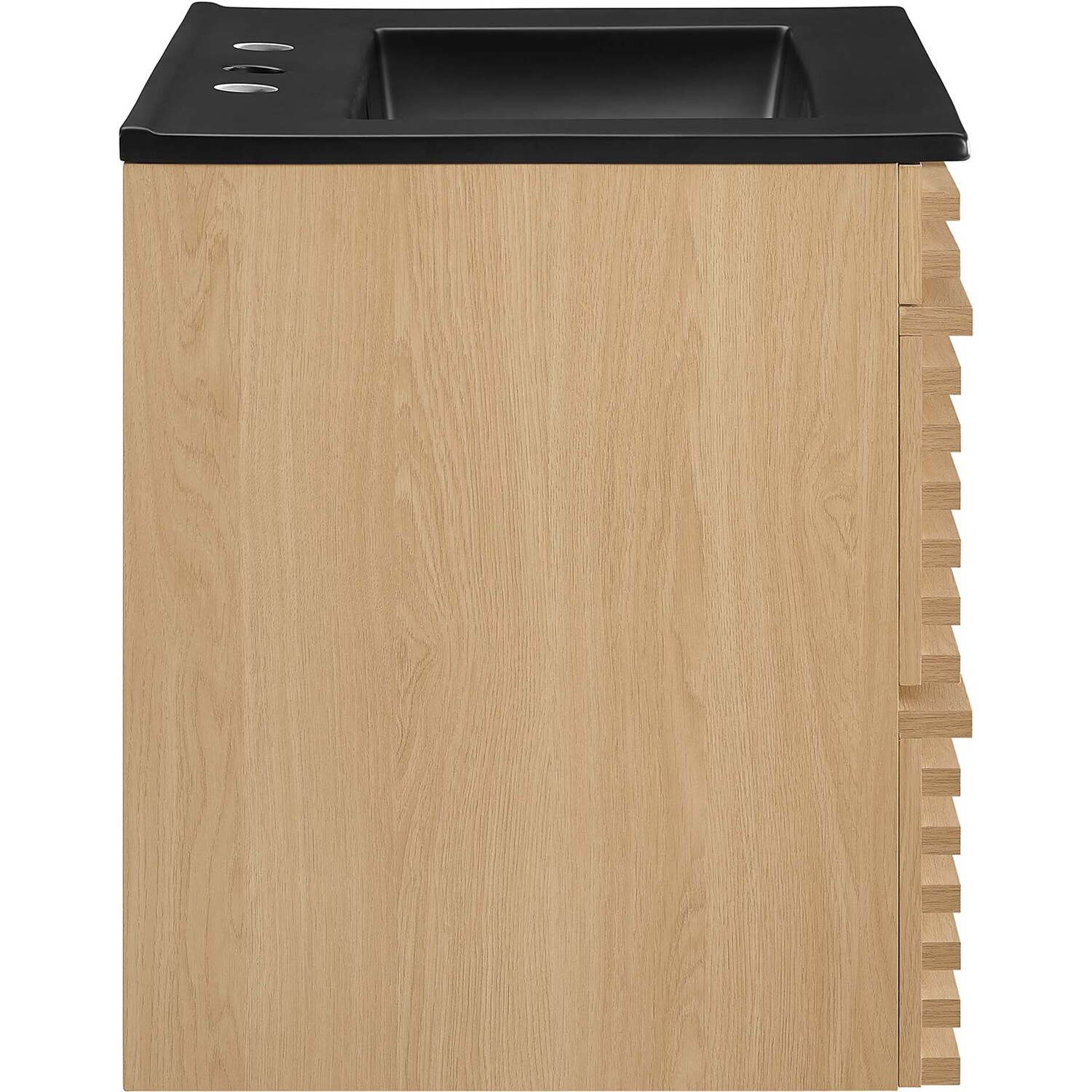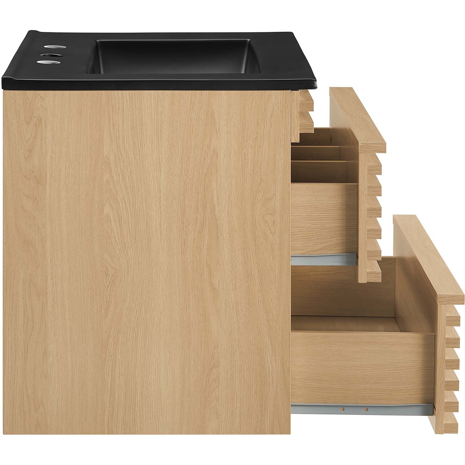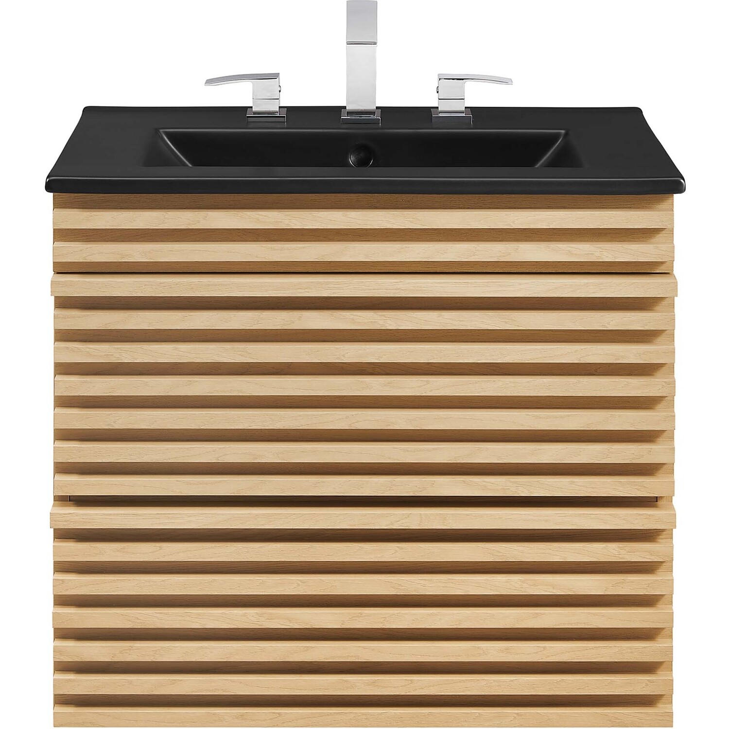 Tap into mid-century aesthetics with the Render Vanity. The Render 24" Bathroom Vanity features a durable MDF and particleboard frame with smooth walnut grain laminate, ample storage space in two full-extension drawers, and space-saving wall-mount design. Crafted with ceramic, a single sink with an integrated countertop, 8" centerset faucet holes, and rectangular sink basin continues the sleek look of this retro modern vanity. Clean lines and crisp design align for an edgy style designed to meet your needs. Boasting a mid-century modern style this vanity features a solid construction with a pleasing look and practical functionality. Assembly required and fixtures not included.Mid-Century Modern Vanity