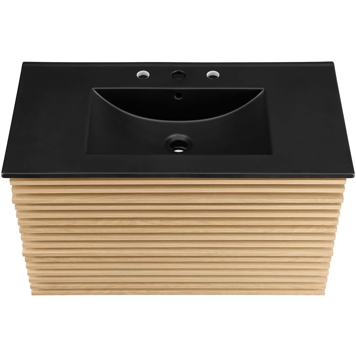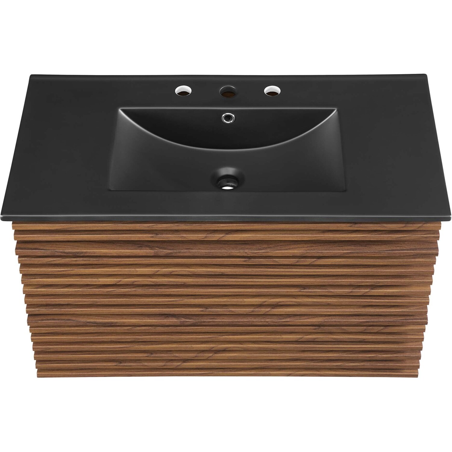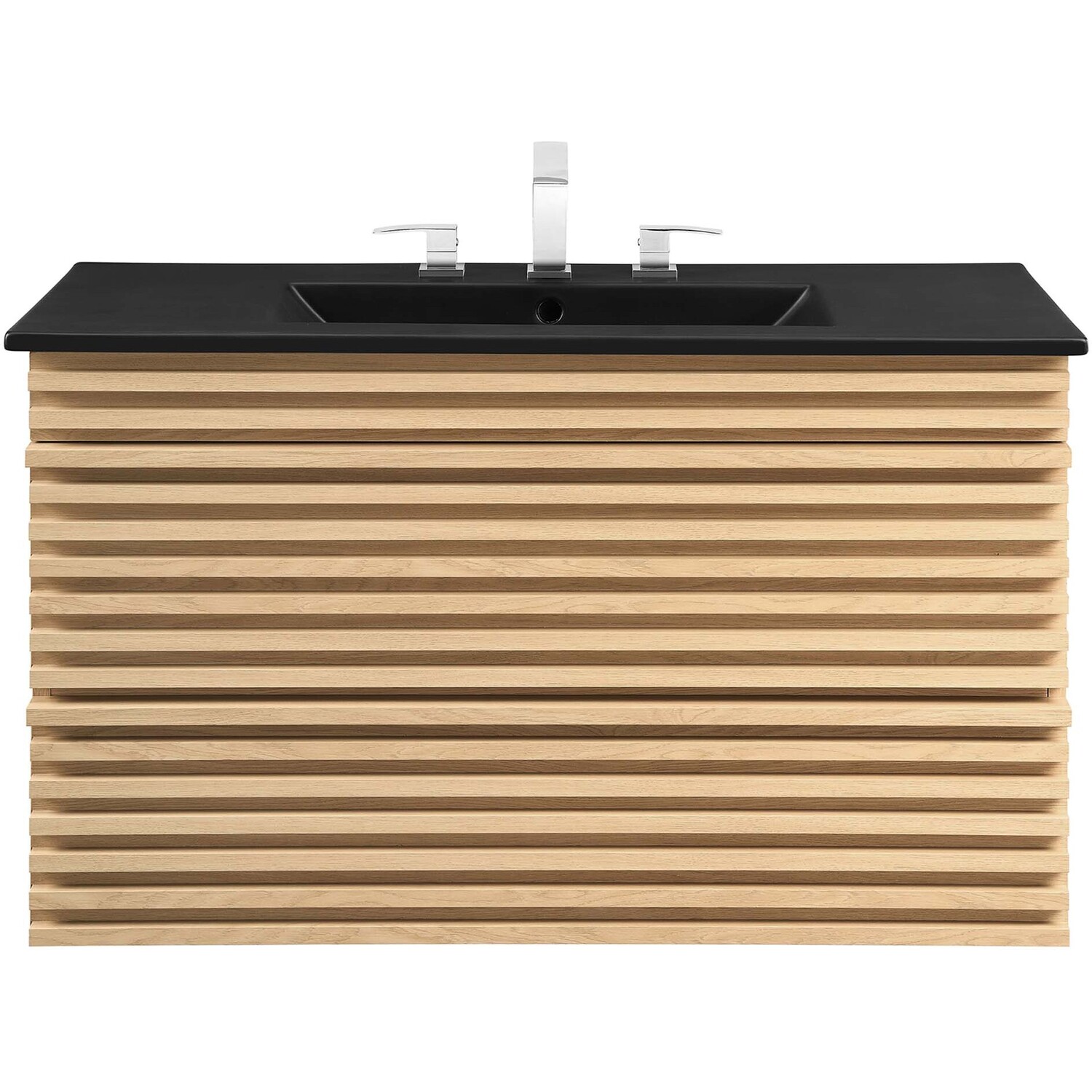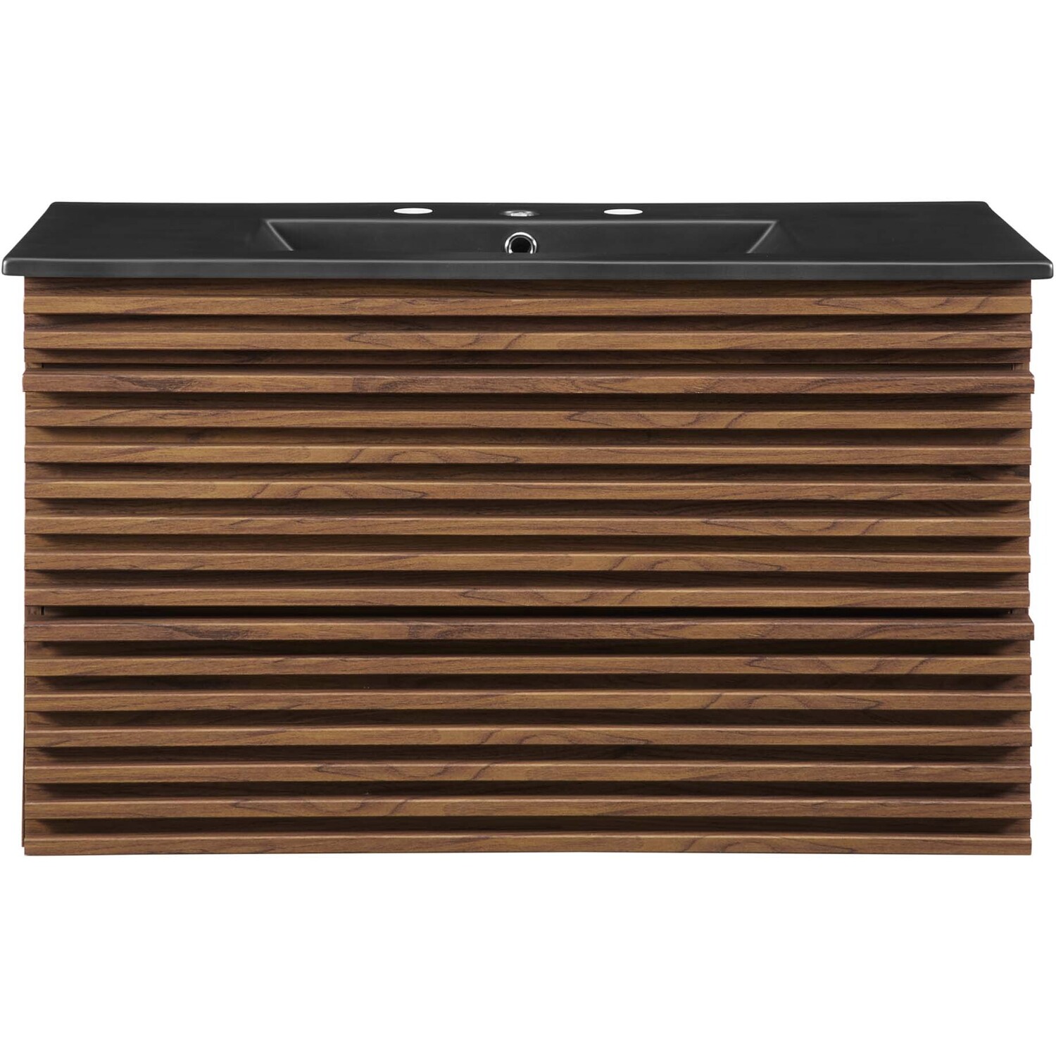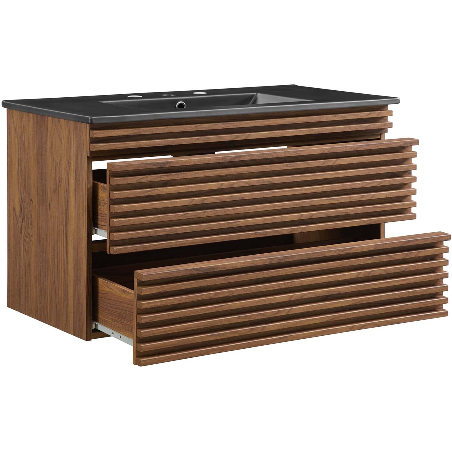 Tap into mid-century aesthetics with the Render Vanity. The Render 36" Bathroom Vanity features a durable MDF and particleboard frame with smooth walnut grain laminate, ample storage space in two full-extension drawers, and a space-saving wall-mount design. Crafted with ceramic, a single sink with an integrated countertop, 8" centerset faucet holes, and rectangular sink basin continues the sleek look of this retro modern vanity. Clean lines and crisp design align for an edgy style designed to meet your needs. Boasting a mid-century modern style this vanity features a solid construction with a pleasing look and practical functionality. Assembly required and fixtures not included.Mid-Century Modern Vanity