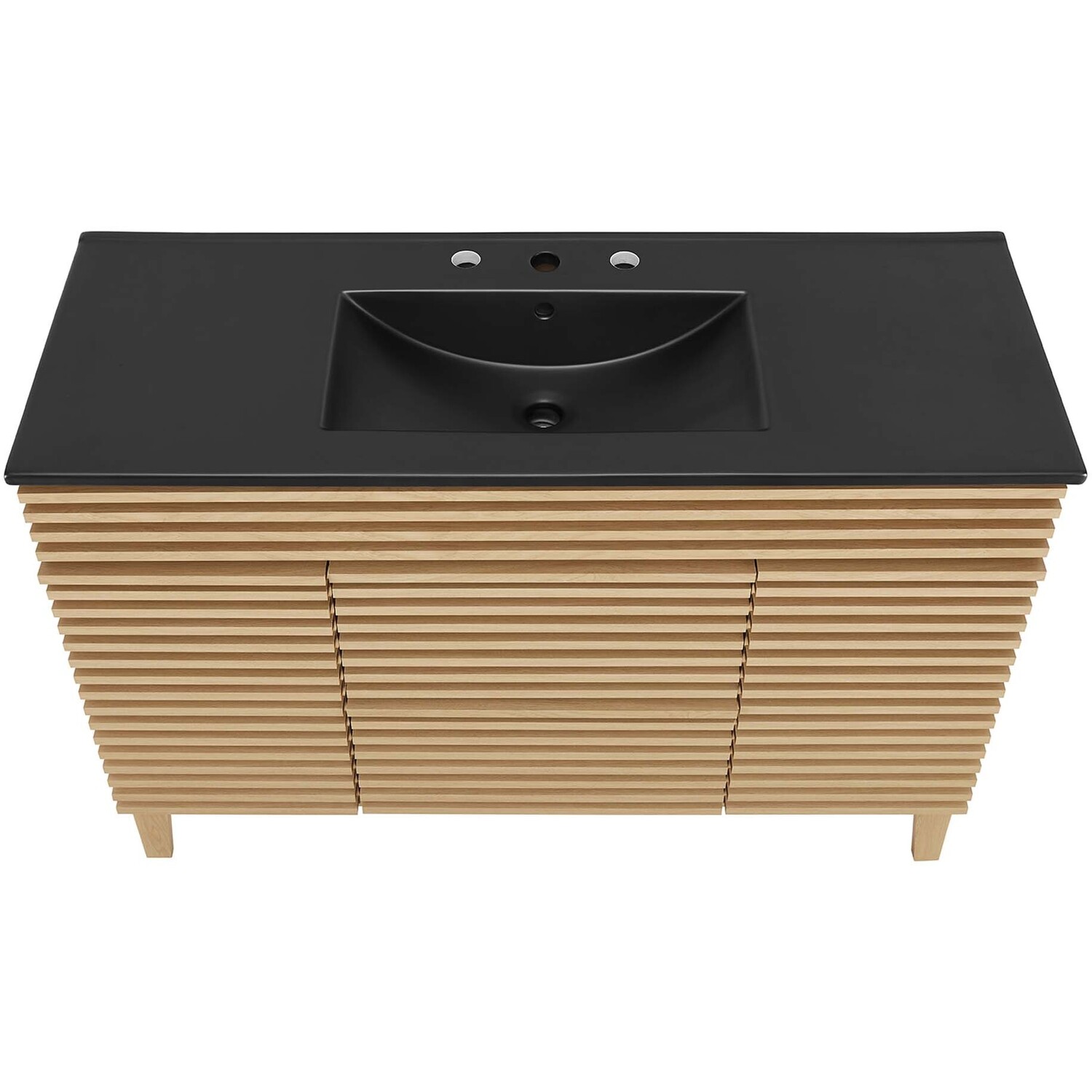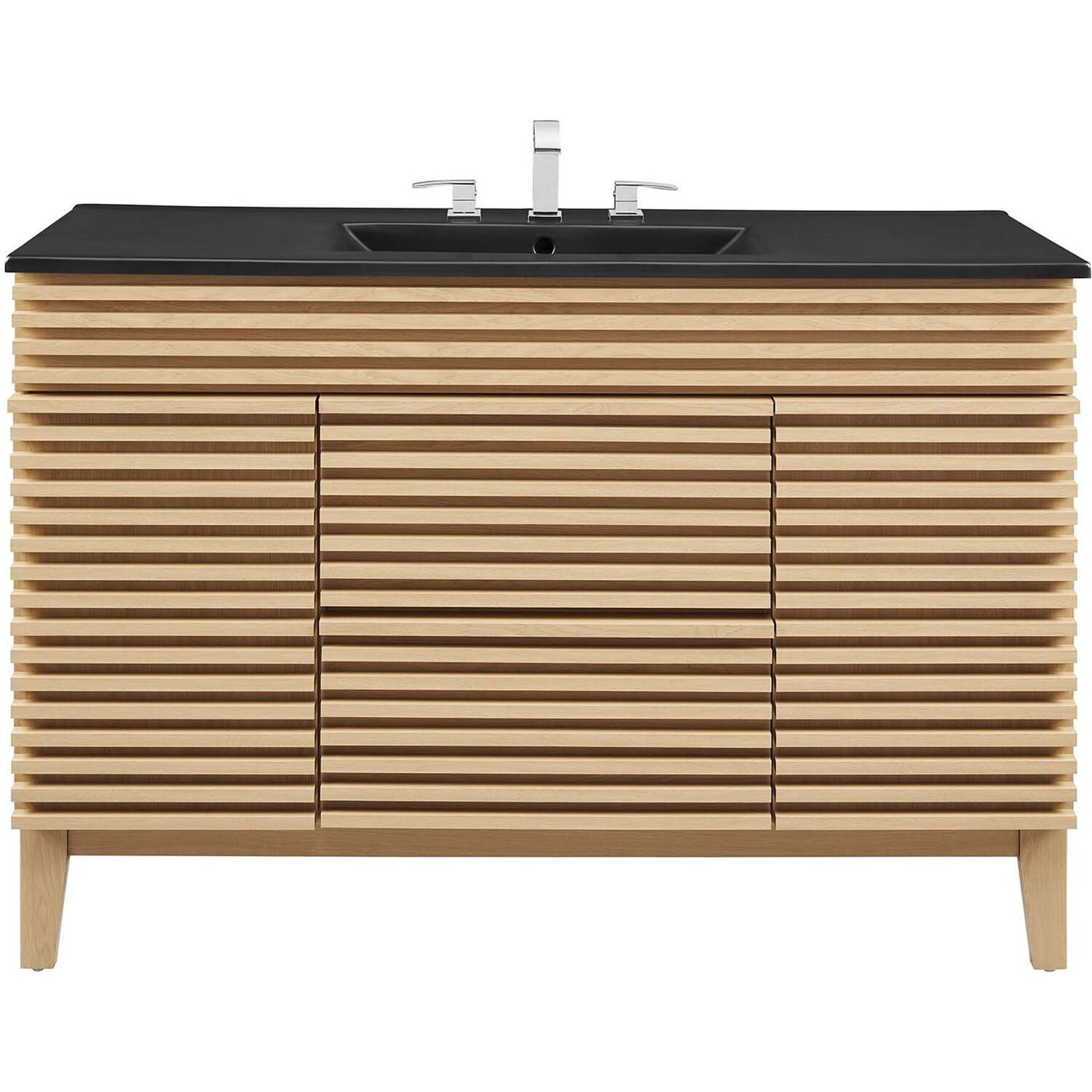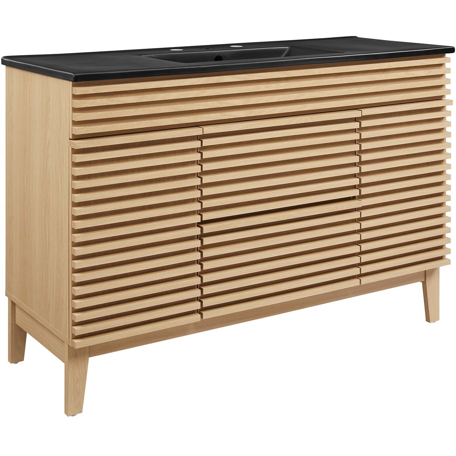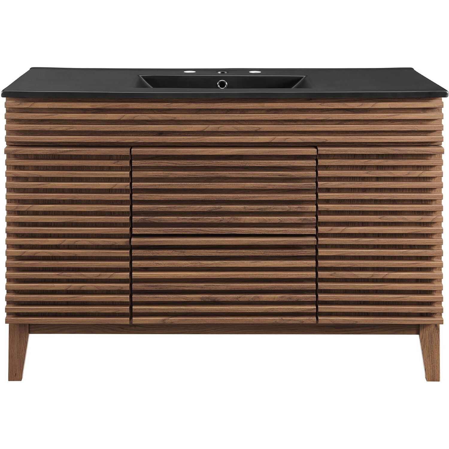Tap into mid-century aesthetics with the Render Vanity. The Render 48" Bathroom Vanity features a durable MDF and particleboard frame with smooth walnut grain laminate, four tapered wood legs, and ample under sink storage space in full-extension drawers and behind soft-close hinged doors. Crafted with ceramic, a single sink with an integrated countertop, 8" centerset faucet holes, and rectangular sink basin continues the sleek look of this retro modern vanity. Clean lines and crisp design align for an edgy style designed to meet your needs. Boasting a mid-century modern style this vanity features a solid construction with a pleasing look and practical functionality. Assembly required and fixtures not included.Mid-Century Modern Vanity