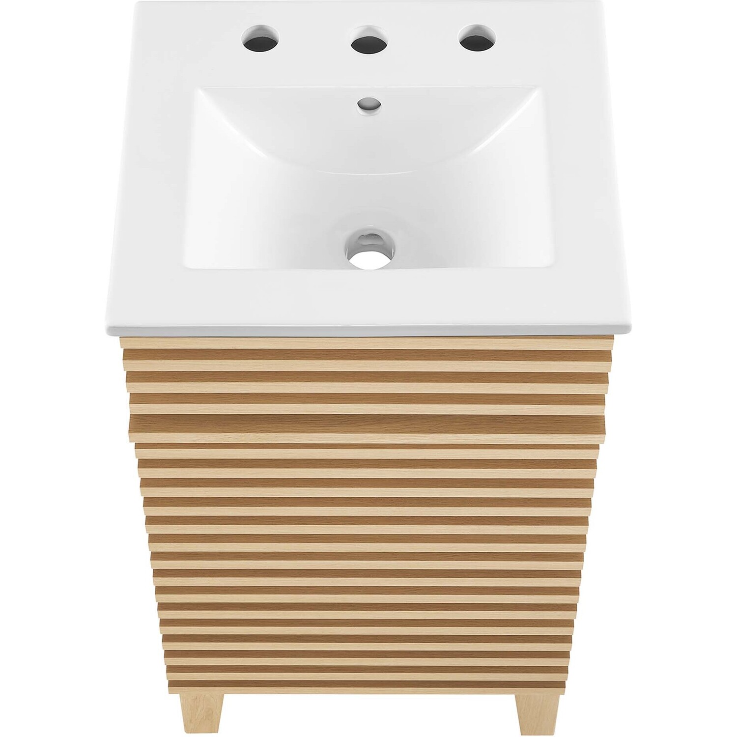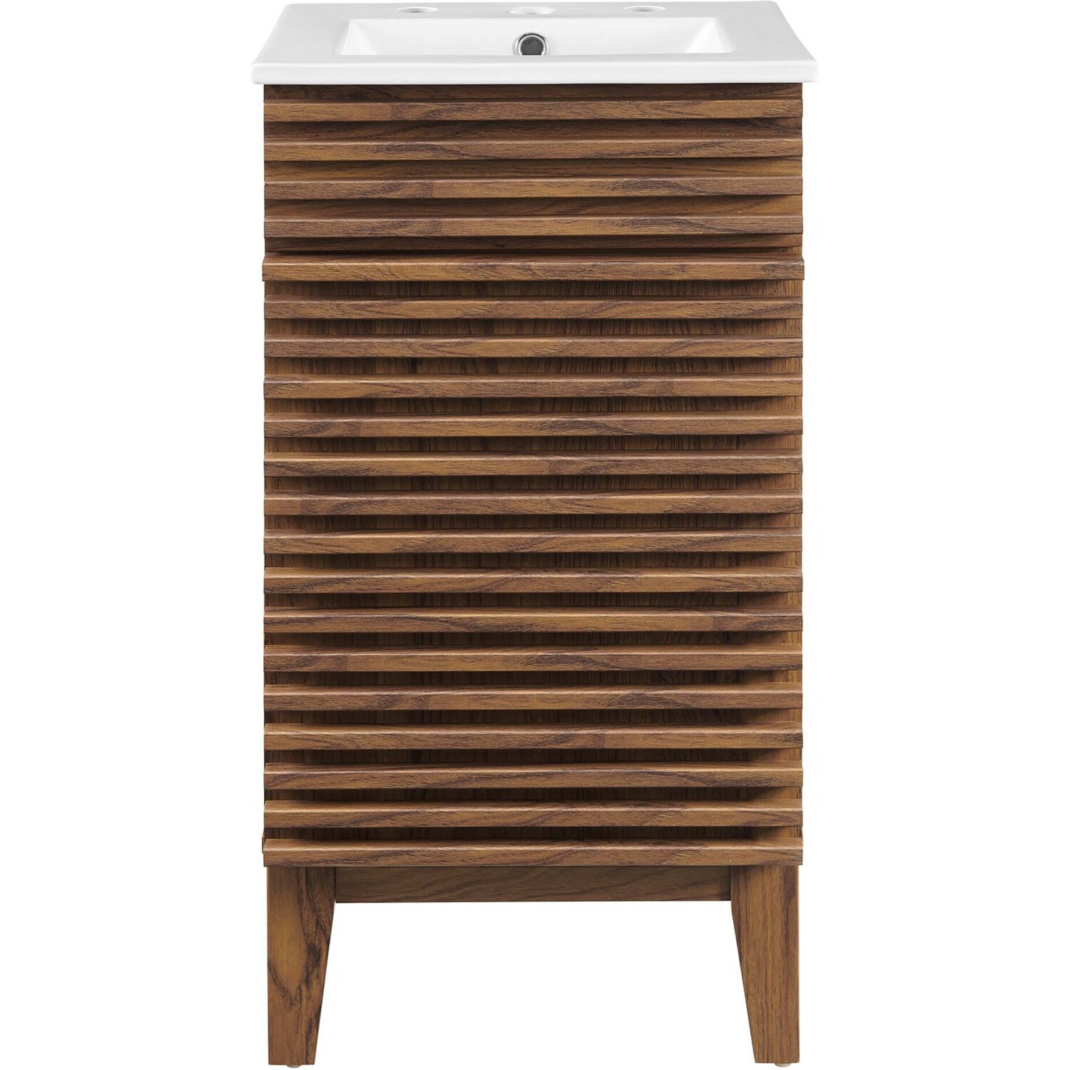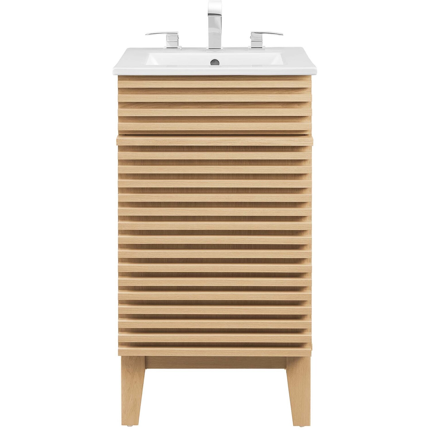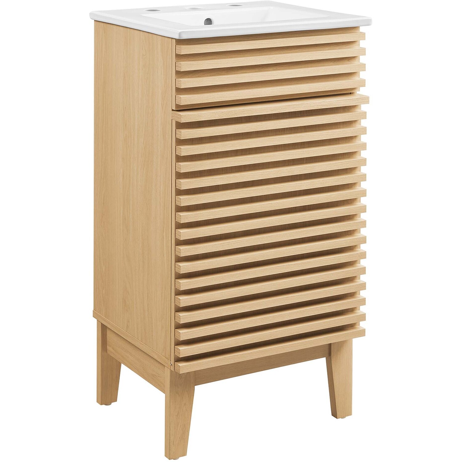 Tap into mid-century aesthetics with the Render Vanity. Render Bathroom Vanity features a durable particleboard frame with smooth laminate, four tapered wood legs, and adjustable storage shelf behind a soft-close hinged door. A curved ceramic basin and integrated countertop with three faucet holes create sleek lines and crisp design for an edgy style designed to meet your needs. Boasting a mid-century modern style this vanity features a solid construction with a pleasing look and practical functionality. 8" centerset faucet holes. Assembly required and fixtures not included.Mid-Century Modern Style