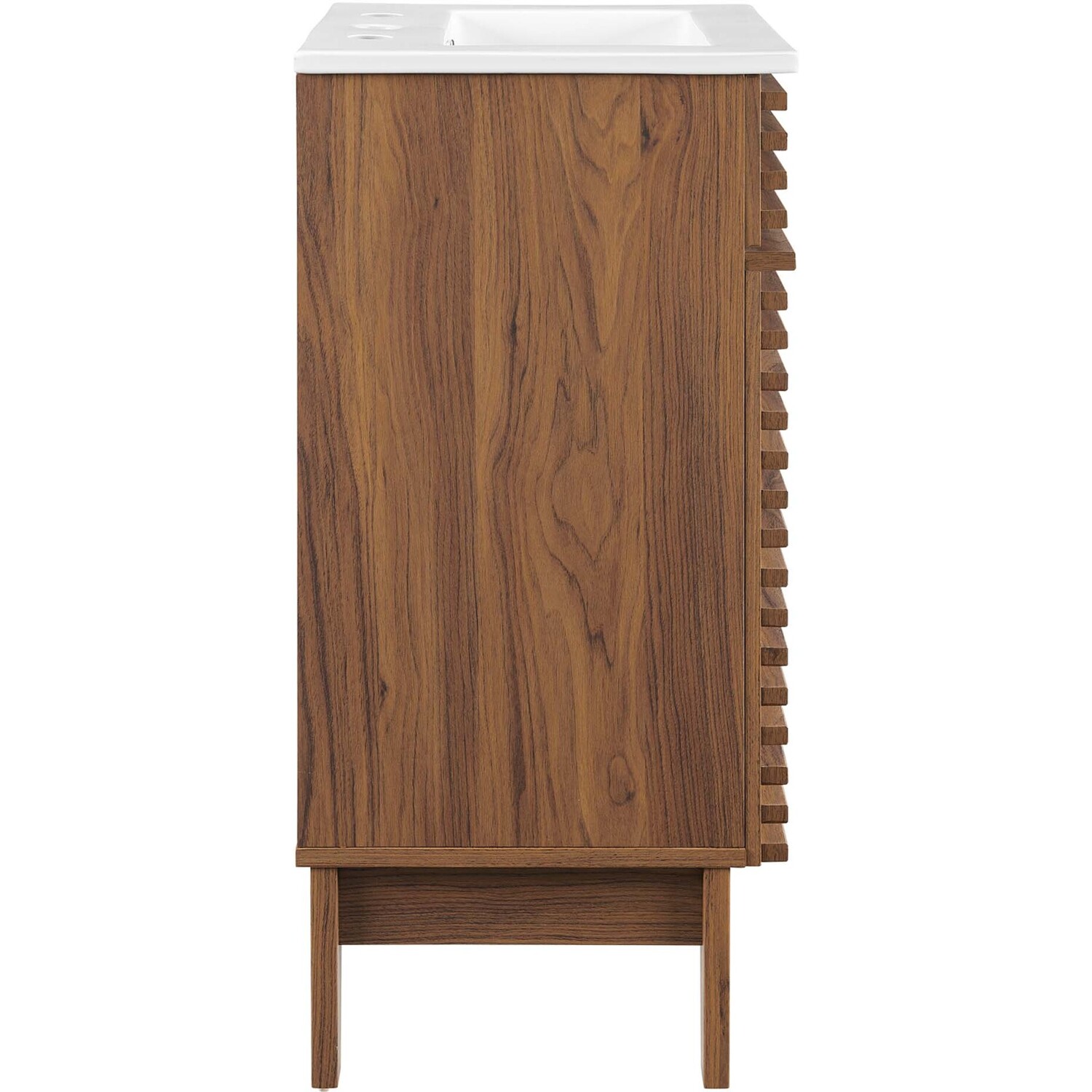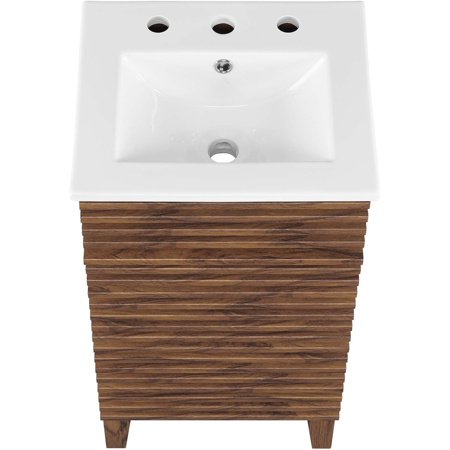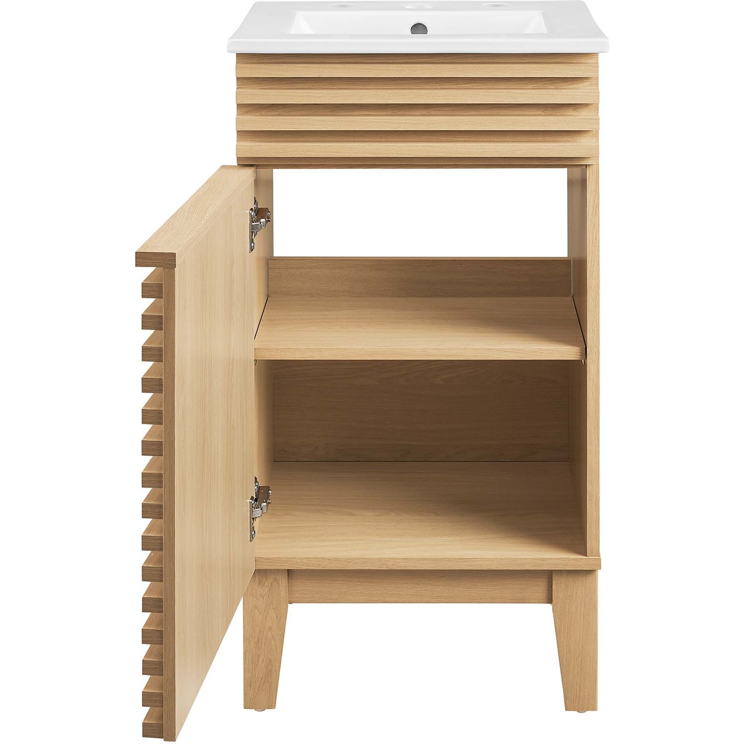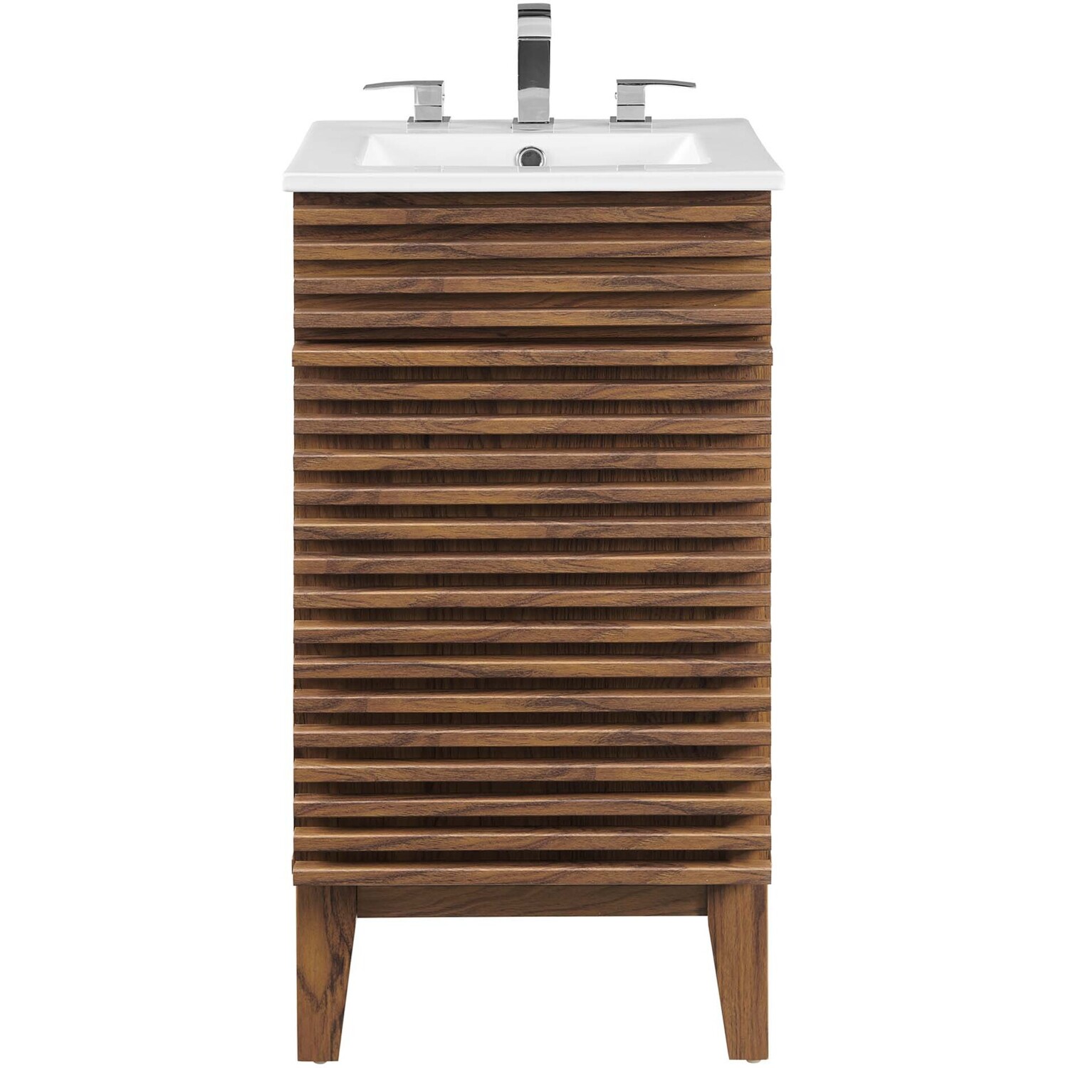 Tap into mid-century aesthetics with the Render Vanity. Render Bathroom Vanity features a durable particleboard frame with smooth laminate, four tapered wood legs, and adjustable storage shelf behind a soft-close hinged door. A curved ceramic basin and integrated countertop with three faucet holes create sleek lines and crisp design for an edgy style designed to meet your needs. Boasting a mid-century modern style this vanity features a solid construction with a pleasing look and practical functionality. 8" centerset faucet holes. Assembly required and fixtures not included.Mid-Century Modern Style