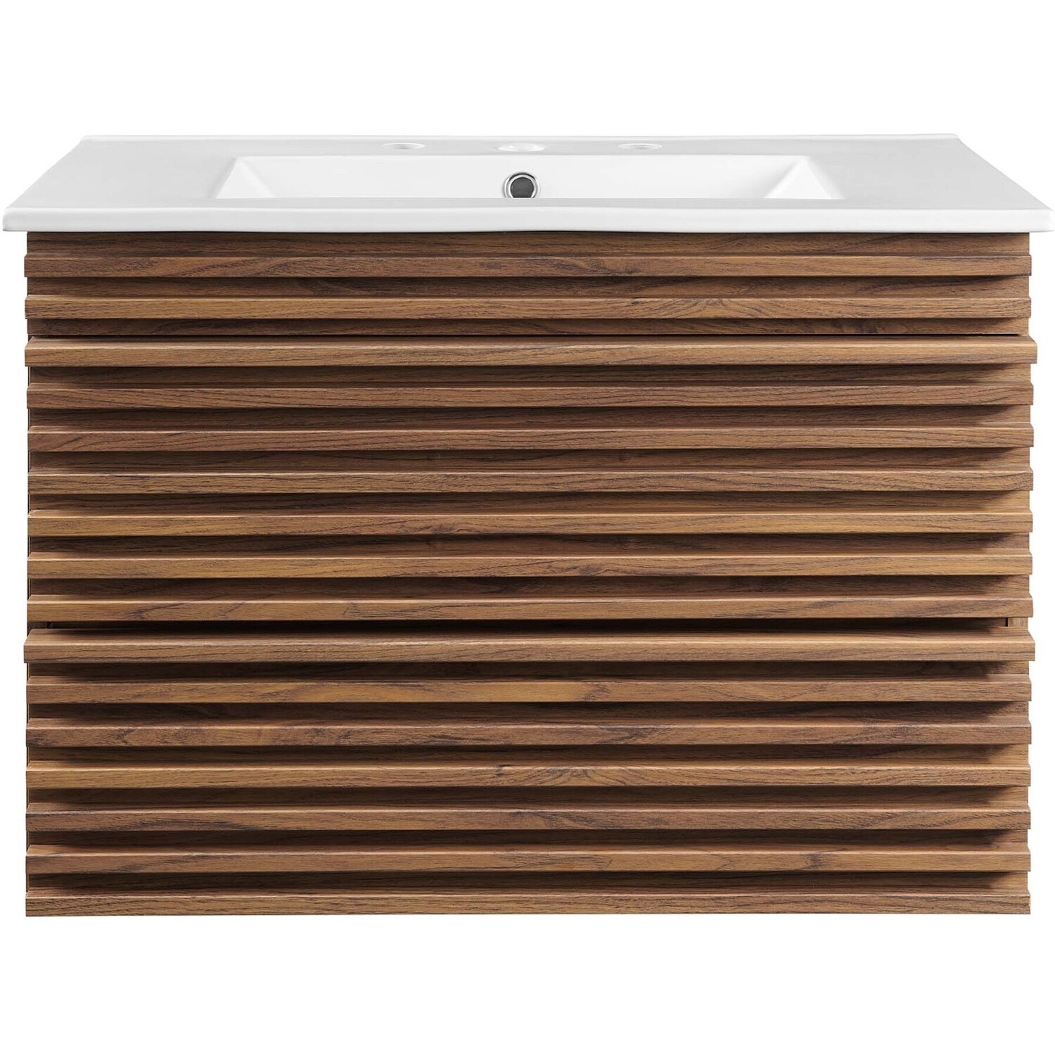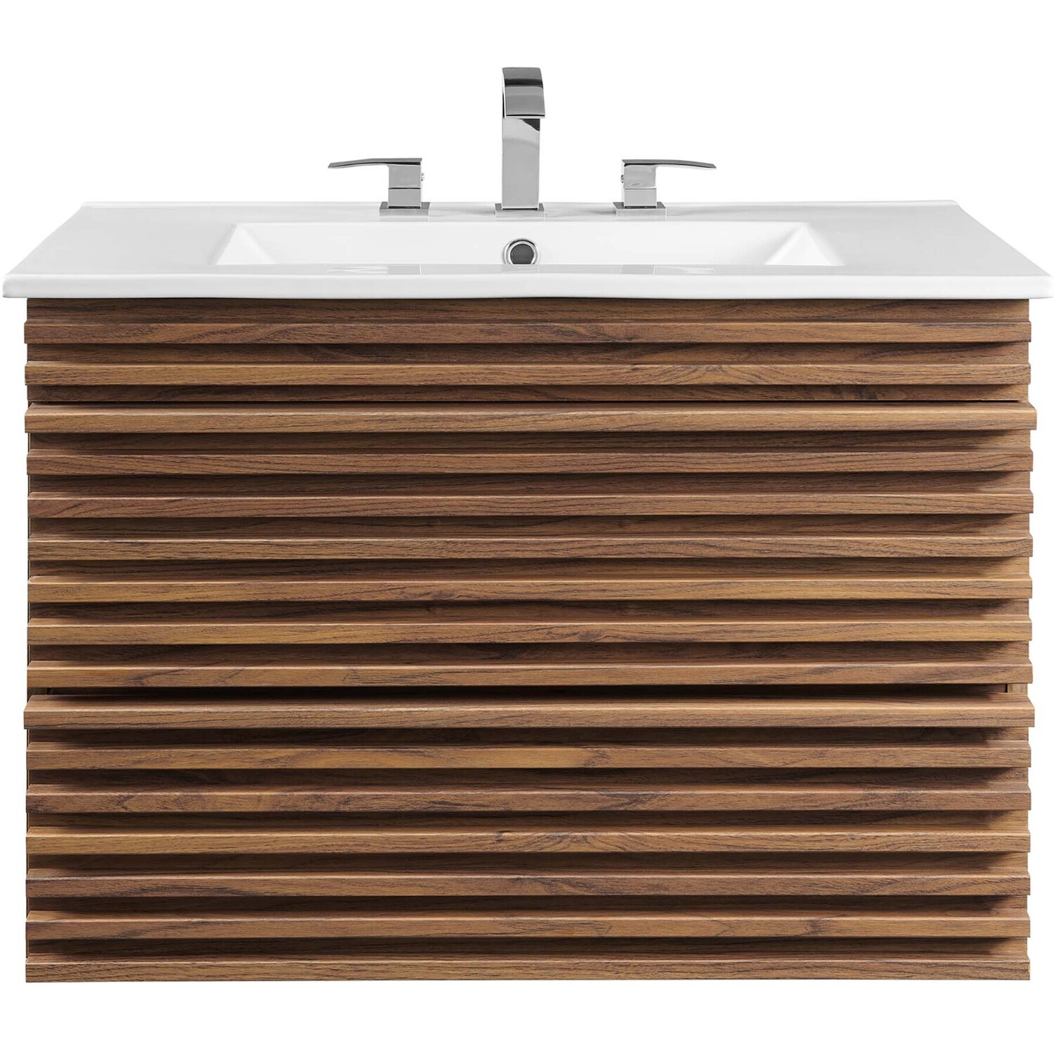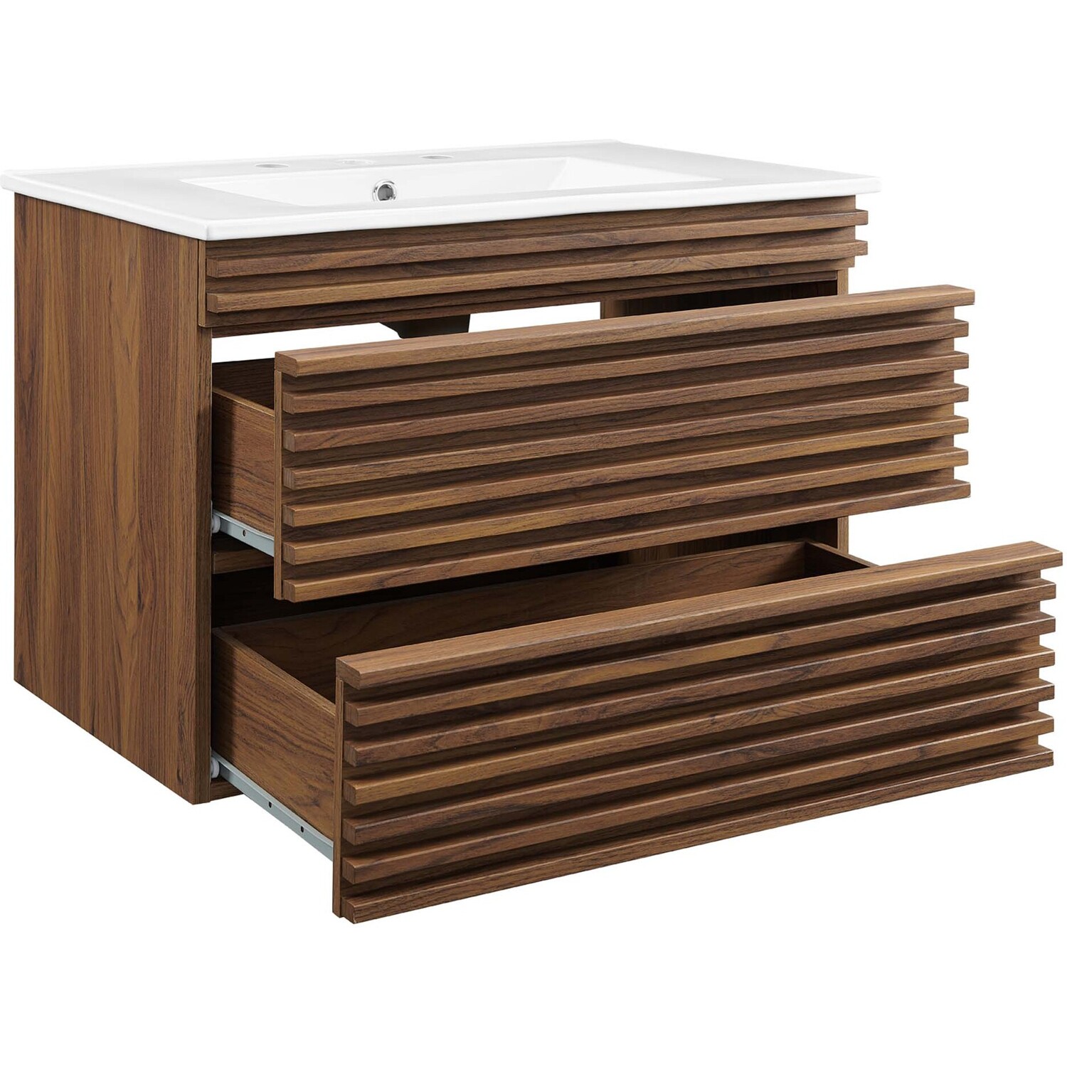 Tap into mid-century aesthetics with the Render Vanity. The Render 30" Bathroom Vanity features a durable MDF and particleboard frame with smooth walnut grain laminate, ample storage space in two full-extension drawers, and space-saving wall-mount design. Crafted with ceramic, a single sink with an integrated countertop, 8" centerset faucet holes, and rectangular sink basin continue the sleek look of this retro modern vanity. Clean lines and crisp design align for an edgy style designed to meet your needs. Boasting a mid-century modern style this vanity features a solid construction with a pleasing look and practical functionality. Assembly required and fixtures not included.Mid-Century Modern Vanity
