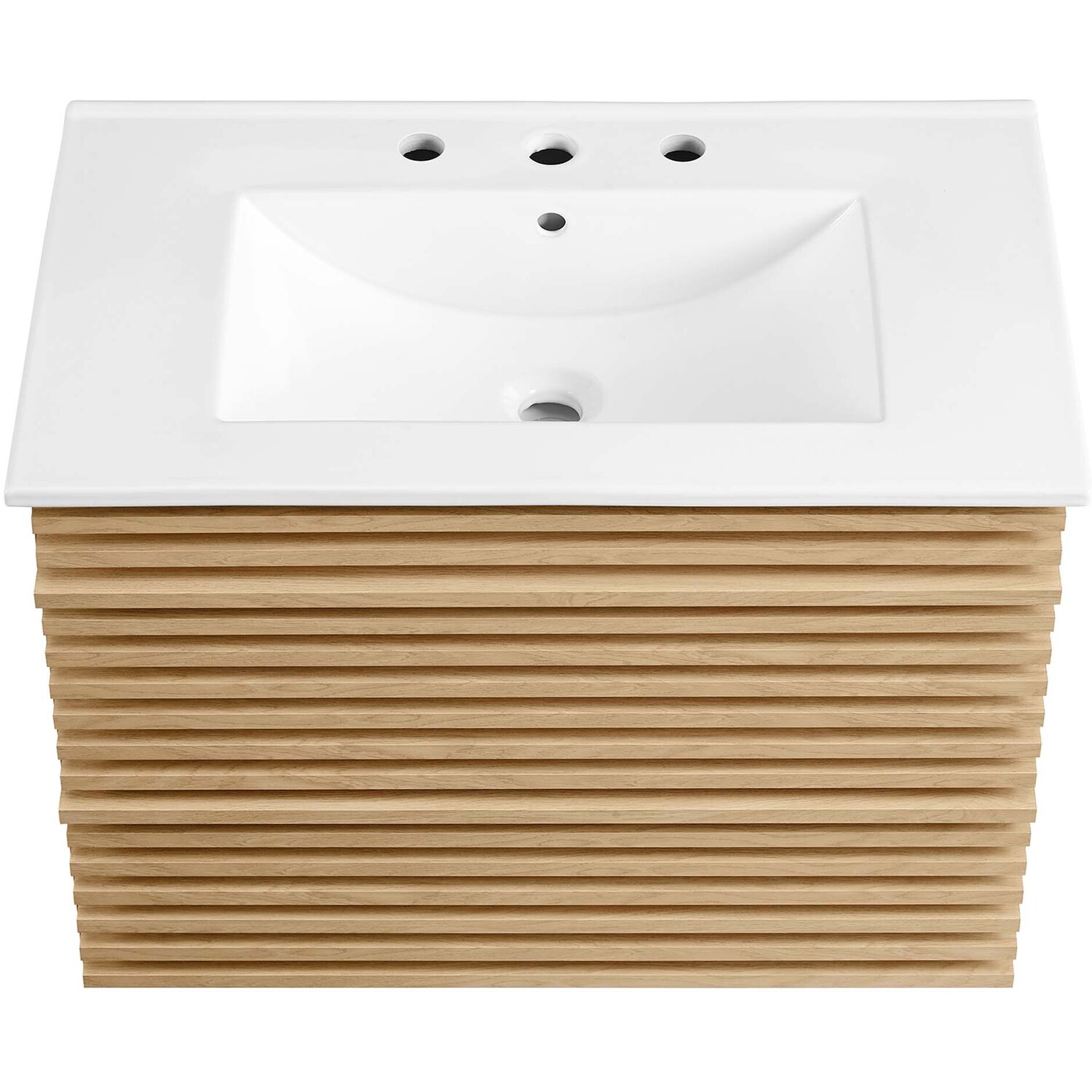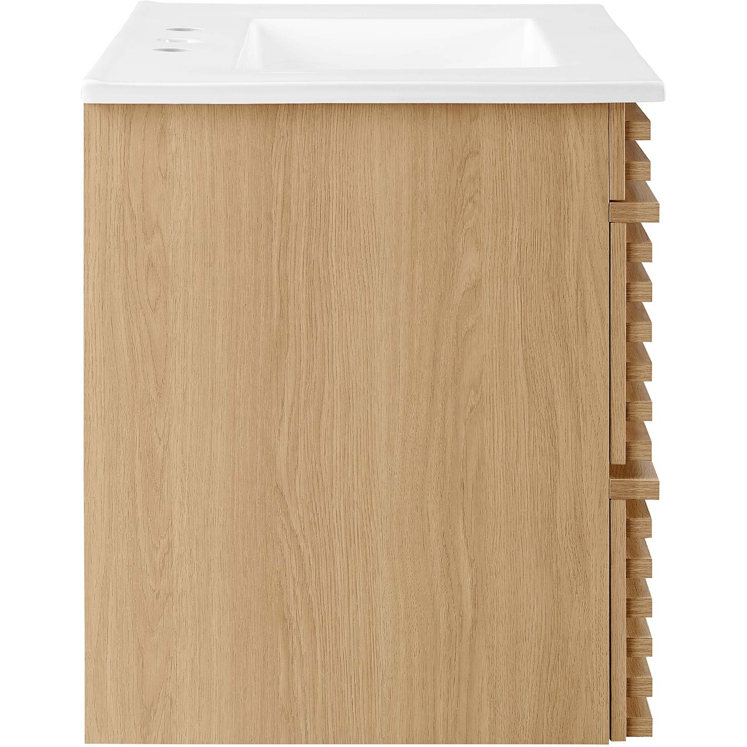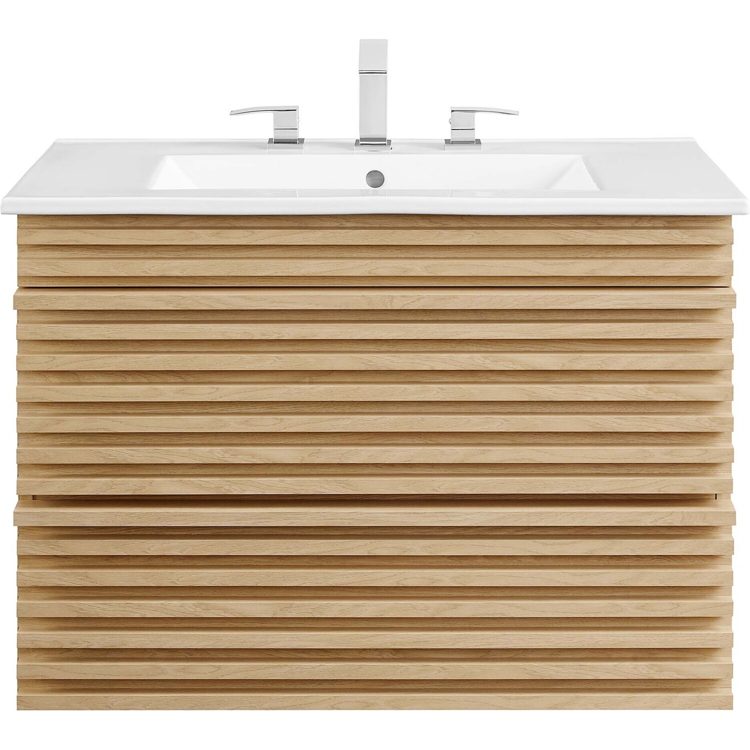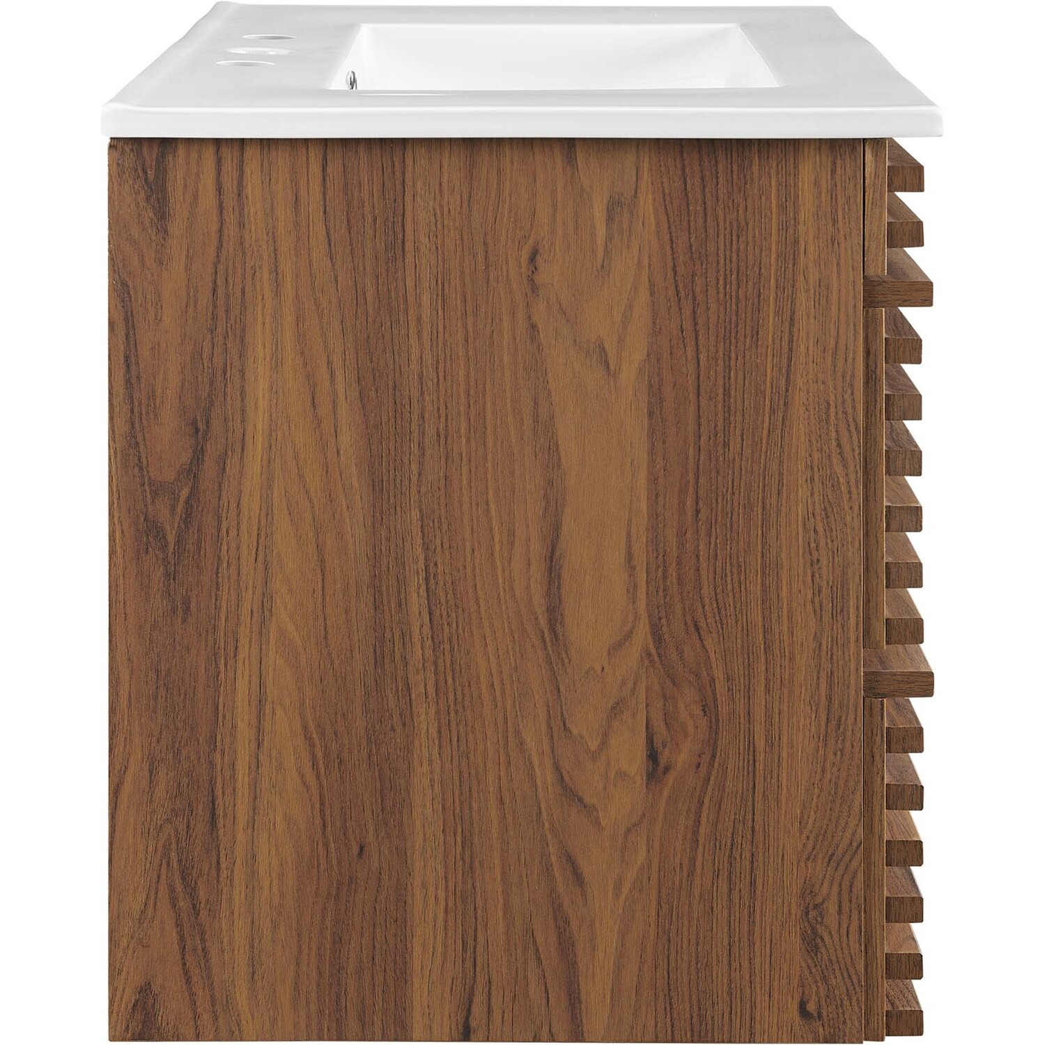 Tap into mid-century aesthetics with the Render Vanity. The Render 30" Bathroom Vanity features a durable MDF and particleboard frame with smooth walnut grain laminate, ample storage space in two full-extension drawers, and space-saving wall-mount design. Crafted with ceramic, a single sink with an integrated countertop, 8" centerset faucet holes, and rectangular sink basin continue the sleek look of this retro modern vanity. Clean lines and crisp design align for an edgy style designed to meet your needs. Boasting a mid-century modern style this vanity features a solid construction with a pleasing look and practical functionality. Assembly required and fixtures not included.Mid-Century Modern Vanity