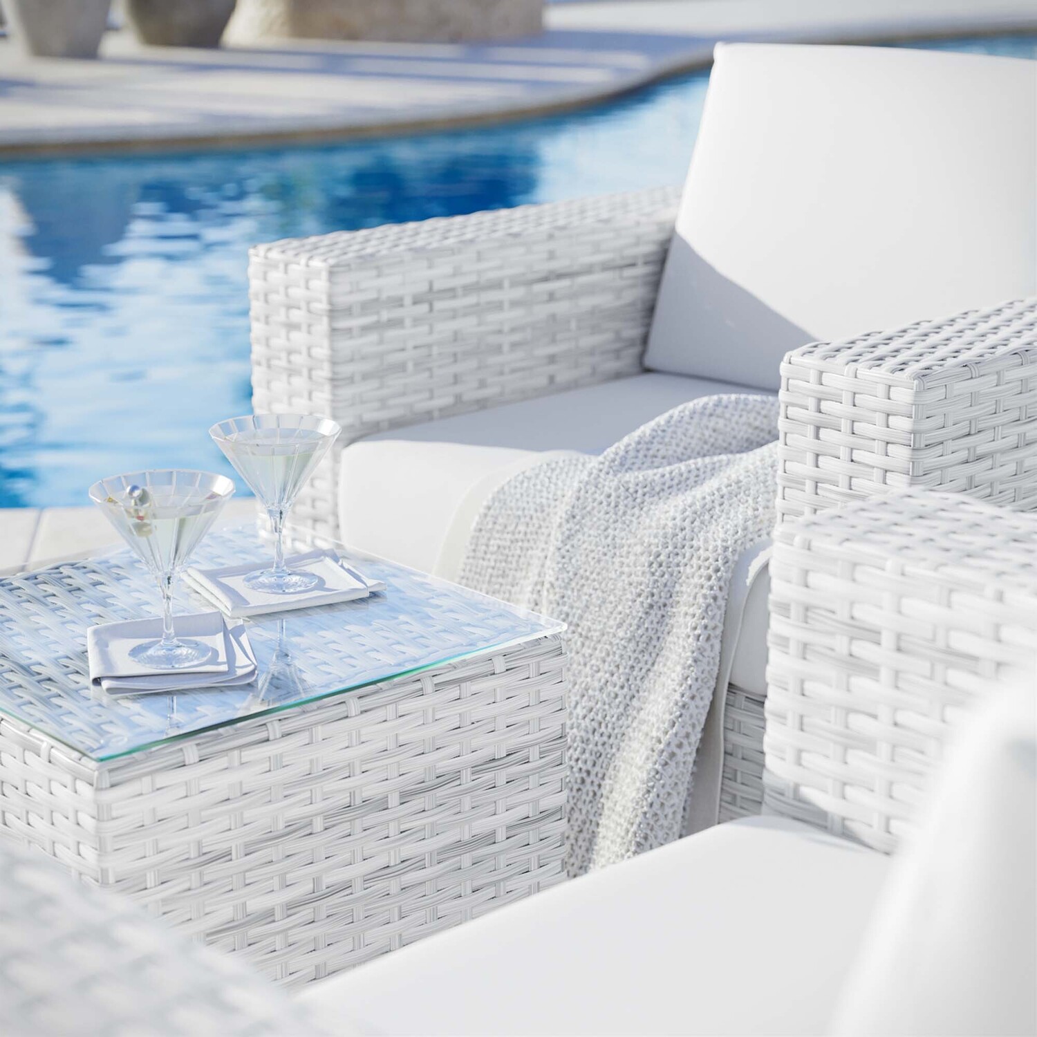 Gather stages of sensitivity with the Convene Outdoor Series. Made with a synthetic rattan weave and a powder-coated aluminum frame, Convene is a versatile outdoor furniture set that shifts and combines according to the spontaneous needs of the moment. Outfitted with all-weather fabric cushions, the Convene Sectional Set leaves a positive impression on friends and family while enhancing your patio, backyard, or poolside retreat with palpable distinction. This outdoor patio furniture set includes two armchairs and a side table.Outdoor Patio Furniture Set