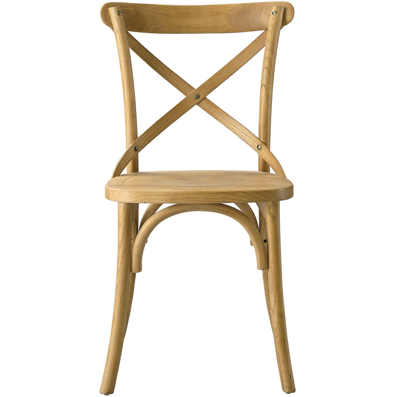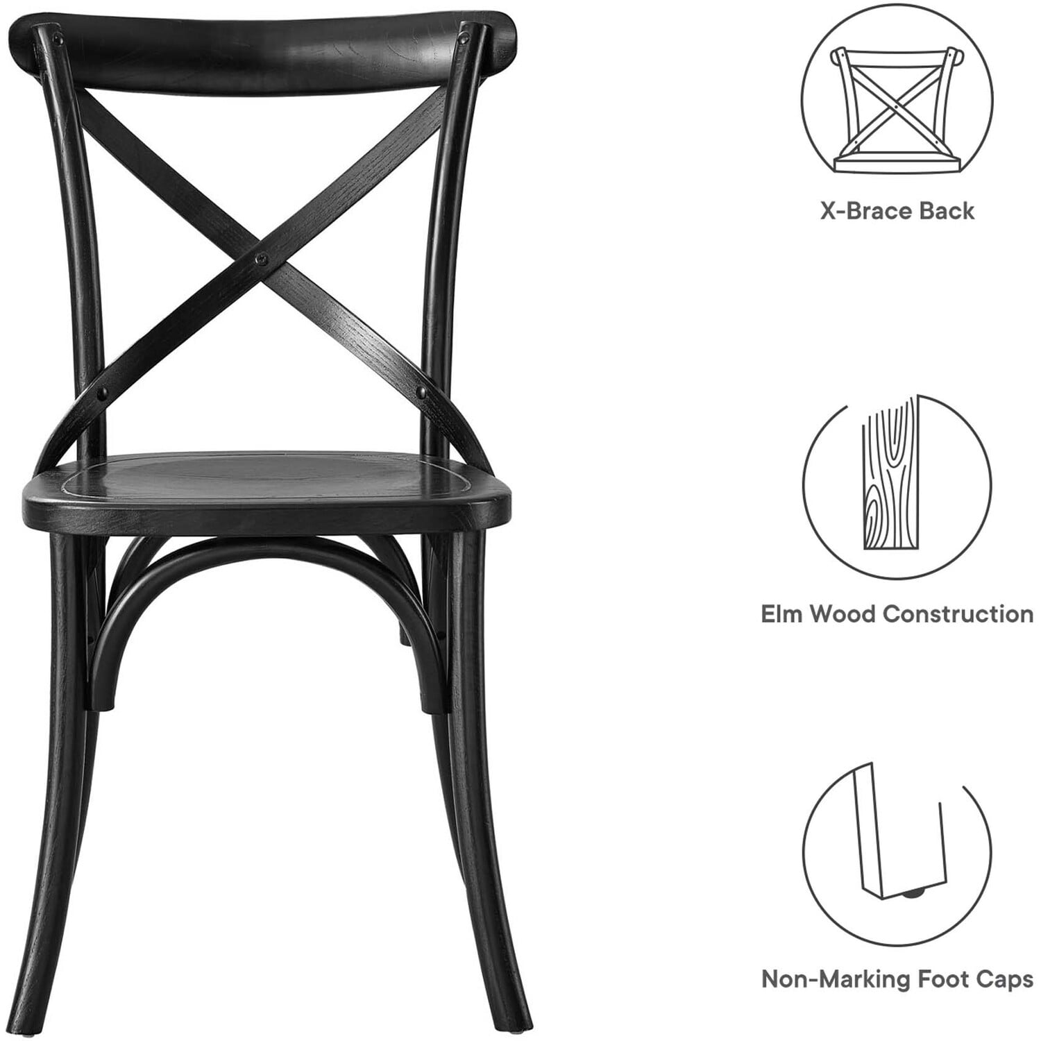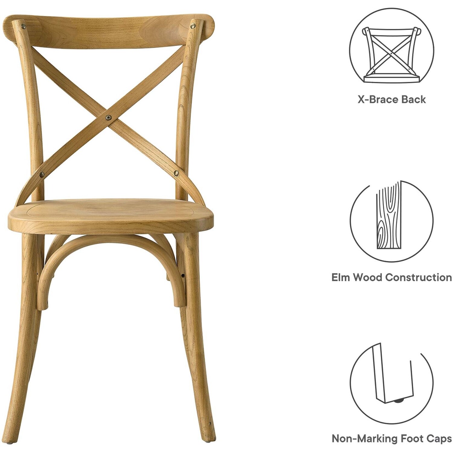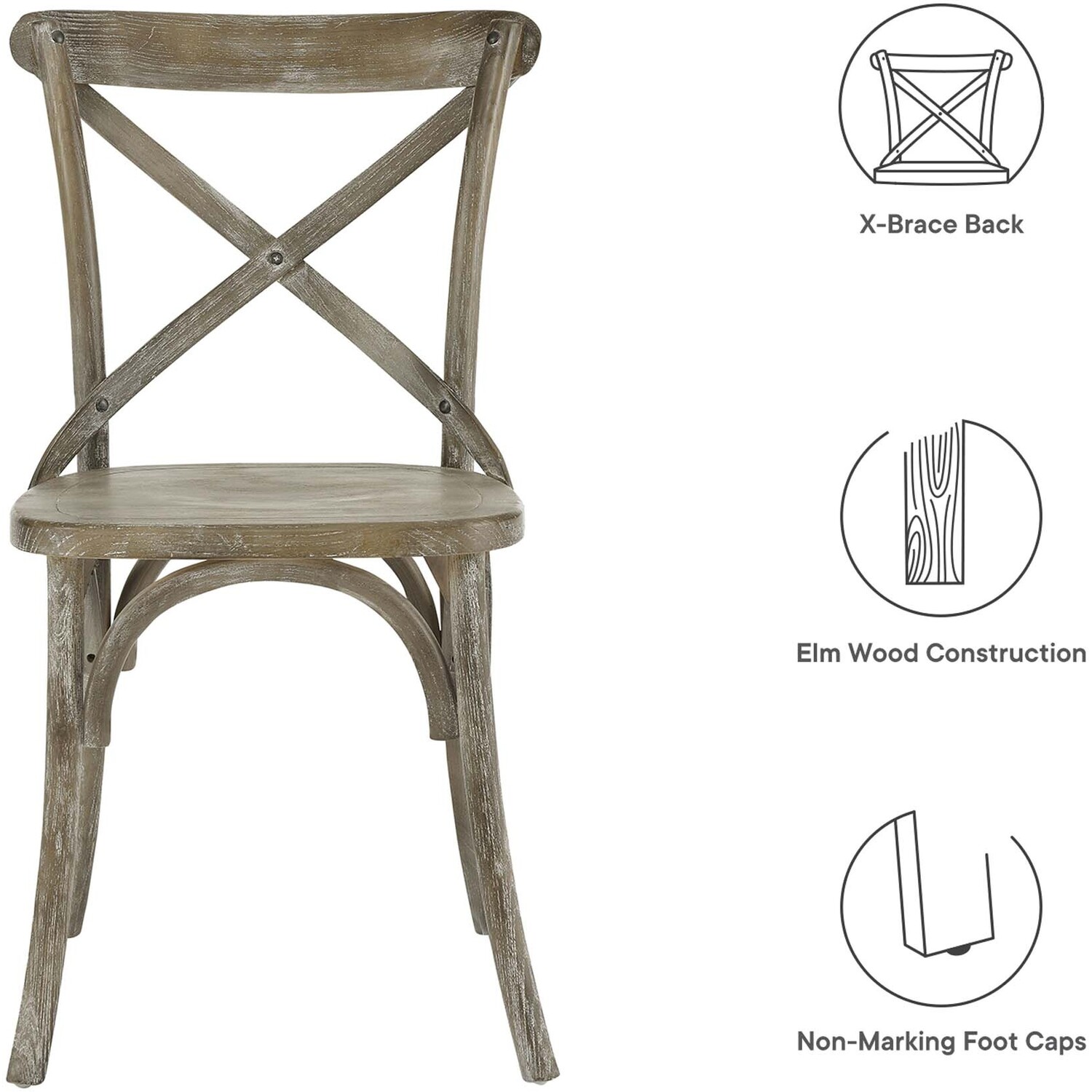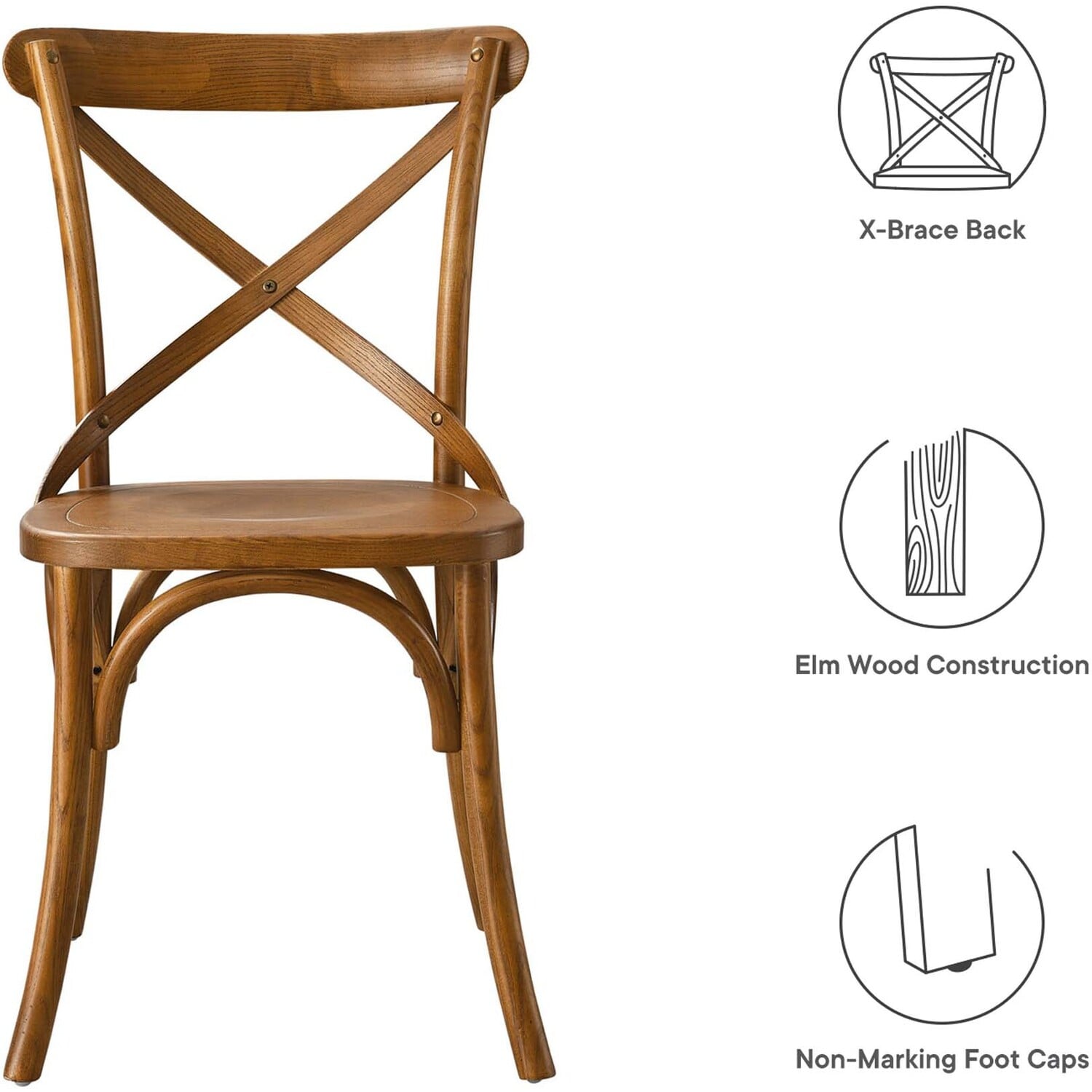 Introduce feelings of nostalgia as you gather around the dining table for a quick breakfast or dinner with friends with the Gear Dining Side Chair. Blending farmhouse charm with modern style, this dining chair features an X-brace back and stretchers between splayed legs. With non-marking foot caps to protect flooring, this side chair is durably crafted with durable elm wood for a sturdy construction built to last. Make a statement in your dining space or kitchen nook with this versatile wood dining chair that can also be used as an accent chair in a living room or desk chair in a home office. Weight Capacity: 330 lbs.Modern Farmhouse Dining Side Chair