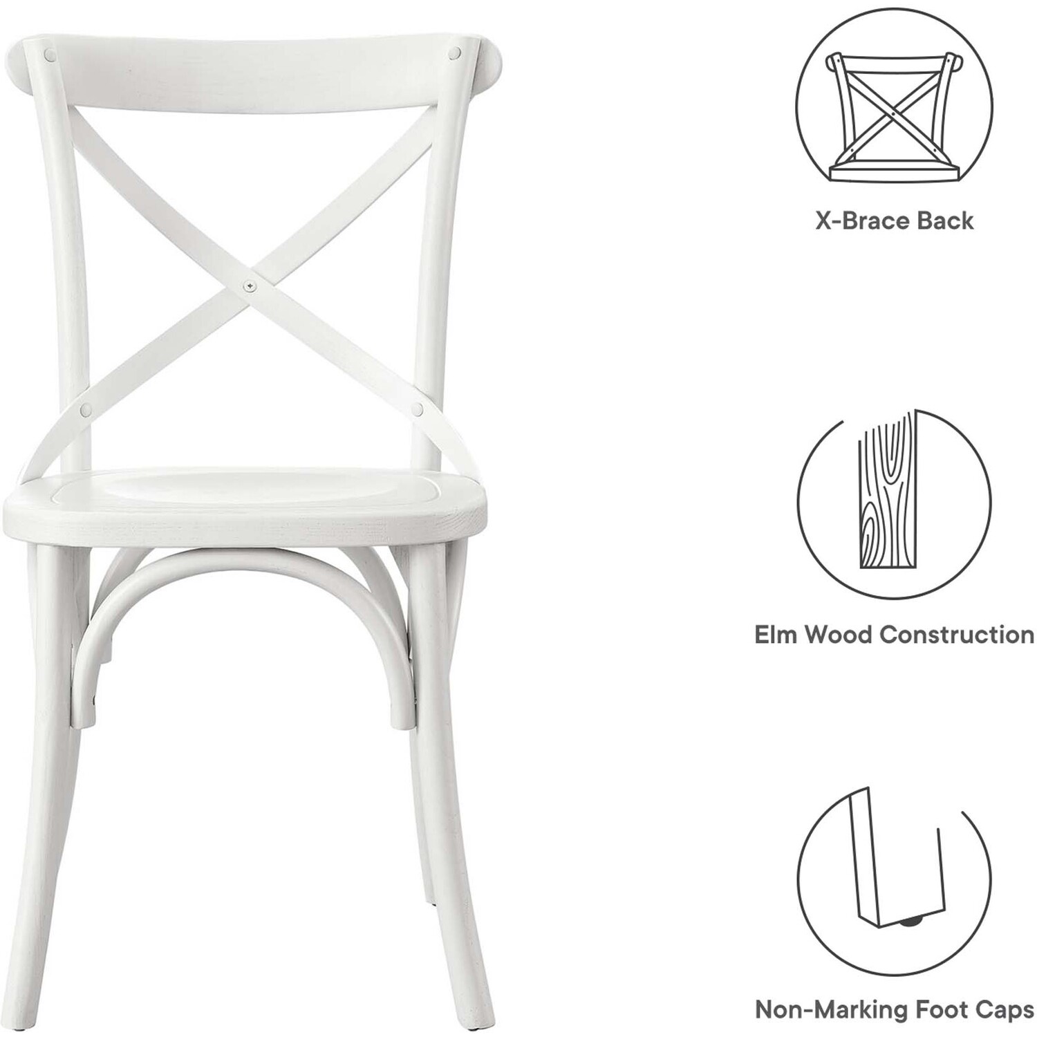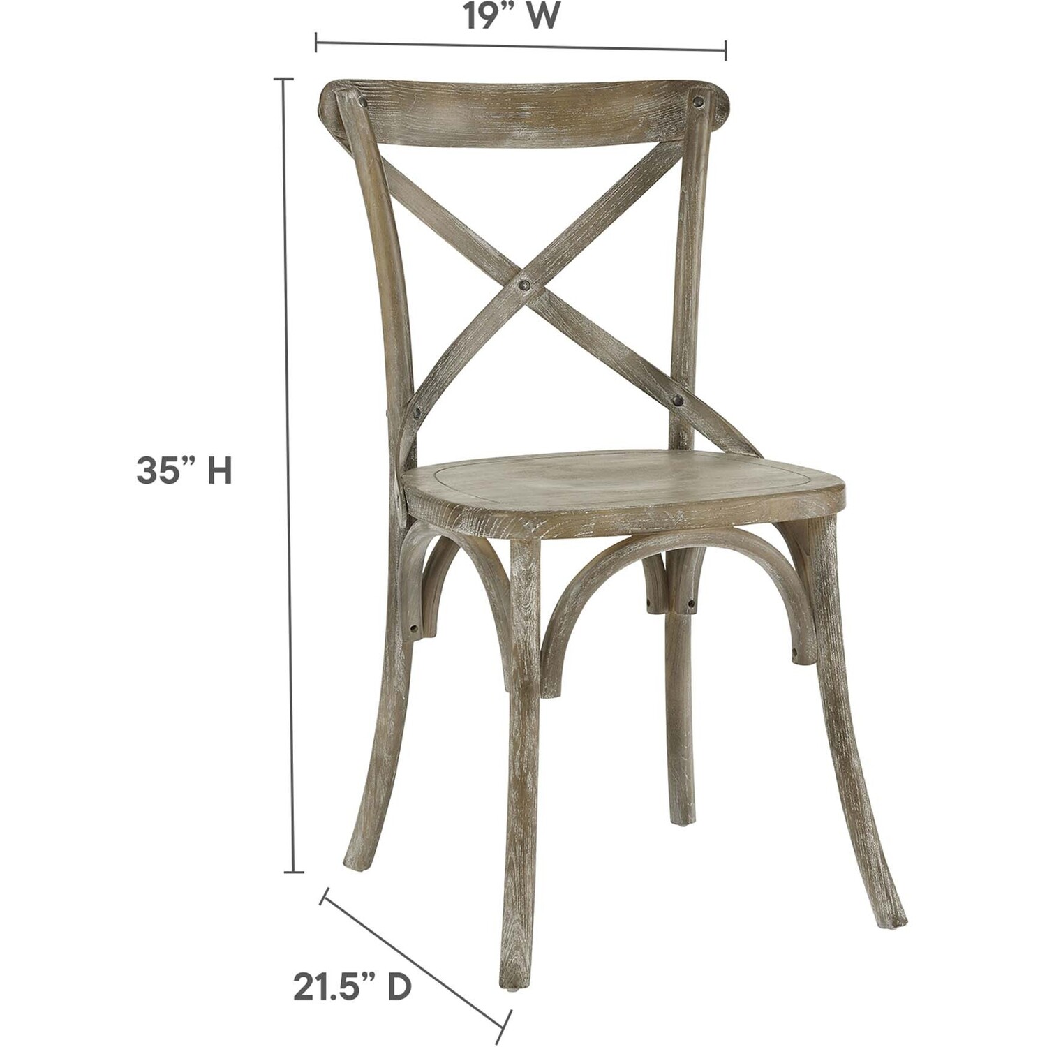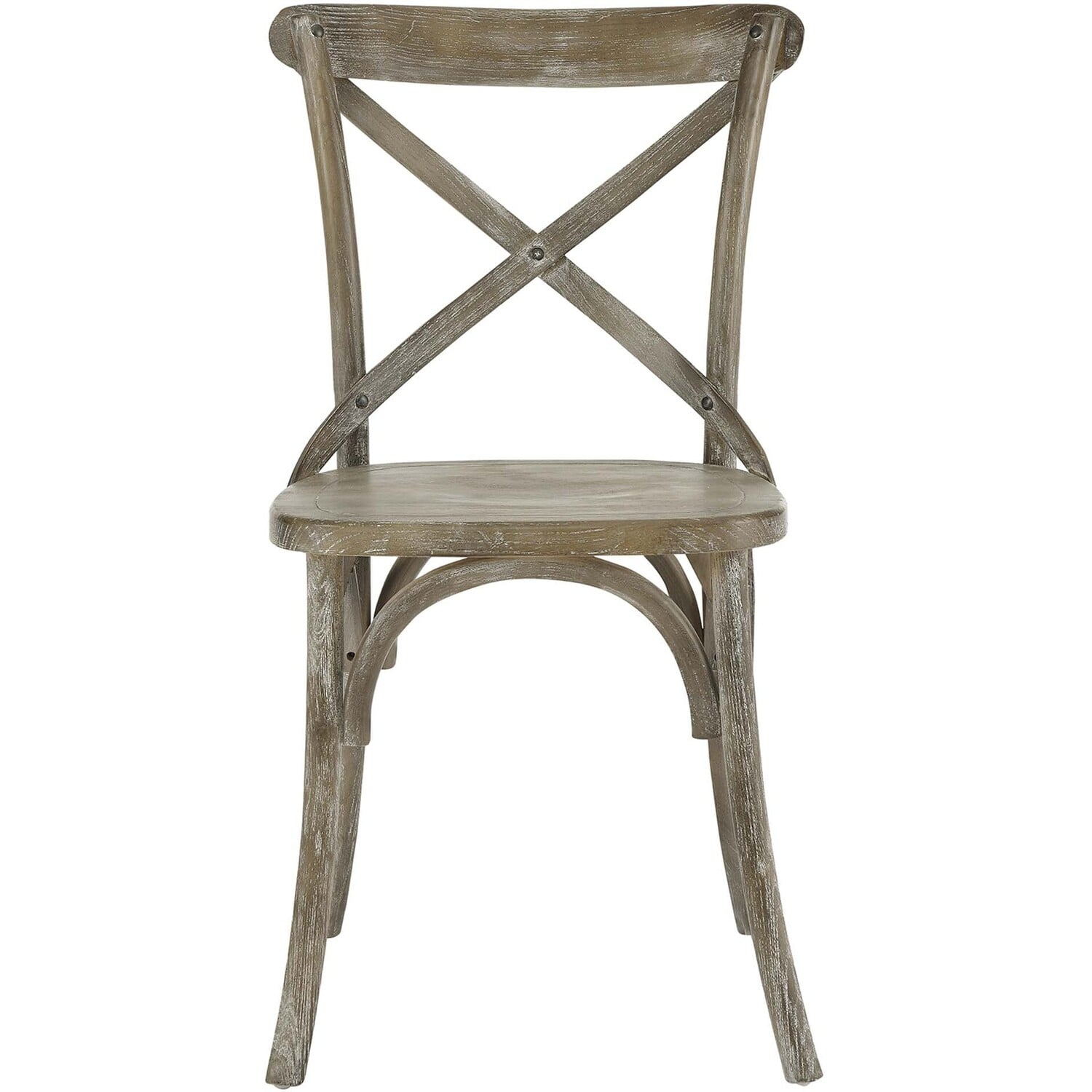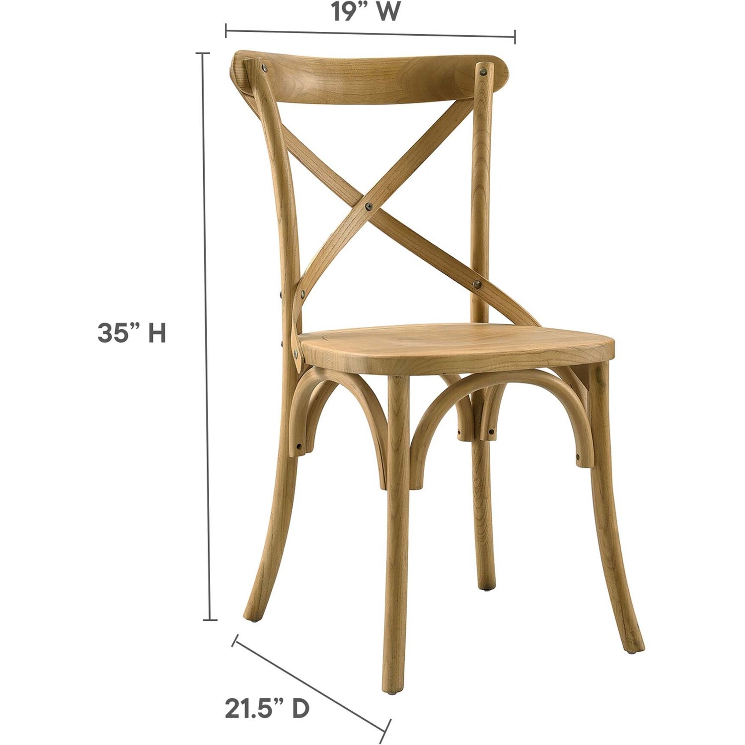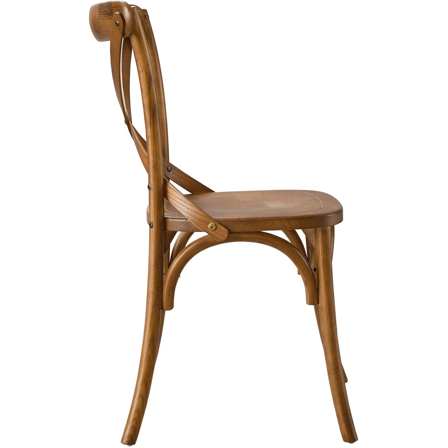 Introduce feelings of nostalgia as you gather around the dining table for a quick breakfast or dinner with friends with the Gear Dining Side Chair. Blending farmhouse charm with modern style, this dining chair features an X-brace back and stretchers between splayed legs. With non-marking foot caps to protect flooring, this side chair is durably crafted with durable elm wood for a sturdy construction built to last. Make a statement in your dining space or kitchen nook with this versatile wood dining chair that can also be used as an accent chair in a living room or desk chair in a home office. Weight Capacity: 330 lbs.Modern Farmhouse Dining Side Chair