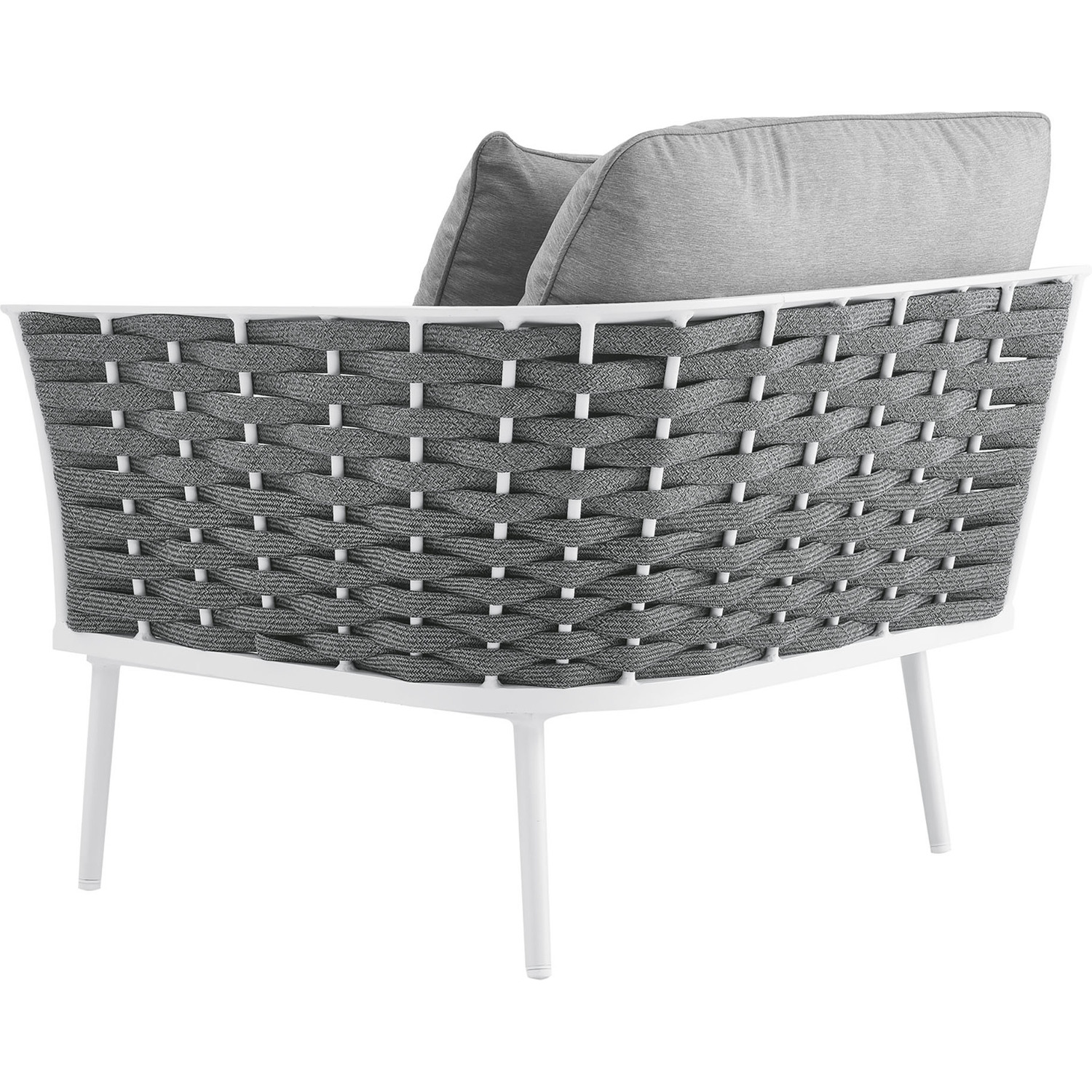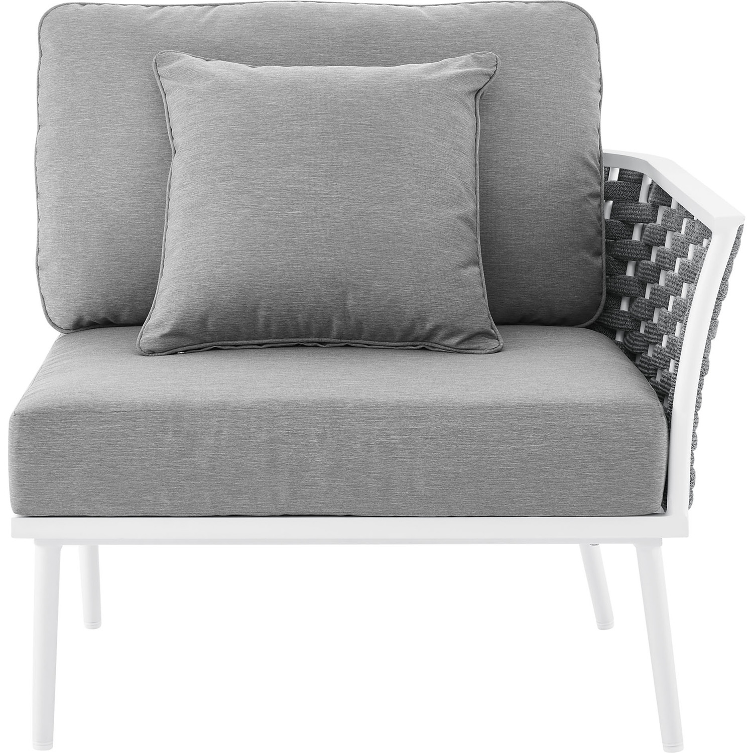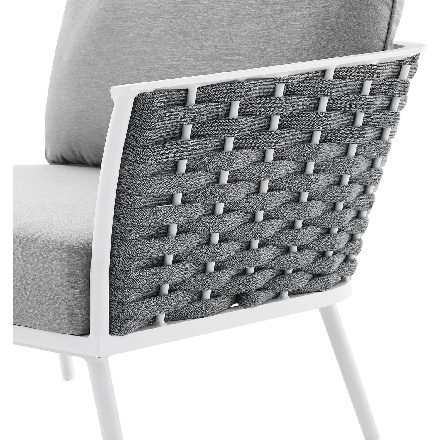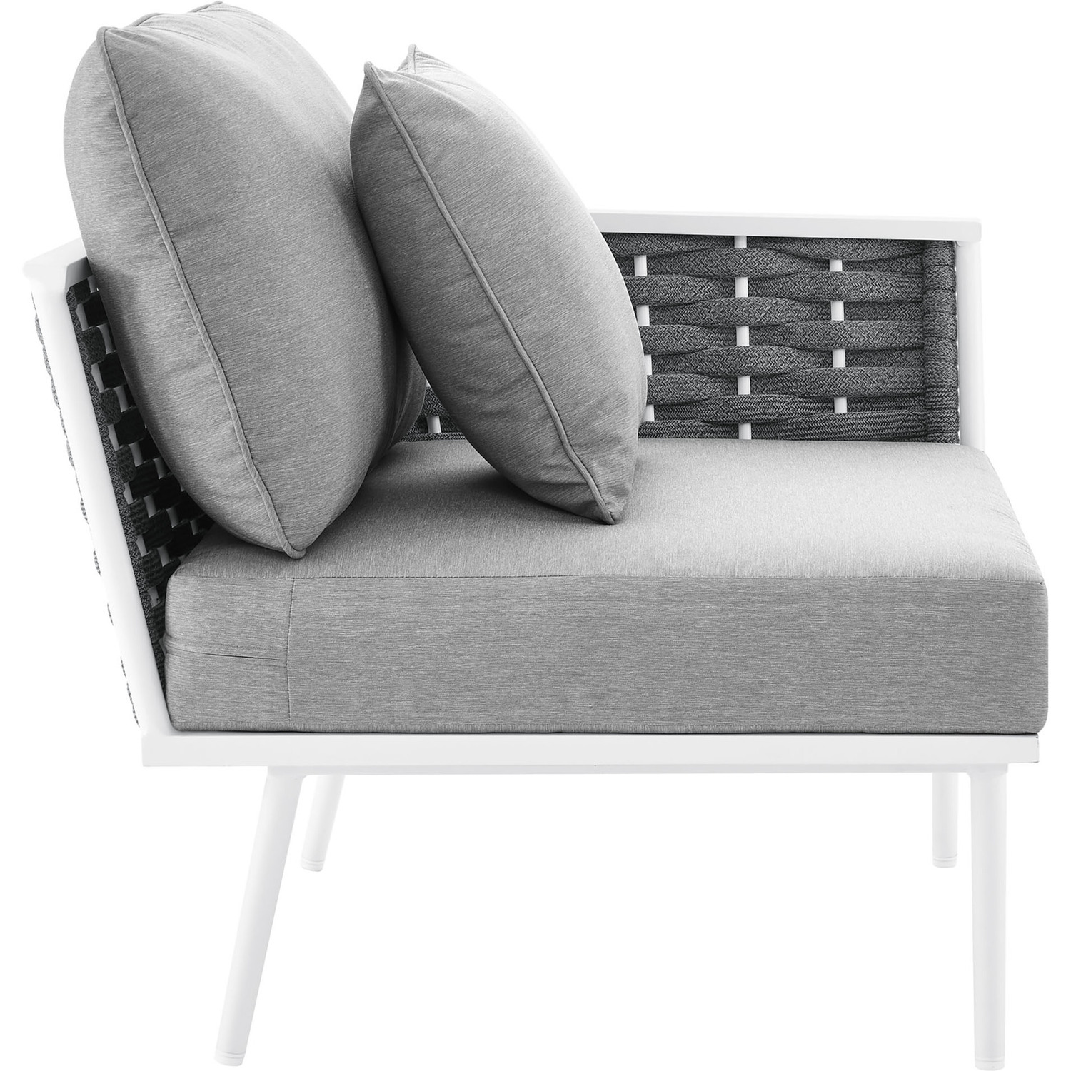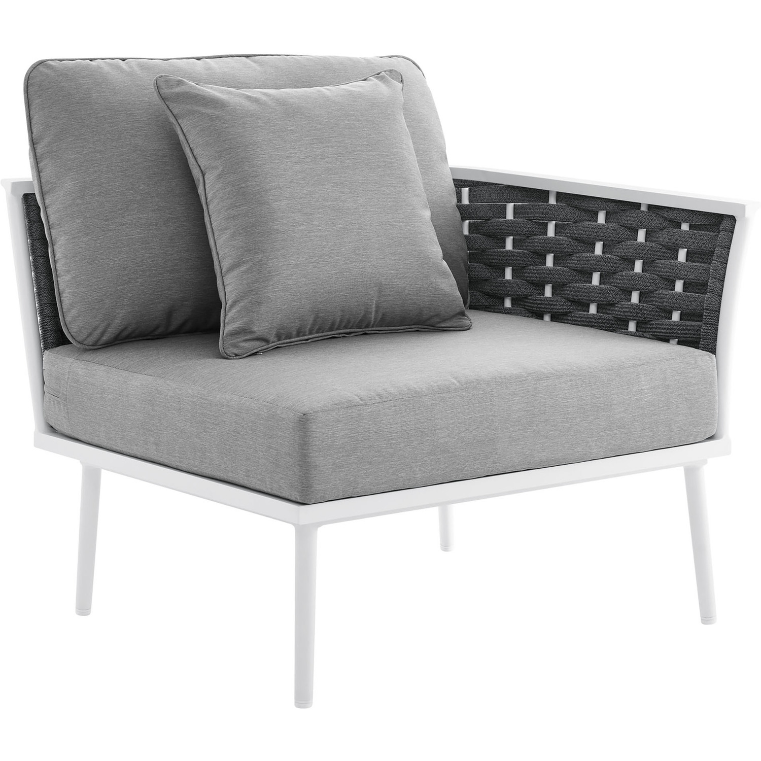 Gather family and friends for pleasant weather and good conversation with the Stance Outdoor Patio Right-Facing Armchair. Boasting a contemporary modern look, the Stance Right-Facing Armchair features a woven polyester fabric rope seat back and flared powder-coated aluminum frame, while water resistant all-weather fabric cushions with dense foam padding provide a relaxing spot to lounge. This is a versatile patio armchair designed for long-lasting durability. Each piece in the Stance Outdoor Collection can be mixed and matched and effortlessly arranged to fit the spontaneous needs of you and your guests. Stance includes non-marking, height-adjustable foot caps. Assembly Required. Armchair Weight Capacity: 331 lbs.Outdoor Patio Right-Facing Armchair