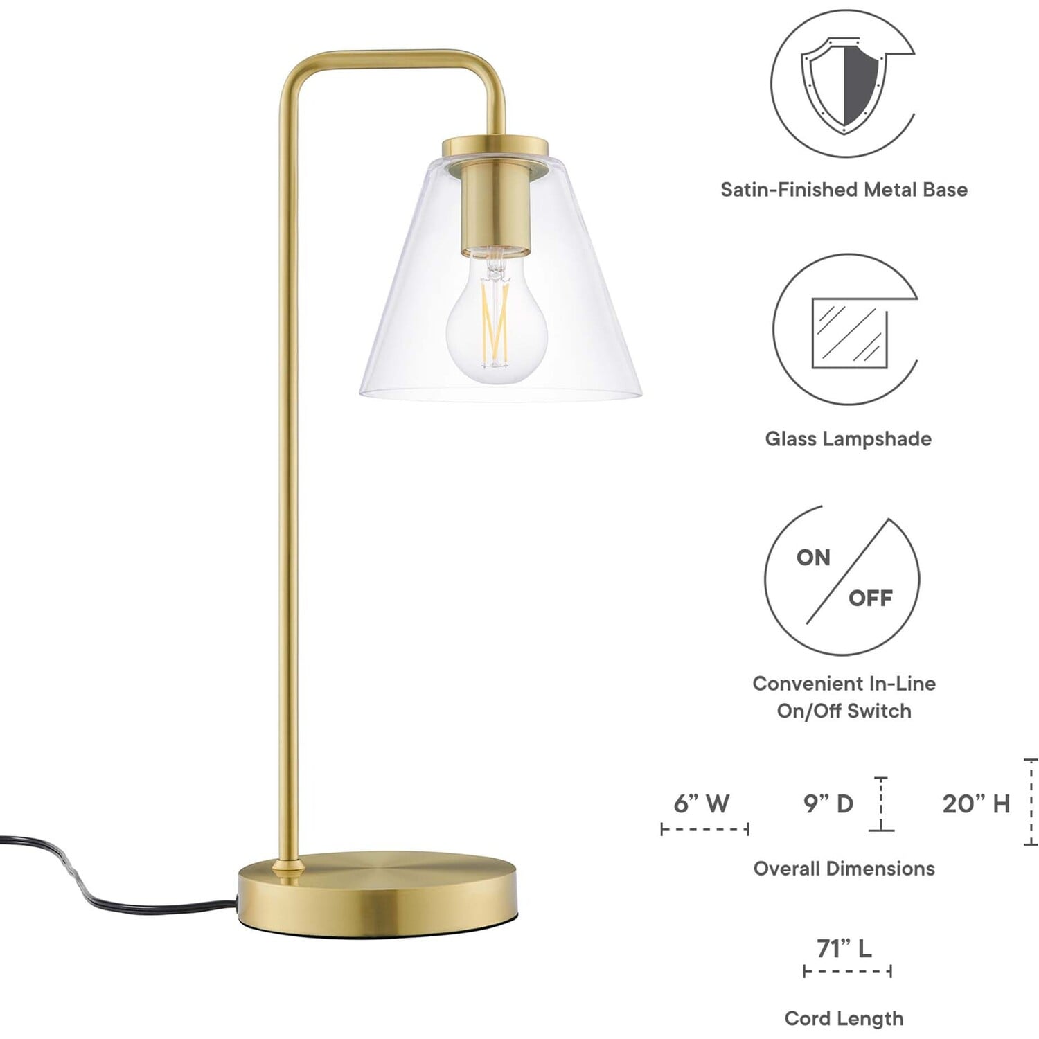 The Element Glass Table Lamp accentuates your home décor in the living room, bedroom, office, or study room with its distinctive mid-century modern aesthetic. This side table lamp brings farmhouse appeal to mid-century modern, contemporary, rustic, or eclectic decors, boasting a classic transparent glass cone shade. An ideal desk lamp for the home office, Element is solidly constructed with a bent-pipe arm and a round iron base. This dimmable coffee table lamp is equipped with a black power cord and a convenient on/off switch. Requires 1 E26 60W max bulb or LED equivalent (not included). Compatible with dimmer switches (not included). Assembly required. Clean with a soft, damp cloth.Transparent Glass