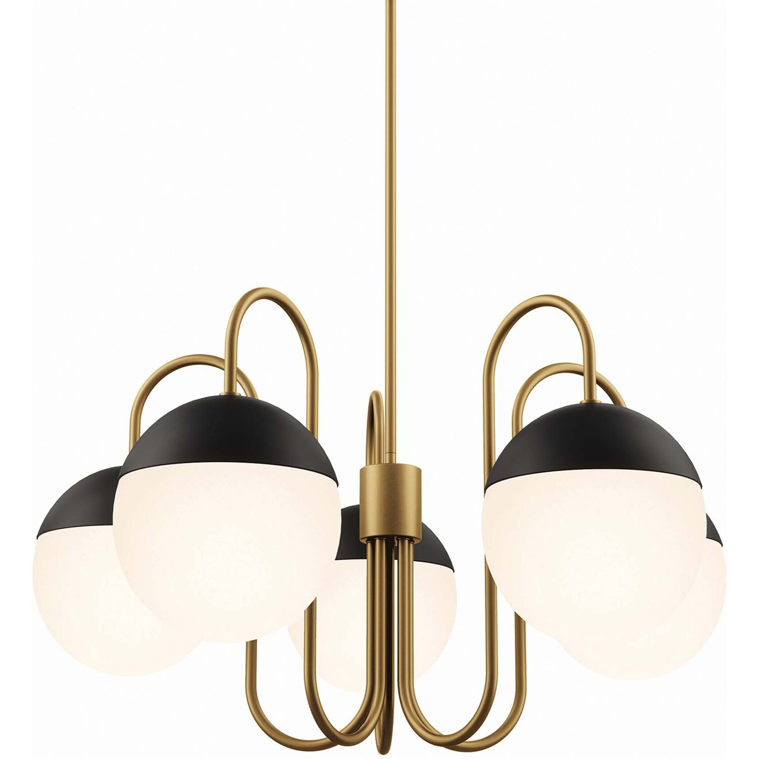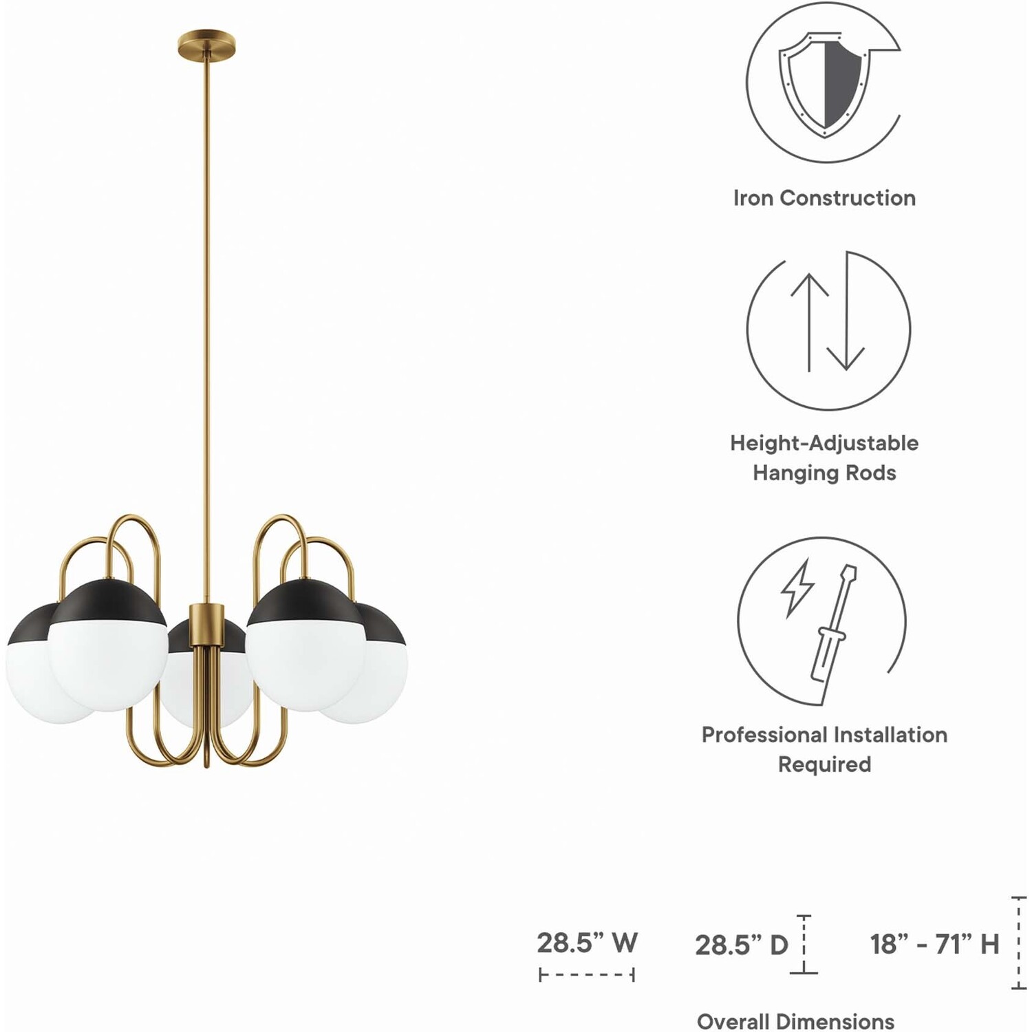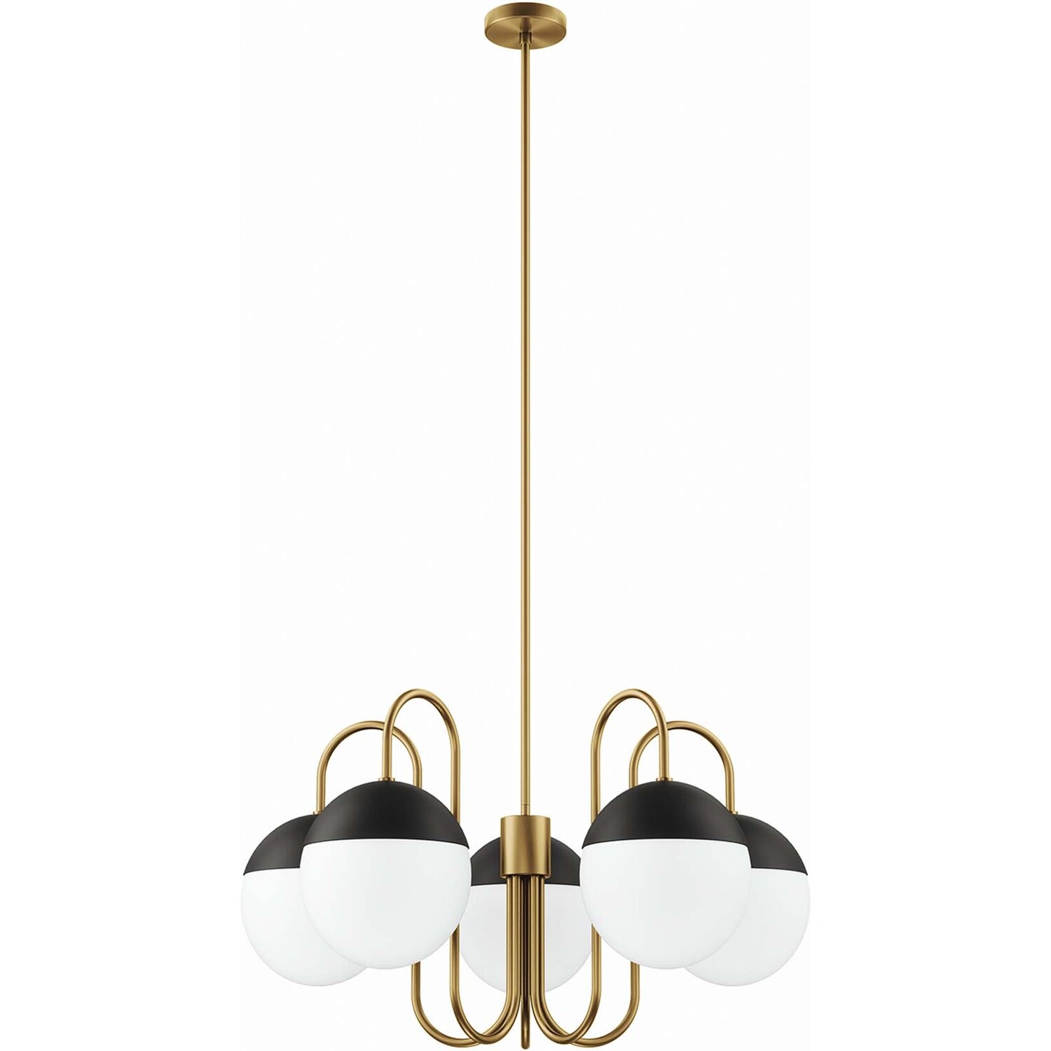 Cast a warm, ambient glow around your home or apartment with the Stellar 5-Light Chandelier. Adding contemporary charm to an entryway, kitchen, dining room, bedroom, office, or other living space, this spherical light fixture features frosted glass shades that attach to matte black metal bases. Compatible with sloped ceilings, Stellar has a ceiling canopy with a swivel adaptor and features a five piece, height-adjustable hanging rod to suit a range of ceiling heights. This ceiling pendant requires five E26 bulbs 60W max or LED equivalent (not included). UL Listed for Damp Locations. Luminaires that are “Suitable for Damp Locations” are approved for areas that are regularly exposed to moisture and condensation like the bathroom. Professional installation required.Modern 5-Light Chandelier