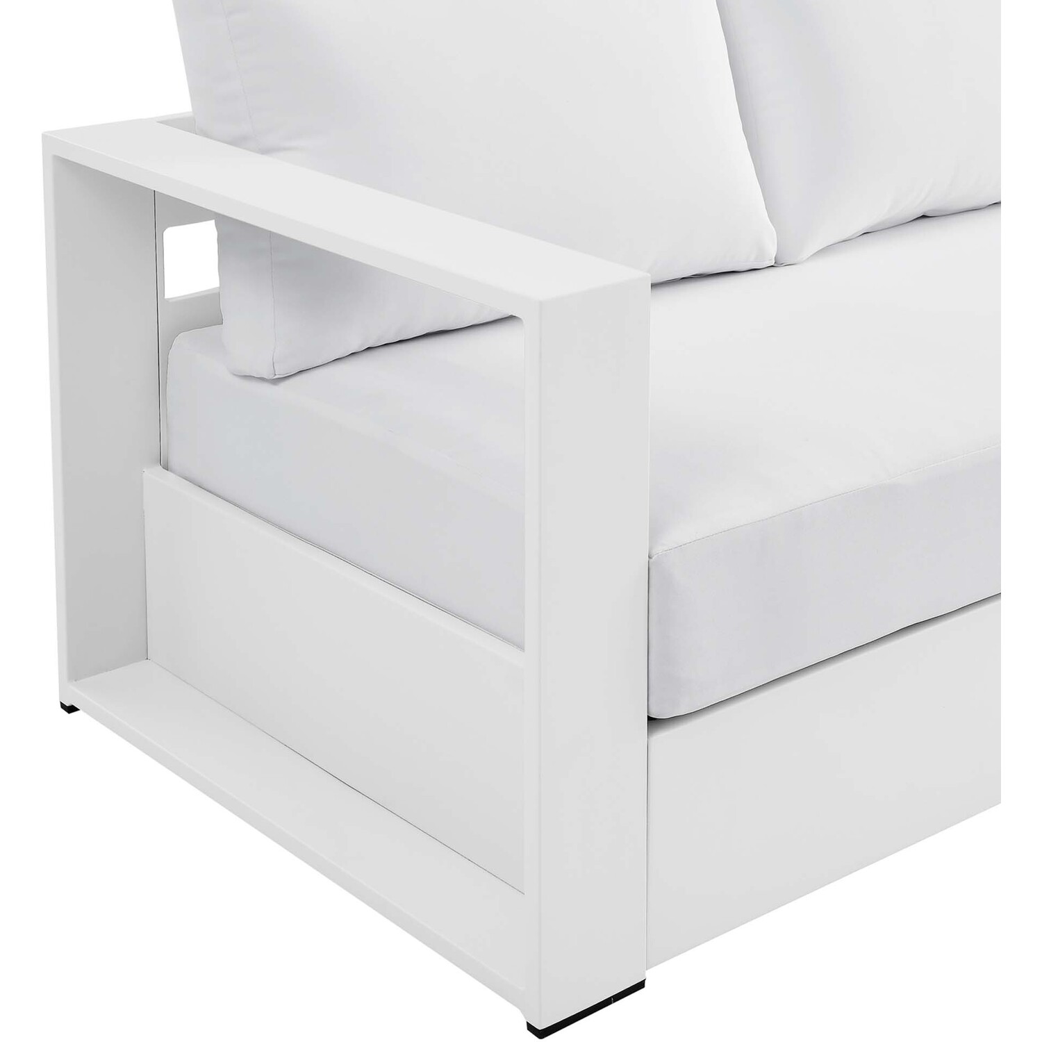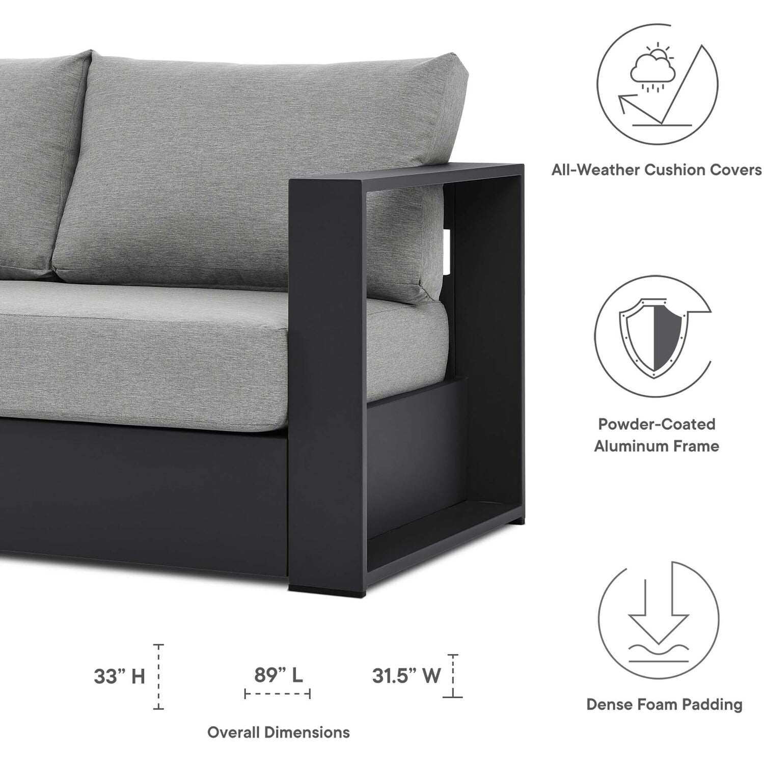 Enliven your alfresco spaces with the Tahoe Aluminum Outdoor Patio Sofa. This modern outdoor sofa is constructed with well-crafted, durable powder-coated aluminum, dispensing contemporary elegance in all your outdoor lounge spaces. Tahoe is perfect for poolside lounging with a sunproof, water-resistant fabric-covered seat and back cushions. The removable, stain-resistant cushions render this outdoor sofa low maintenance and high performing. This poolside sofa thrills with dense foam padding for sustaining comfort before and after a dip. Tahoe makes an accommodating weatherproof patio sofa for al fresco daydreaming. This durable outdoor sofa features non-marking foot glides to protect your deck or patio floor and comes with easy-to-follow assembly instructions. Weight Capacity: 993 lbs.Outdoor Patio Sofa