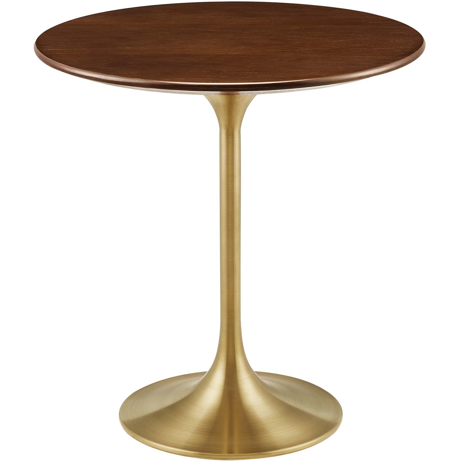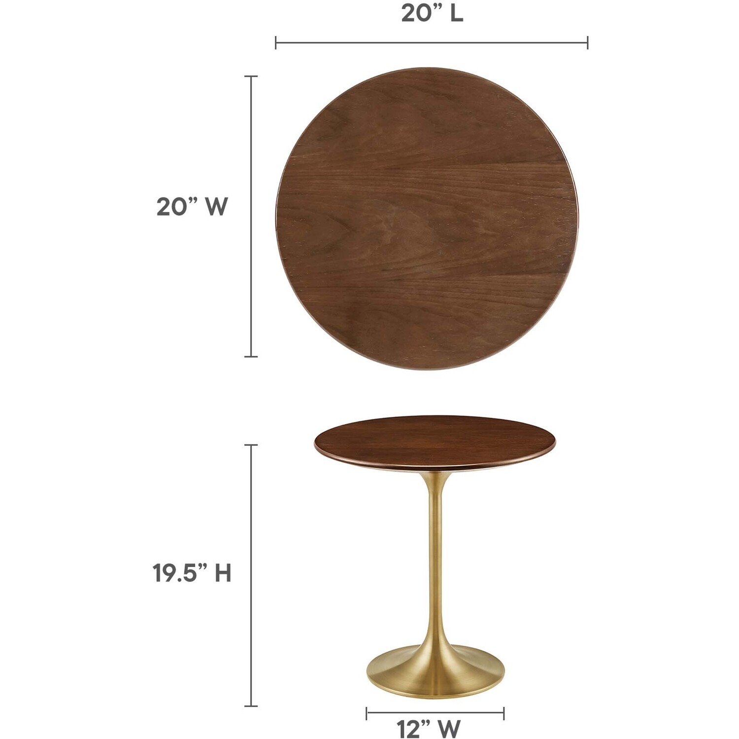 Let modern inspiration flow from the Lippa 20" Wood Grain Round Side Table. This pedestal table is perfect for the living room, office, lounge area, or entryway. Its round tabletop is crafted with MDF and wood grain veneer with a beveled edge for a contemporary yet timeless design. Embodying an iconic mid-century silhouette, this pedestal dining table floats on a sleek tapered metal pedestal base with a chip-resistant brushed gold finish. Includes non-marking felt pad to protect flooring. Assembly required.Modern Side Table