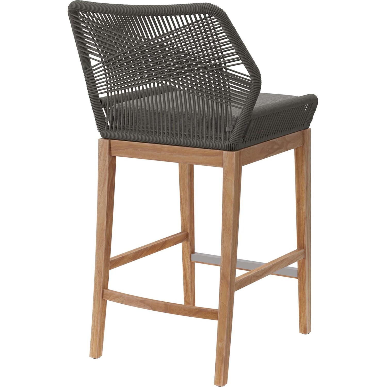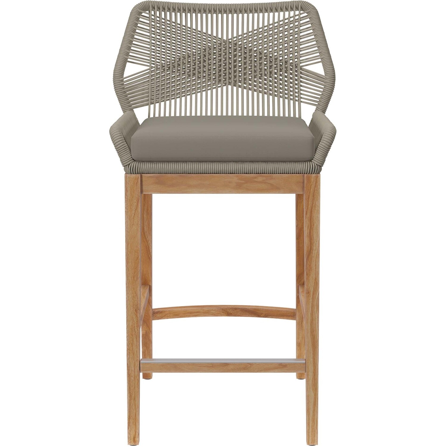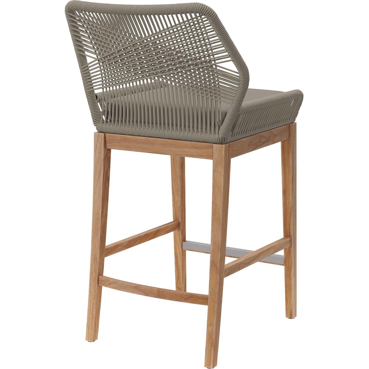 Relax amidst friends and family as you enjoy a meal al fresco with the Wellspring Outdoor Patio Bar Stool. Wellspring brings contemporary modern aesthetics to a backyard, porch, patio, or poolside with it's calming colors, organic wood grain, woven rope detail on the aluminum seat frame, and a crisscross pattern along the backrest. Featuring a premium solid teak wood base with stretchers and non-marking foot pins to protect flooring, this patio bar stool boasts a removable cushion with dense foam padding and ties to ensure a secure seat. It's versatile design makes it a stylish addition indoors too. Assembly required. Weight Capacity: 220 lbs.Outdoor Patio Bar Stool
