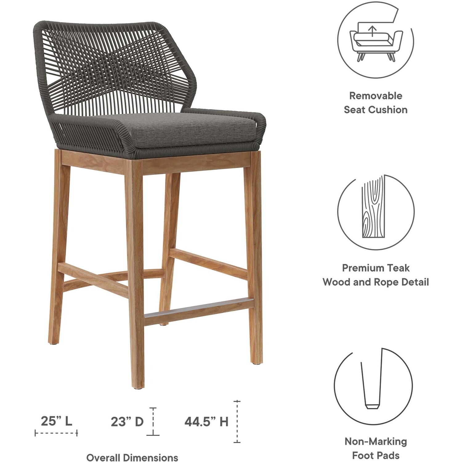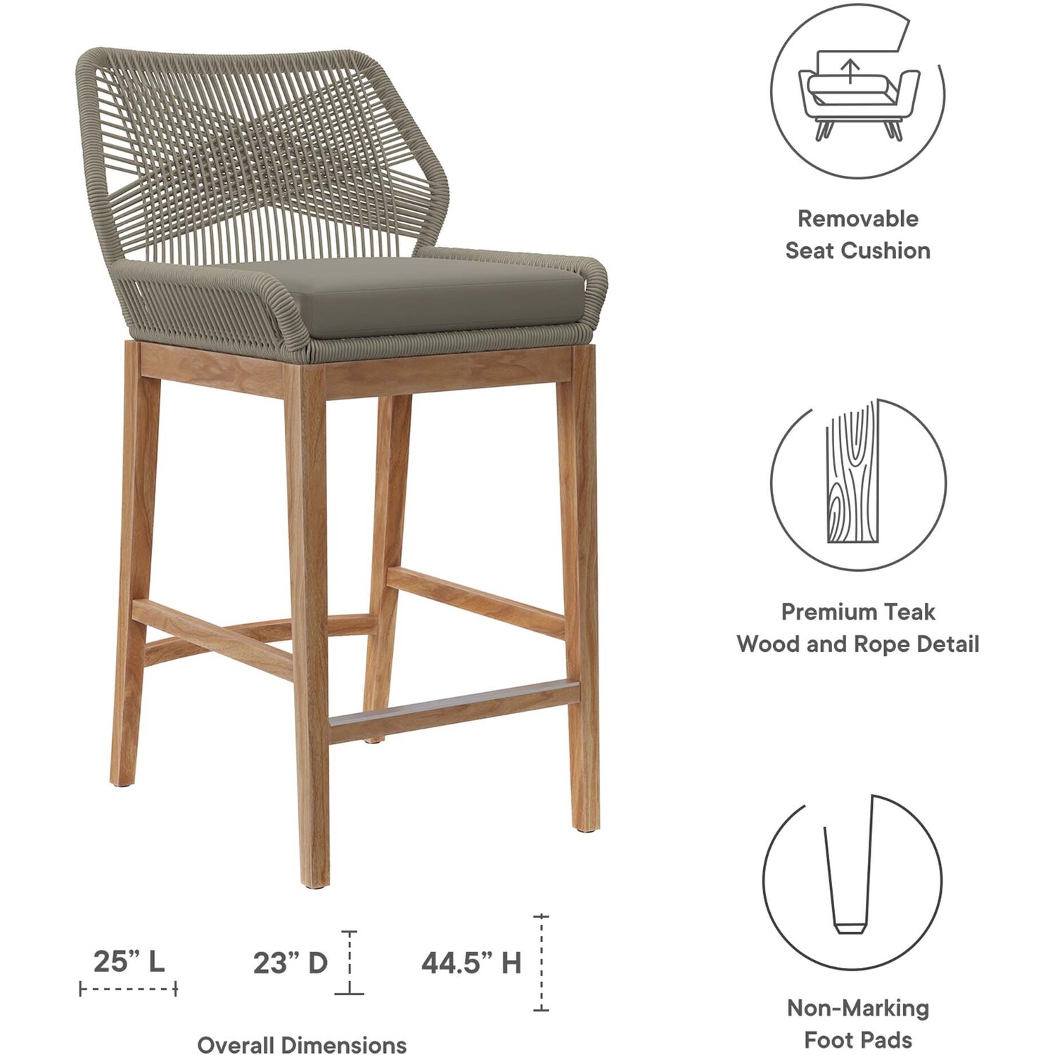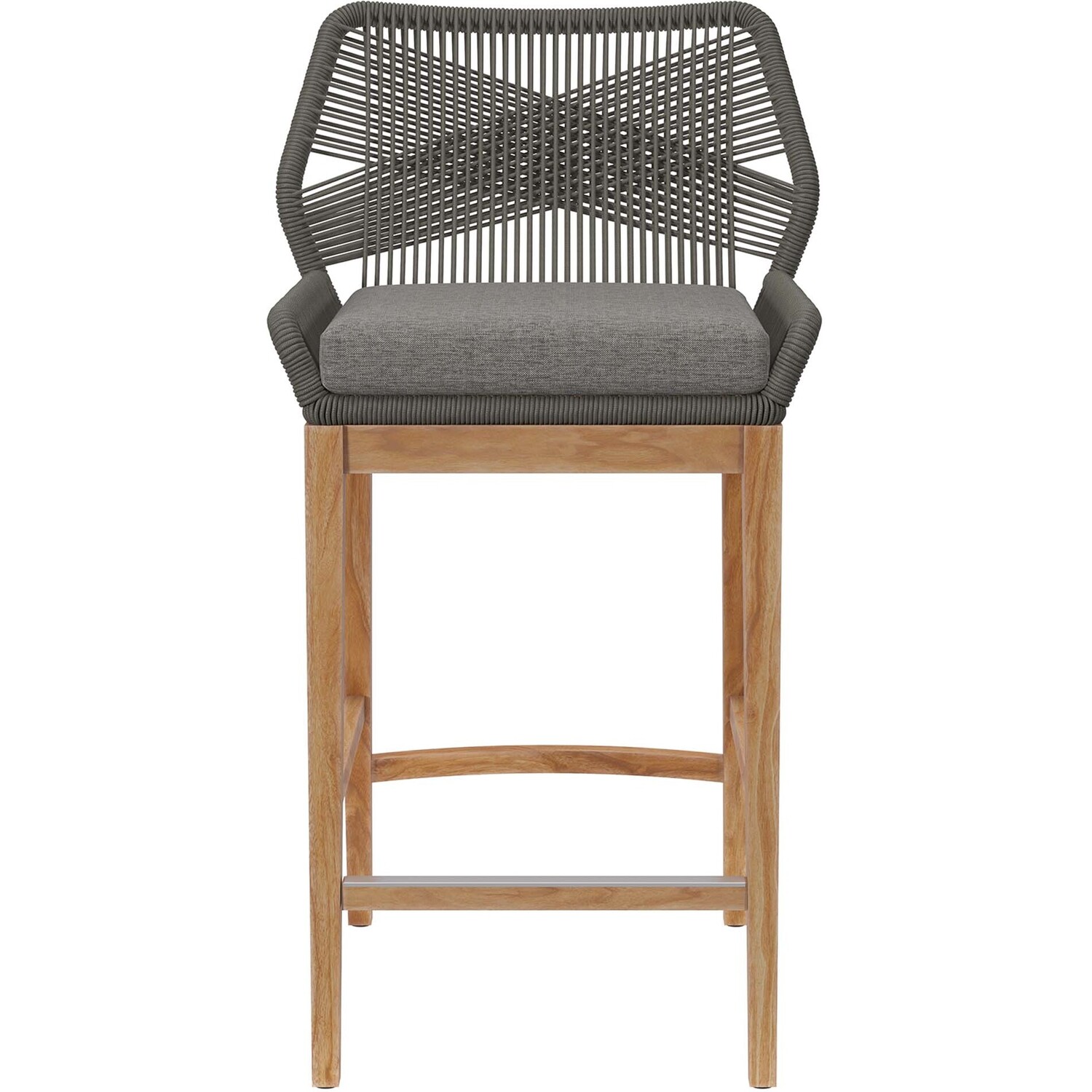 Relax amidst friends and family as you enjoy a meal al fresco with the Wellspring Outdoor Patio Bar Stool. Wellspring brings contemporary modern aesthetics to a backyard, porch, patio, or poolside with it's calming colors, organic wood grain, woven rope detail on the aluminum seat frame, and a crisscross pattern along the backrest. Featuring a premium solid teak wood base with stretchers and non-marking foot pins to protect flooring, this patio bar stool boasts a removable cushion with dense foam padding and ties to ensure a secure seat. It's versatile design makes it a stylish addition indoors too. Assembly required. Weight Capacity: 220 lbs.Outdoor Patio Bar Stool