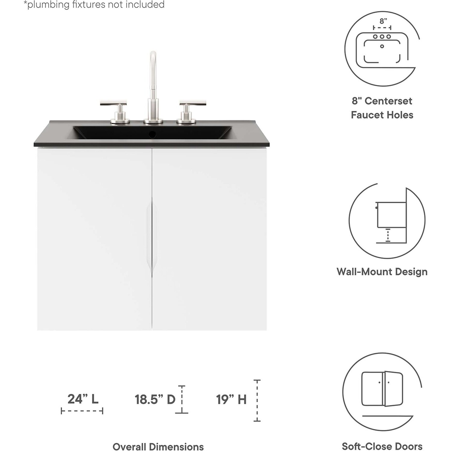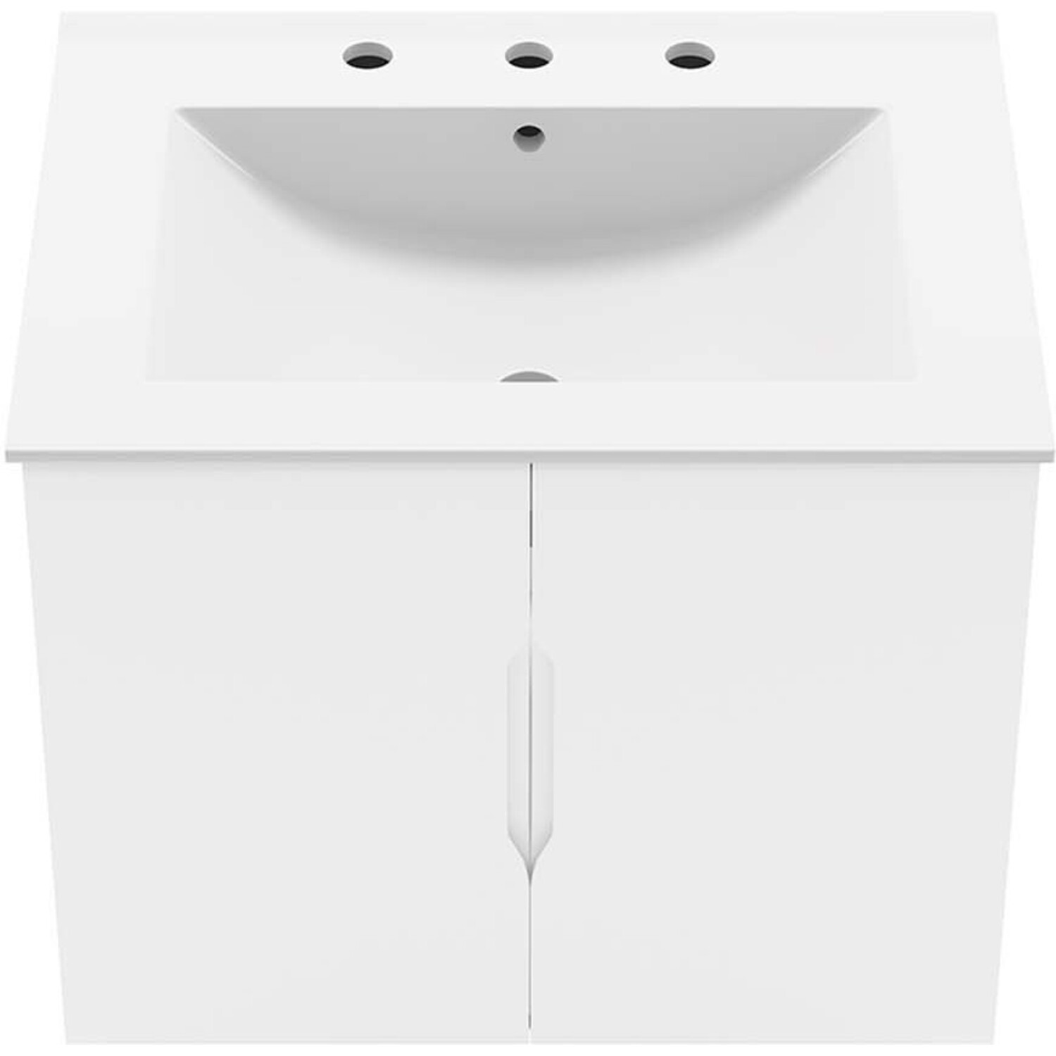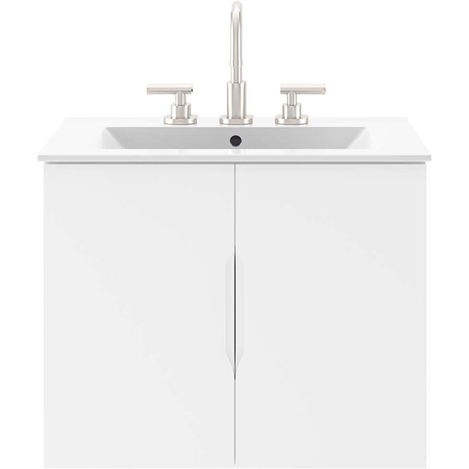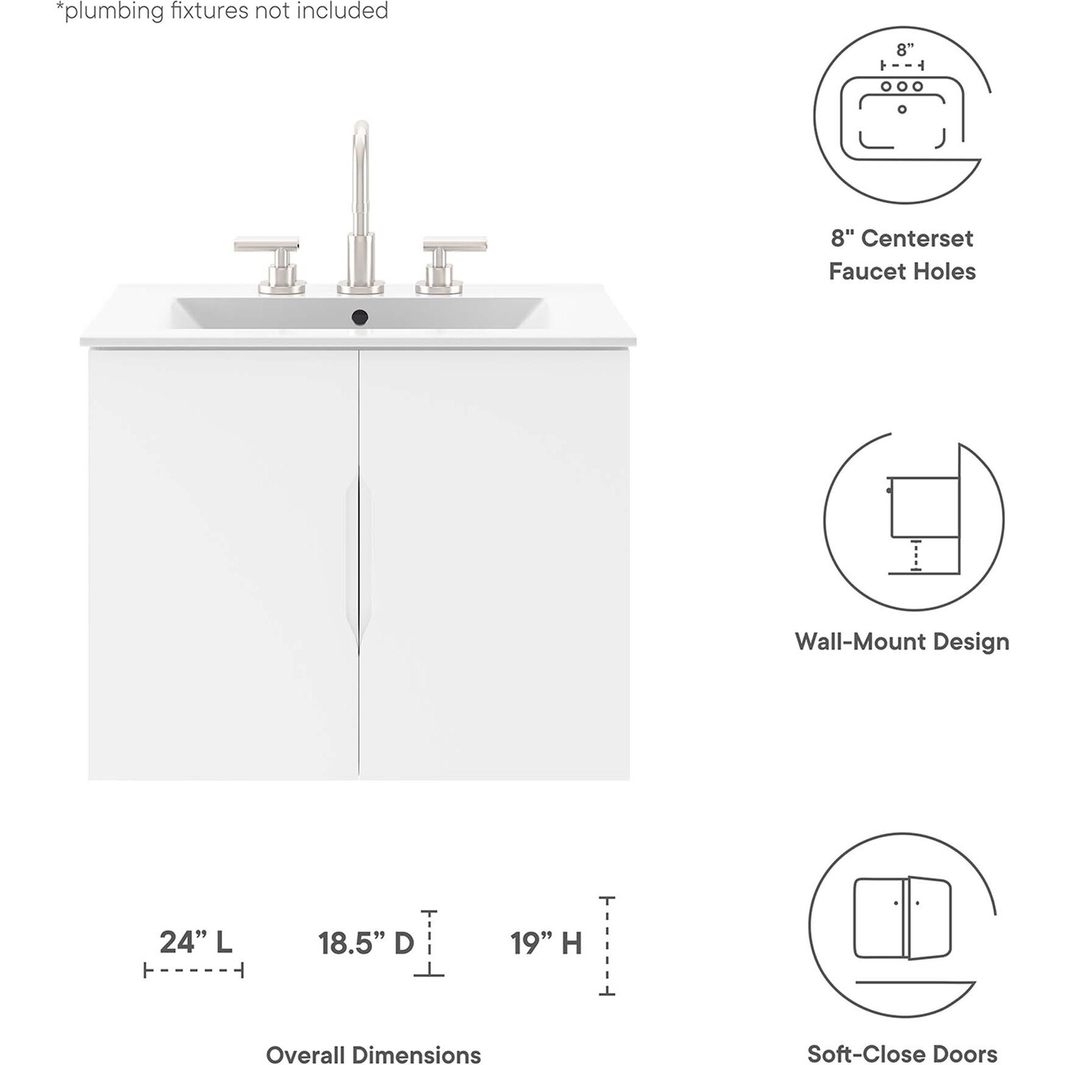 Energize your bathroom space with the modern design of the Vitality 24" Wall-Mount Bathroom Vanity. Boasting a sleek, clean-lined silhouette, this vanity is durably crafted with particleboard and MDF with a melamine finish. This vanity features a wall-mount design and is complete with ample storage space for all your bathroom essentials behind two soft-close doors. This vanity is complete with a ceramic sink basin with 8-inch centerset faucet holes and an integrated countertop. Organize bathroom essentials and keep counter space clean with ample storage space behind two soft-close doors. This vanity boasts an open back to accommodate plumbing. Fixtures not included. Assembly required.Modern Bathroom Vanity