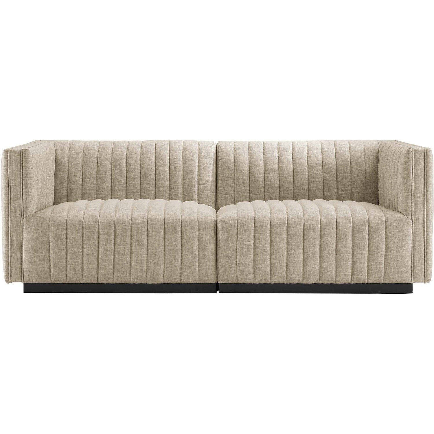 Modern appeal surrounds the Conjure Channel Tufted Upholstered Fabric Loveseat. Soft and durable fabric upholstery covers dense foam padding and an individually wrapped spring coil system for a supportive living room loveseat that will become the go-to lounge spot for family and friends. Vertical channel tufting and subtle French piping adds depth to this vintage inspired sectional sofa that effortlessly becomes the focal point in your living room. Solidly constructed from wood and plywood, this loveseat features non-marking foot caps and boasts a matte black base. Versatile and elegant, this sectional sofa loveseat is ideally suited for a variety of decor styles in your living room, lounge, or home office. Each Seat Weight Capacity: 331 lbs.Channel Tufting Details