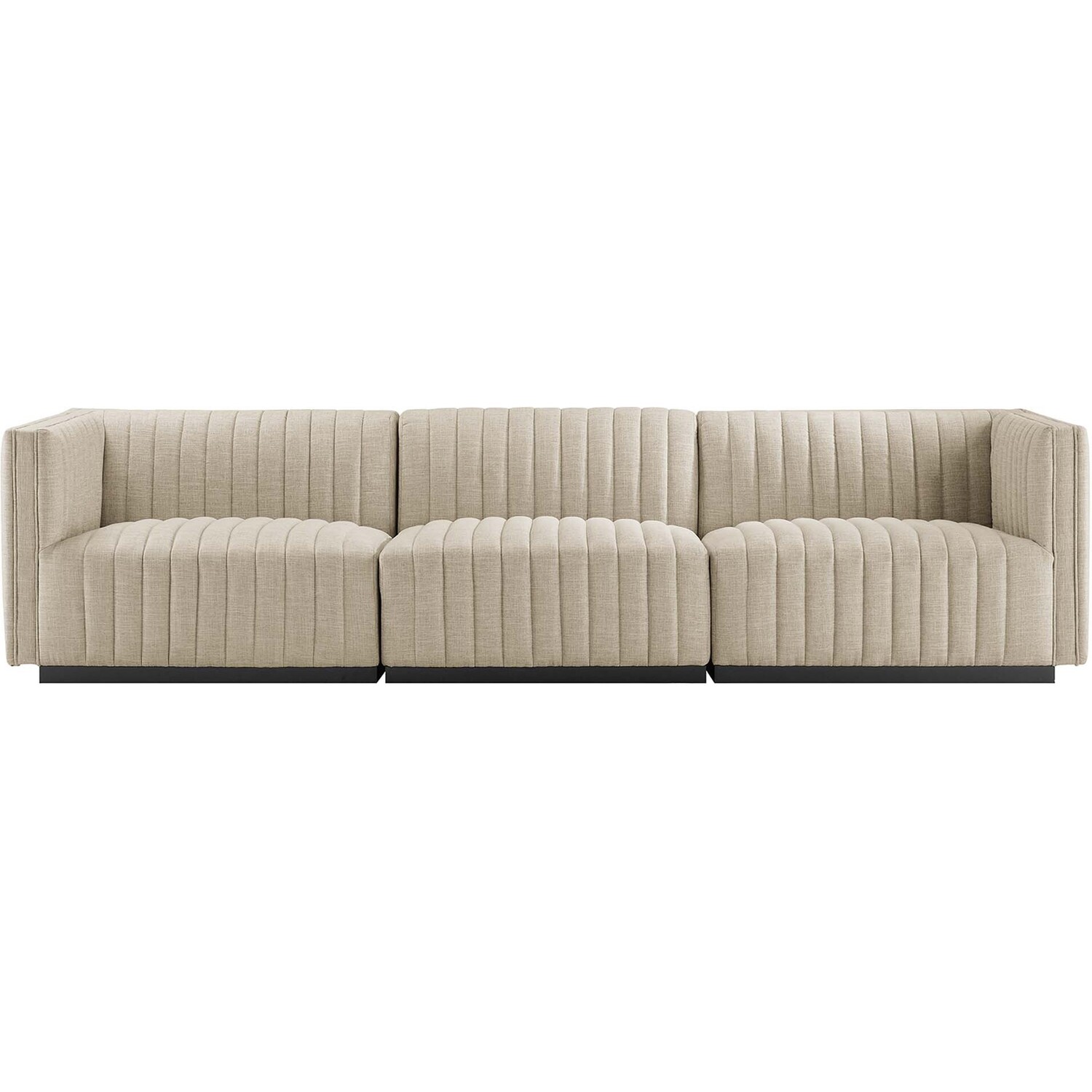 Modern appeal surrounds the Conjure Channel Tufted Upholstered Fabric Sofa. Soft and durable fabric upholstery covers dense foam padding and an individually wrapped spring coil system for a supportive living room sofa that will become the go-to lounge spot for family and friends. Vertical channel tufting and subtle French piping adds depth to this vintage inspired sectional sofa that effortlessly becomes the focal point in your living room. Solidly constructed from wood and plywood, this sofa features non-marking foot caps and boasts a matte black base. Versatile and elegant, this sectional sofa is ideally suited for a variety of decor styles in your living room, lounge, or home office. Each Seat Weight Capacity: 331 lbs.Channel Tufting Details