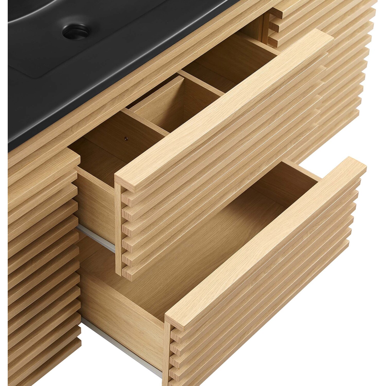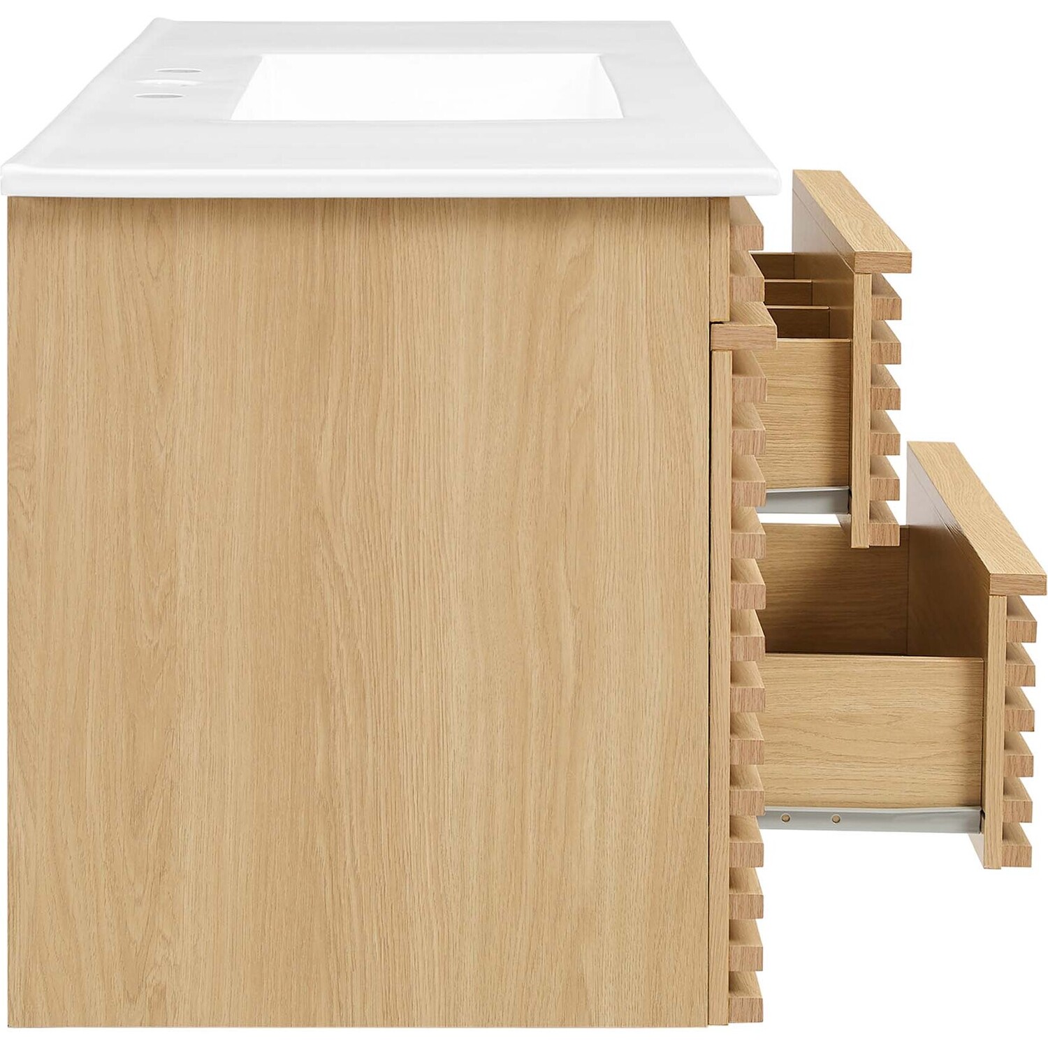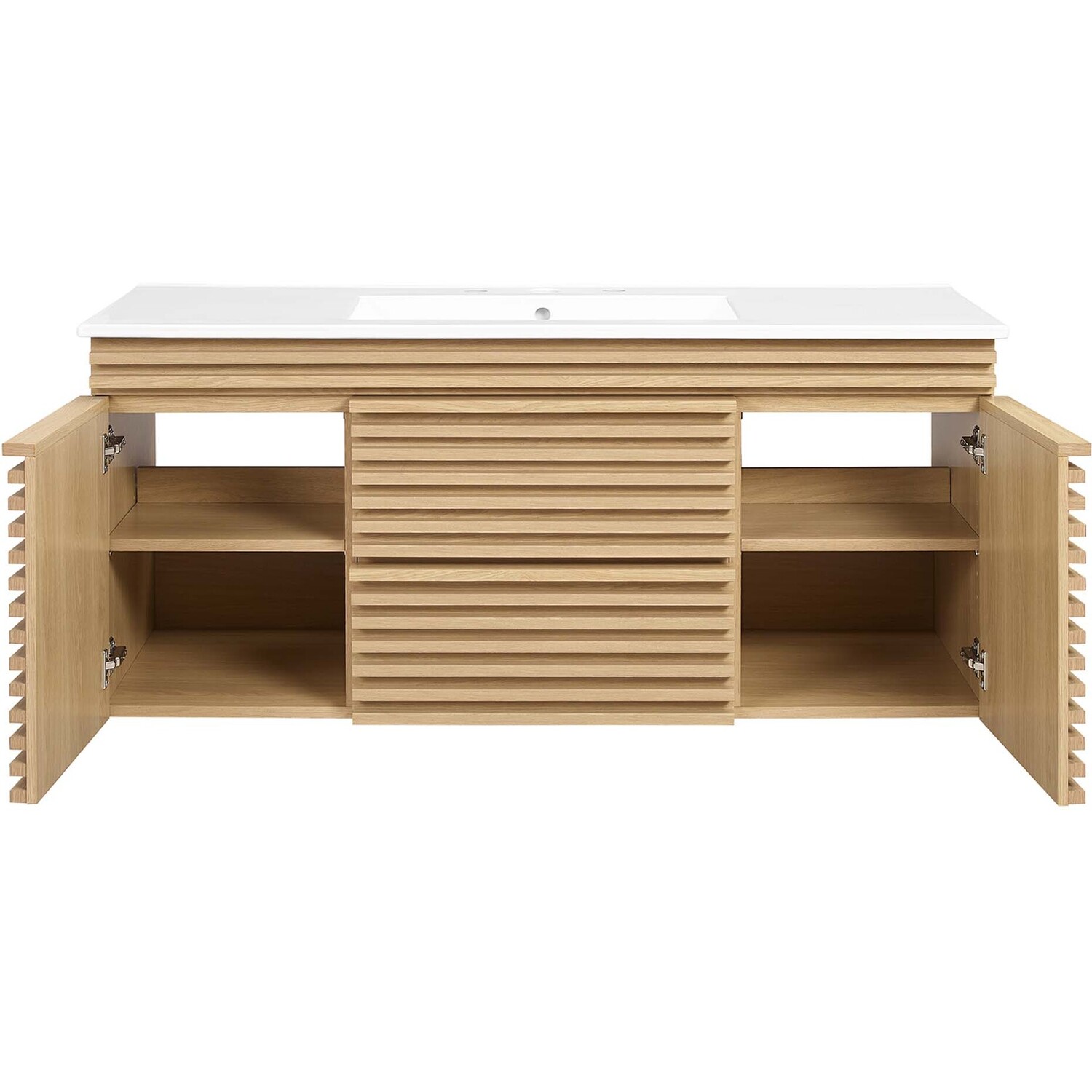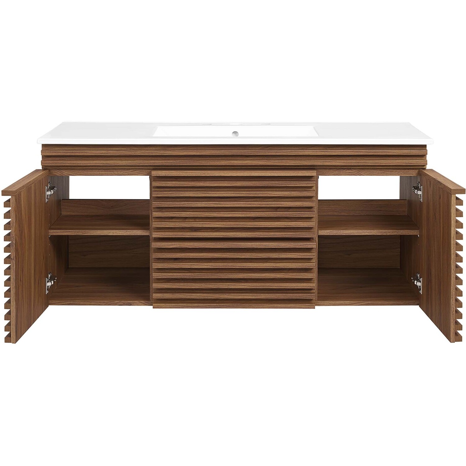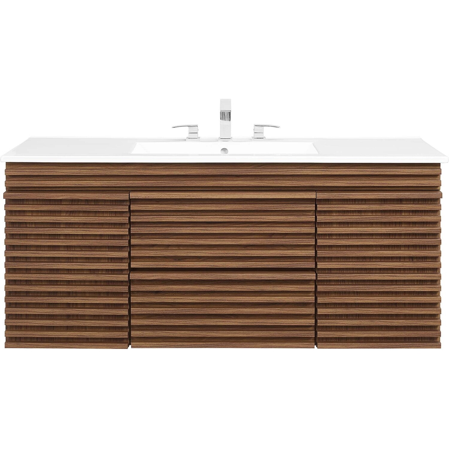 Tap into mid-century aesthetics with the Render Vanity. The Render 48" Single Sink Bathroom Vanity features a durable MDF and particleboard frame with a smooth laminate, ample storage space in two full-extension drawers, adjustable shelves behind soft-close hinged doors, and a space-saving wall-mount design. A curved ceramic basin with an integrated countertop and 8" centerset faucet holes creates sleek lines and a crisp design for an edgy look designed to meet your needs. Boasting a mid-century modern style this vanity features a solid construction with a pleasing look and practical functionality. Assembly required. Fixtures not included.Mid-Century Modern Vanity